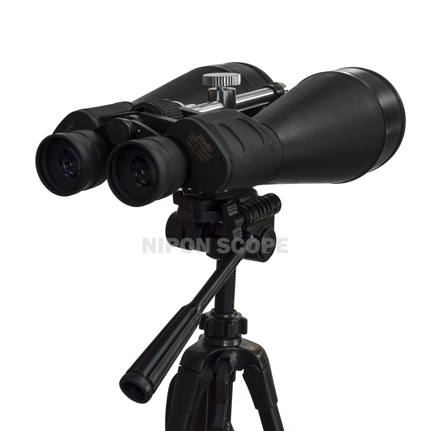 Package includes: Nipon 20×80 binoculars with built in tripod adapter, lens caps, lens cleaning cloth, neck strap; soft carry case with shoulder strap, user manual, and a large heavy duty full size aluminium alloy tripod.