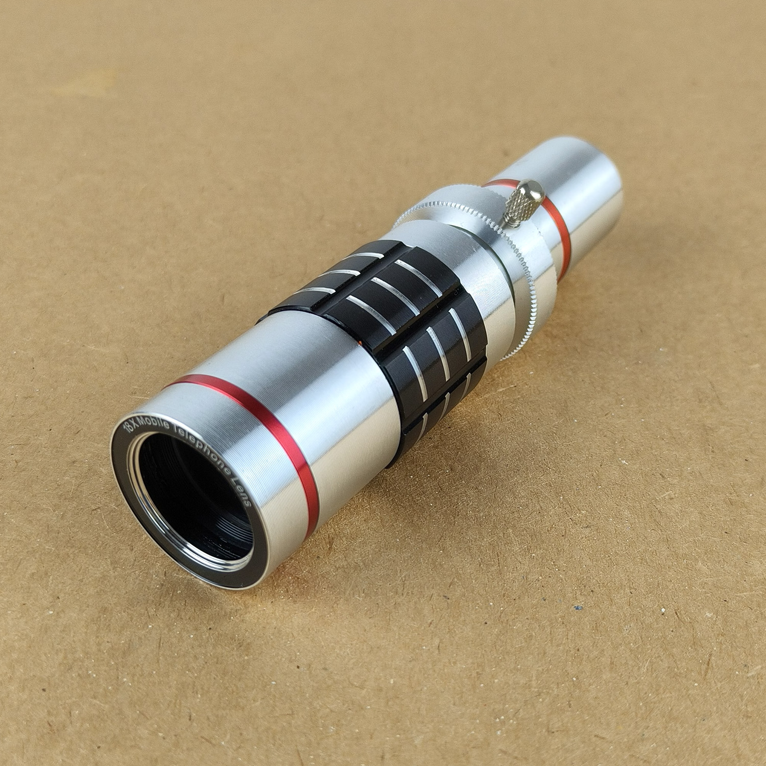 This is an 18× telephoto lens for mobile phones, marked on the front as “18x Mobile Telephone Lens”. It is designed to attach to a smartphone camera to provide optical zoom, functioning like a small monocular telescope for mobile photography and video.
