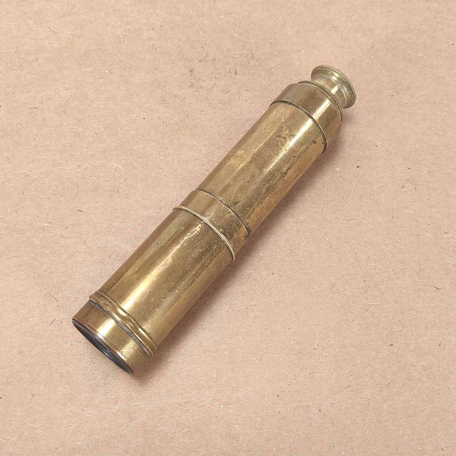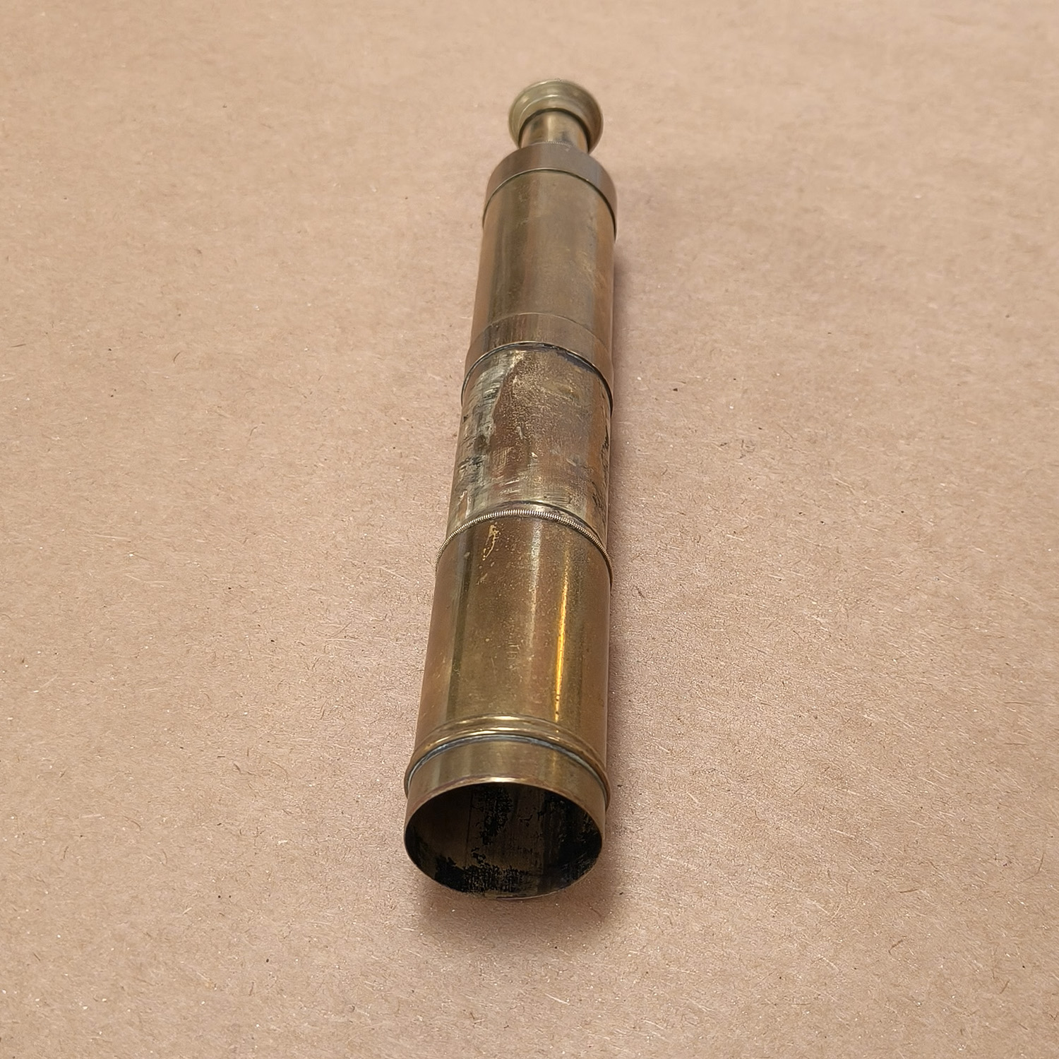 The brass tubes show honest antique condition throughout, with heavy patina, wear, and surface marks consistent with age and handling. The surface has not been modernly polished, preserving the original finish. Some minor age-related marks are also visible on the glass.