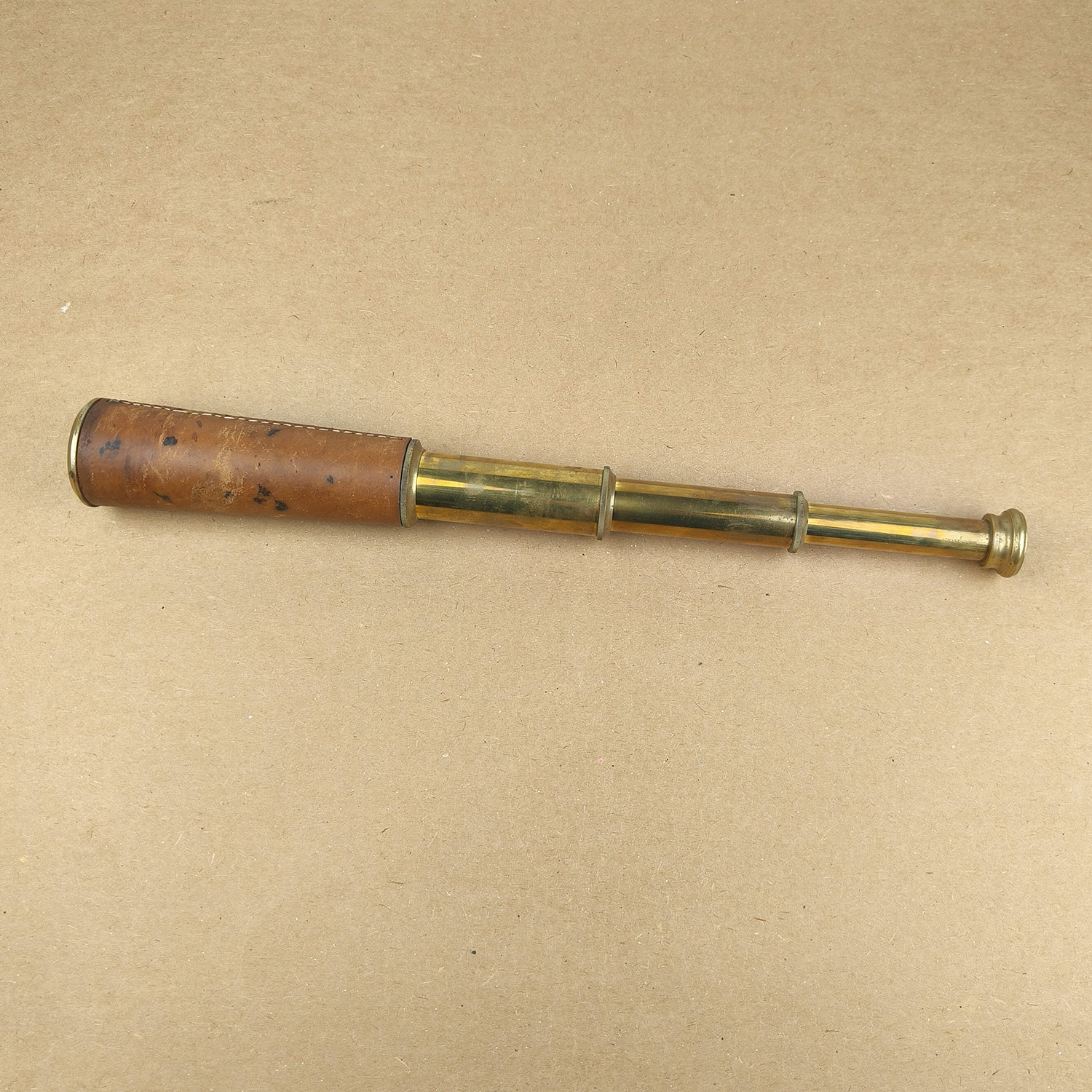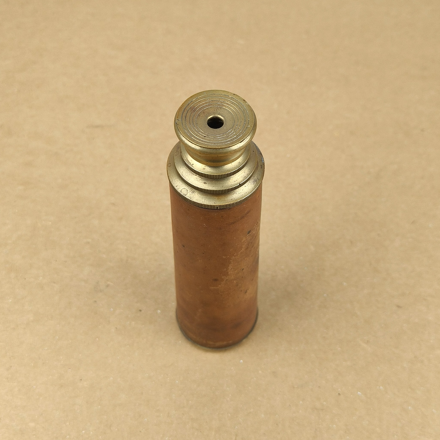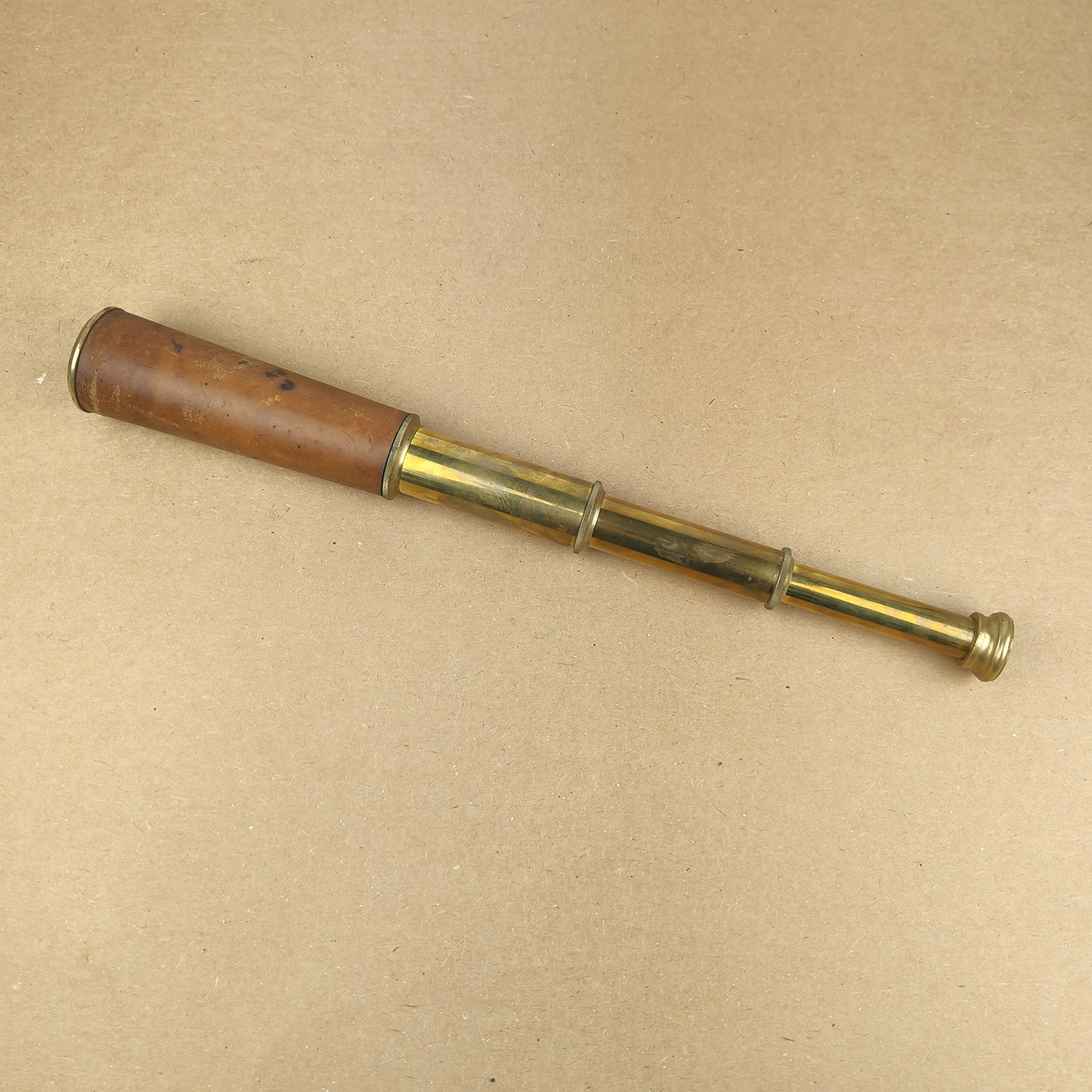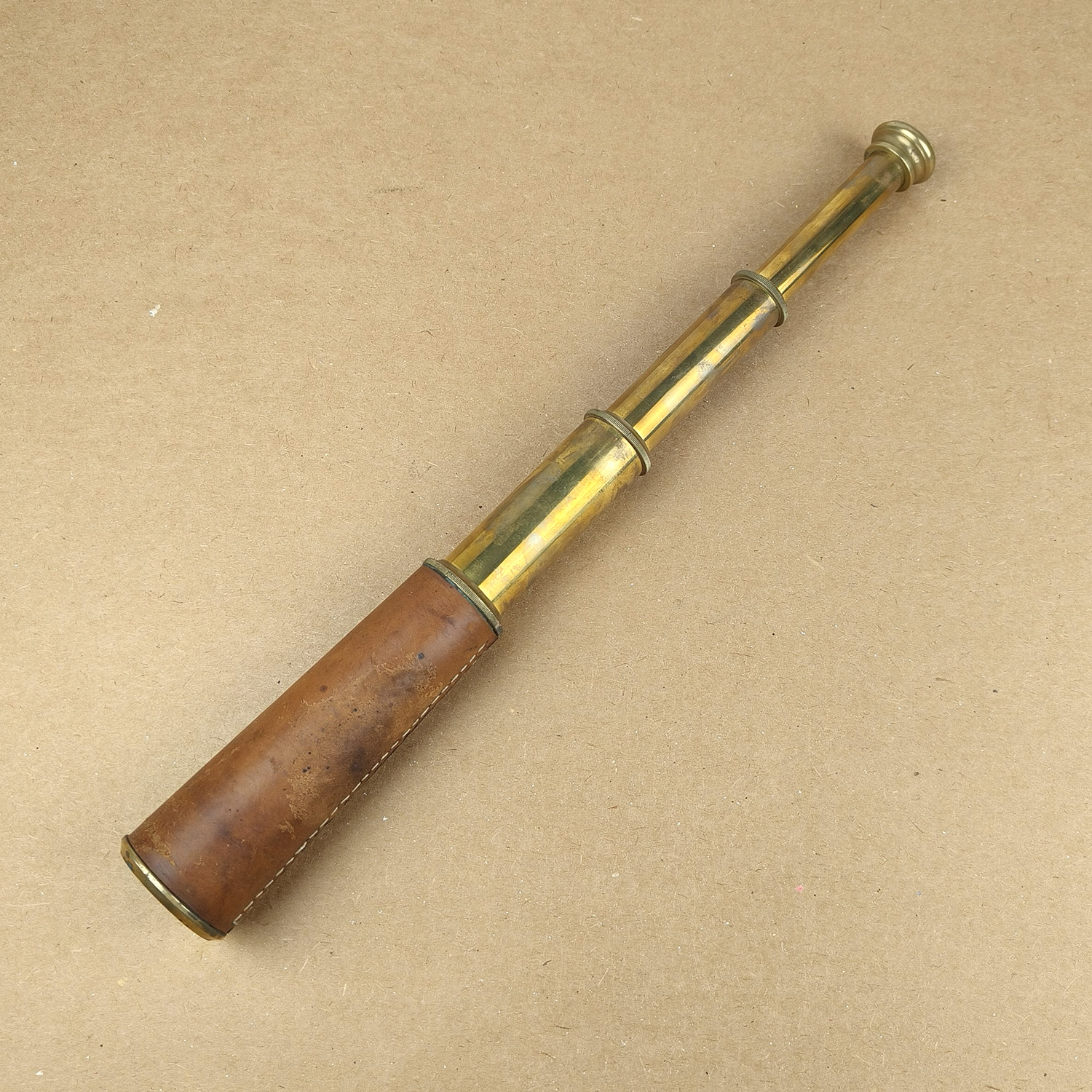 The telescope features a brass draw-tube construction with a stitched leather-covered hand grip. When extended, all three draws slide smoothly and hold position well. Optics show age-related wear but remain intact and clean, producing a usable image consistent with a genuine period instrument.