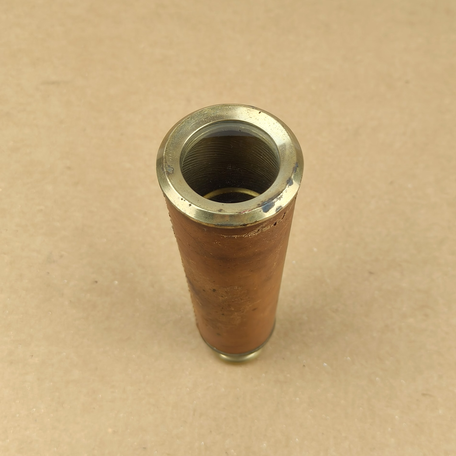 The brass shows an attractive natural patina developed over time, with surface marks and discoloration commensurate with age. The leather grip is intact with visible wear and darkening, adding to the authentic character of the piece. Maker’s marking is clearly visible on the draw tube, as shown in the photographs.
