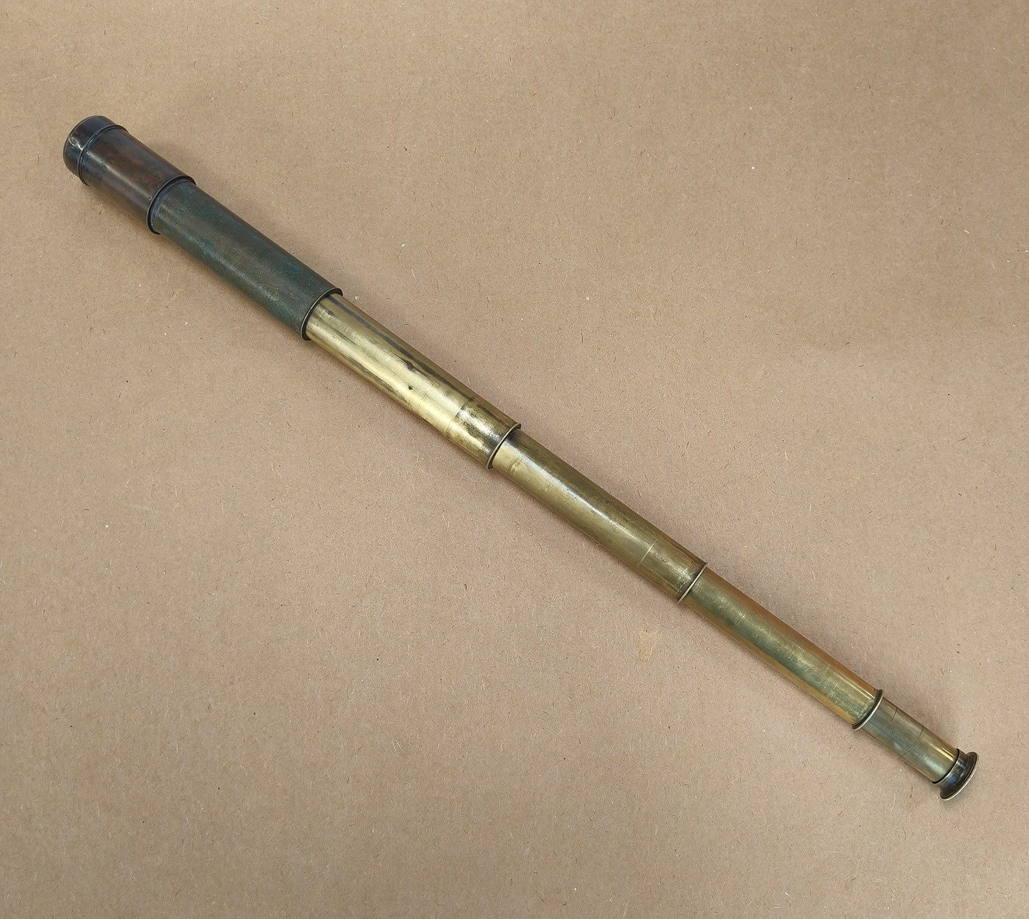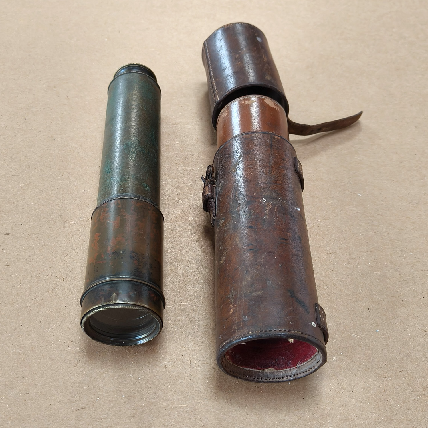 Physical condition: Honest cosmetic wear and surface marks from age and use. Natural patina to the brass throughout, but no obvious dents to brass tubes. Movement of the draw tubes is smooth. Original leather case included, showing age-related wear but structurally sound. One end of the leather case is open, with the end cap missing.