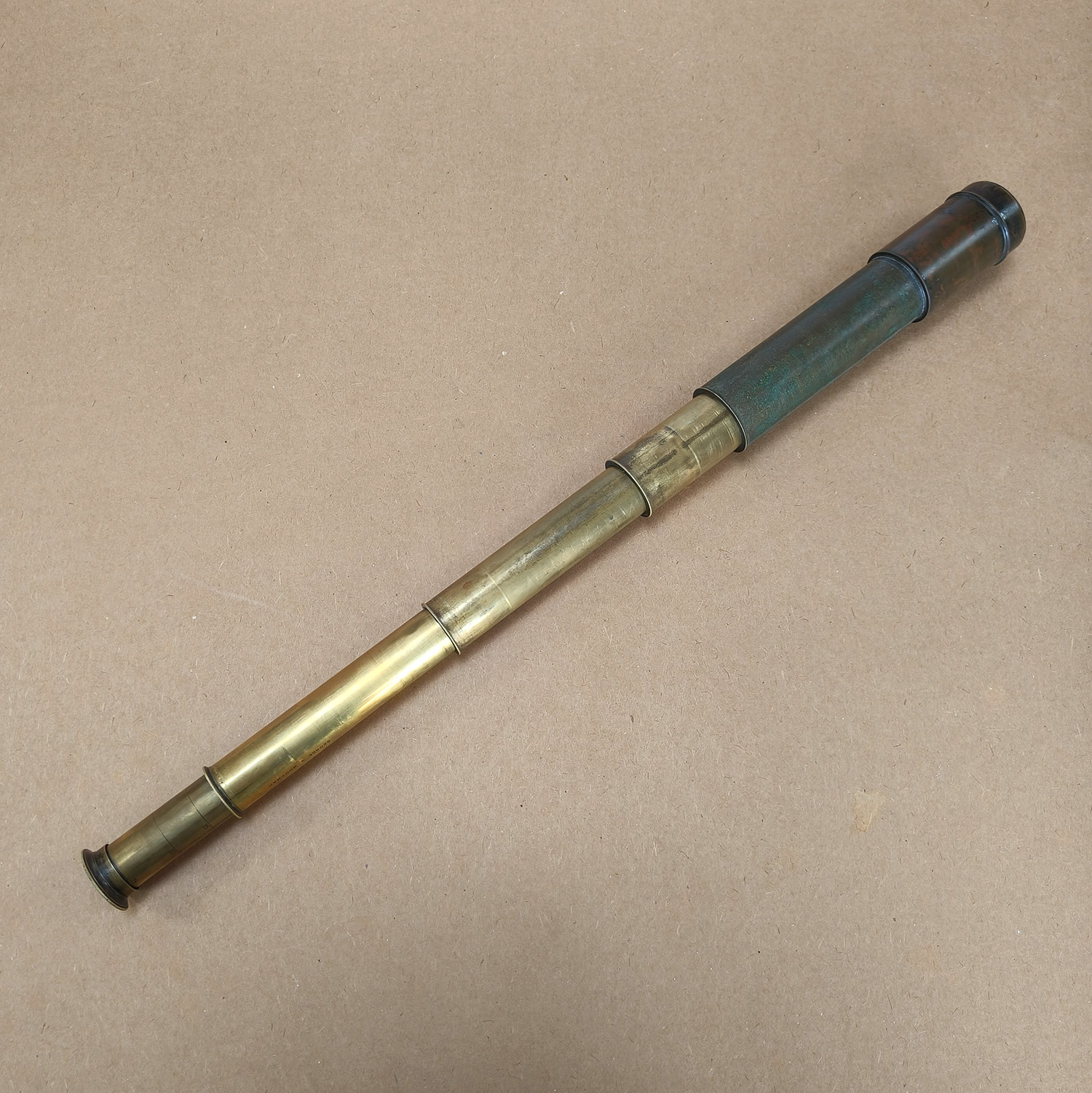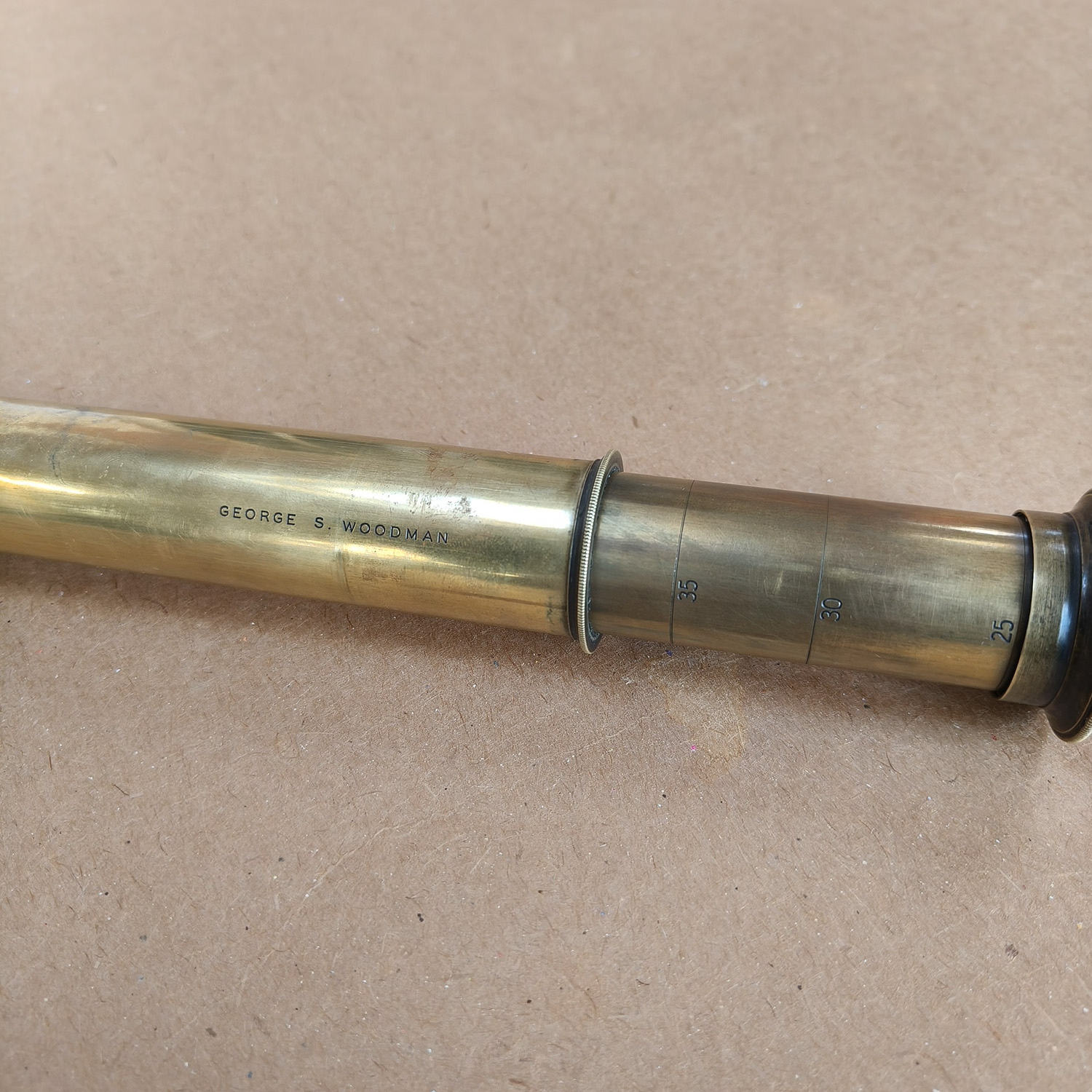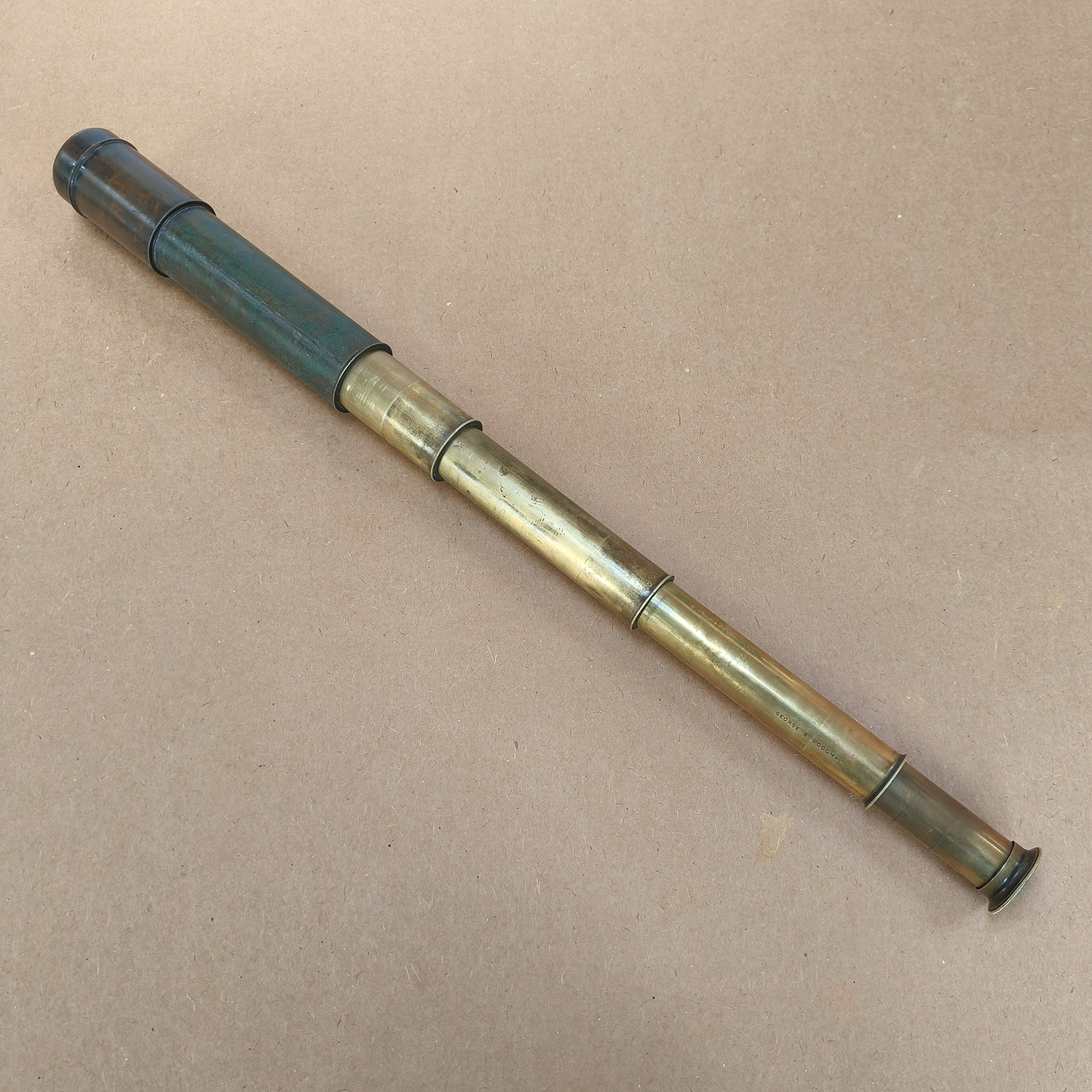 This is an antique four-draw brass telescope signed George S. Woodman, a known British maker of optical and scientific instruments.
