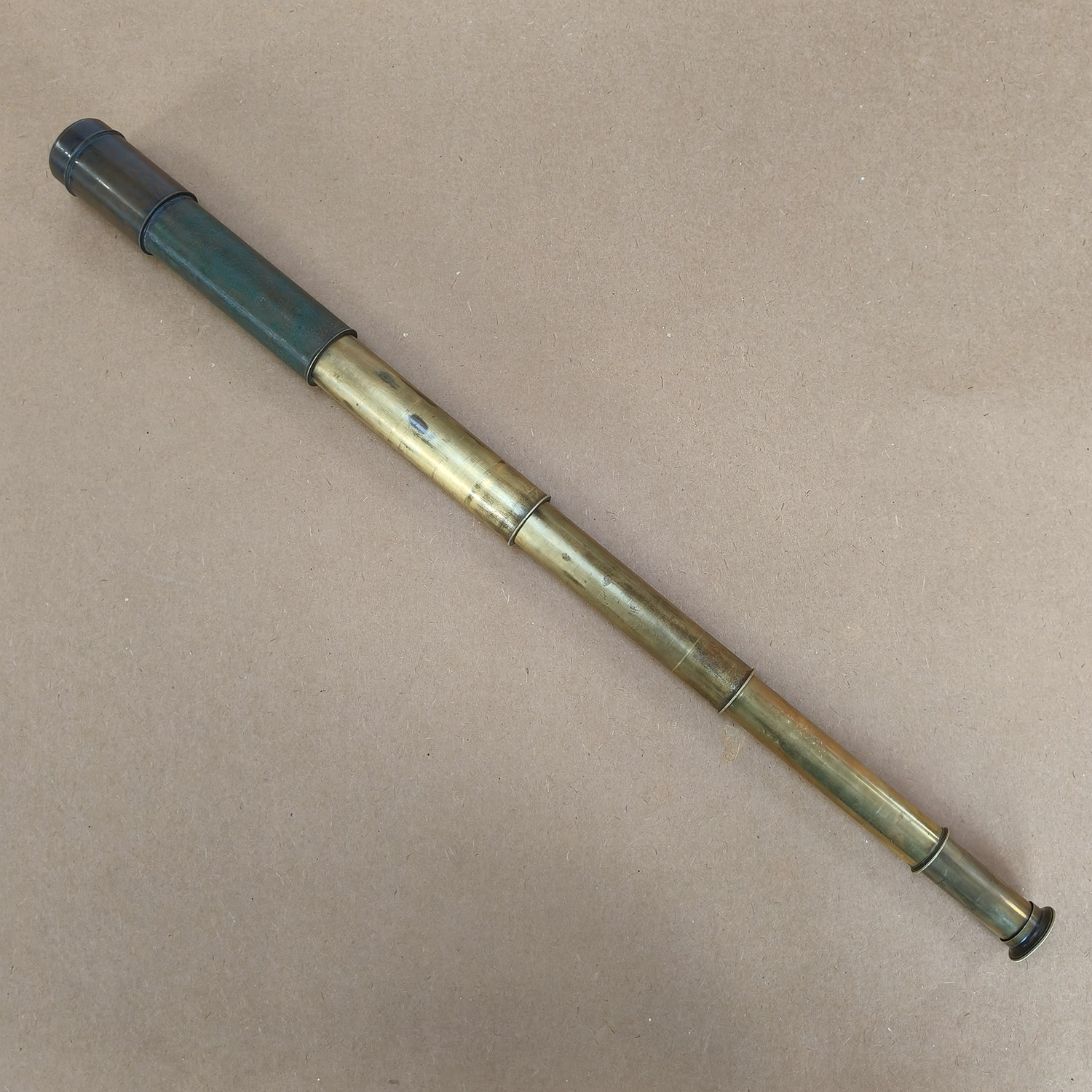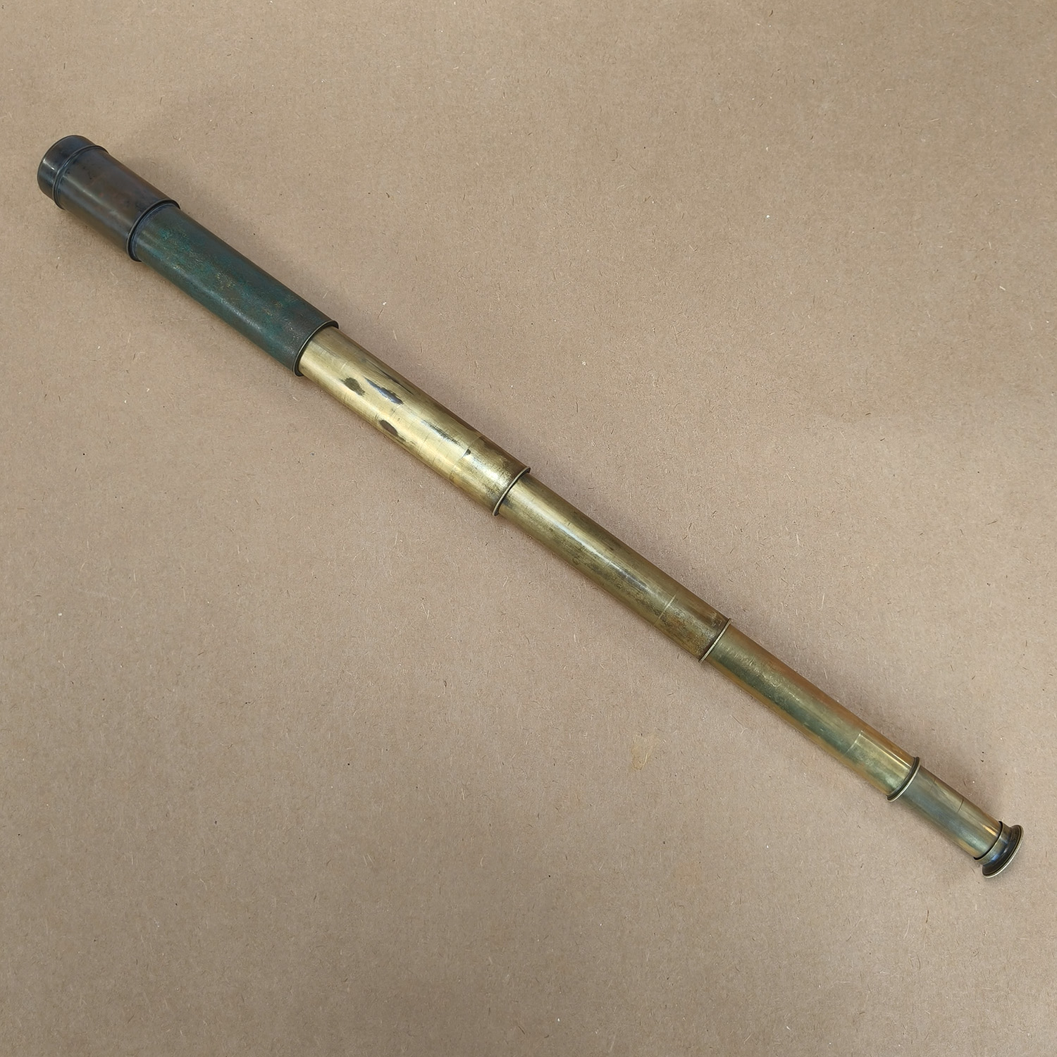 The telescope features a classic multi-draw brass construction with variable magnification between 25x and 35x. It has a pleasing aged patina, consistent with authentic Victorian-era manufacture. It extends smoothly and locks up well when fully drawn.