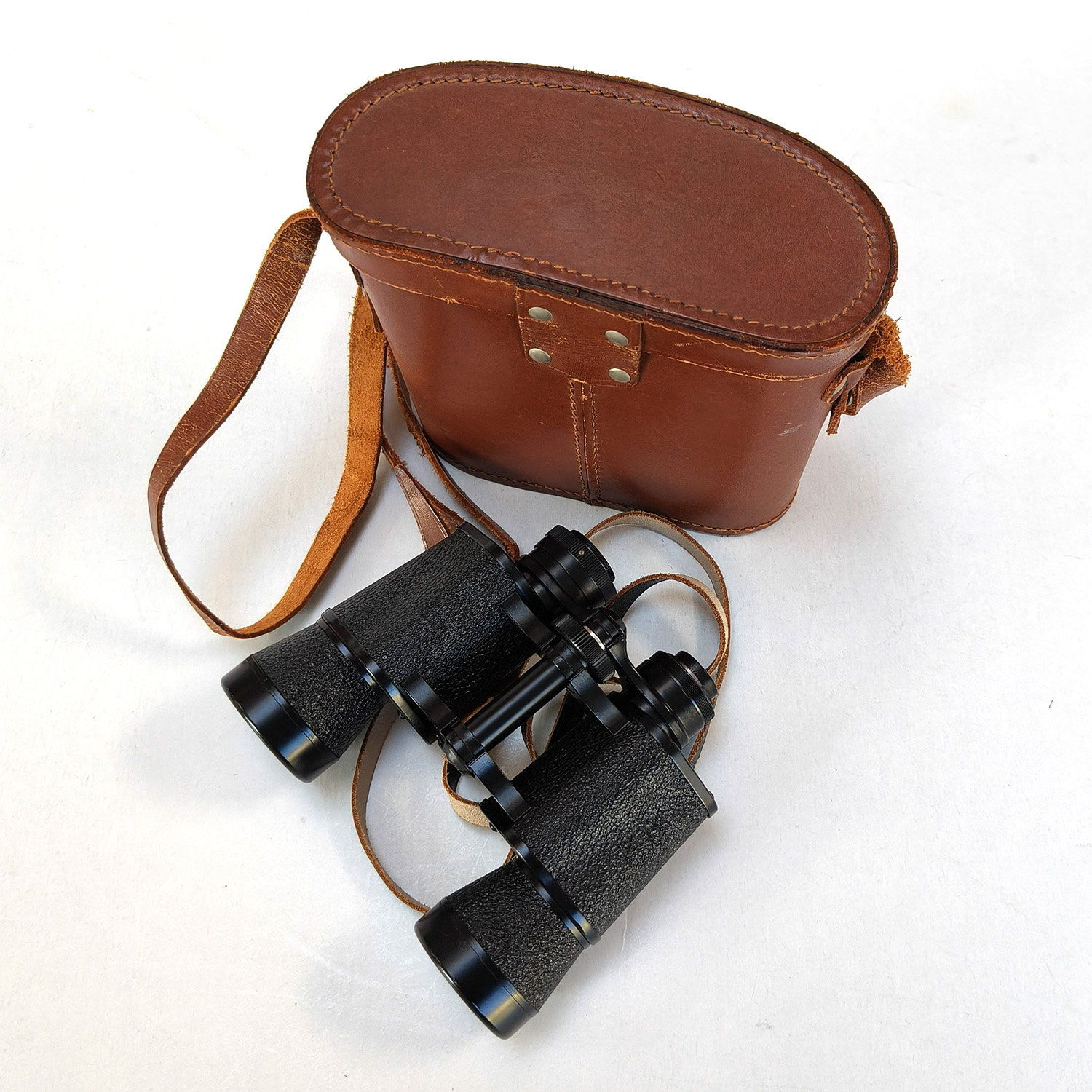 Optics are intact and very clean, and images are clear and sharp. Good light transmission for age. No cracks or chips on the lenses. Focus mechanism operates smoothly. Exterior shows minor cosmetic wear consistent with age. Leather case displays natural patina but remains solid and functional.