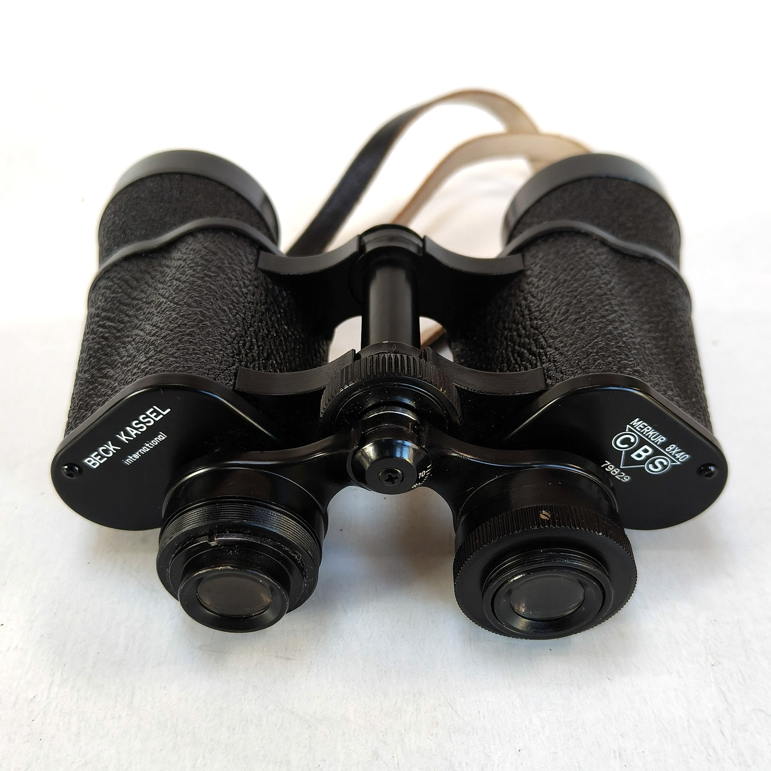 A scarce and desirable example of post-war German optical craftsmanship: Beck Kassel CBS Merkur 8×40 binoculars, complete with the original leather carry case and strap.
