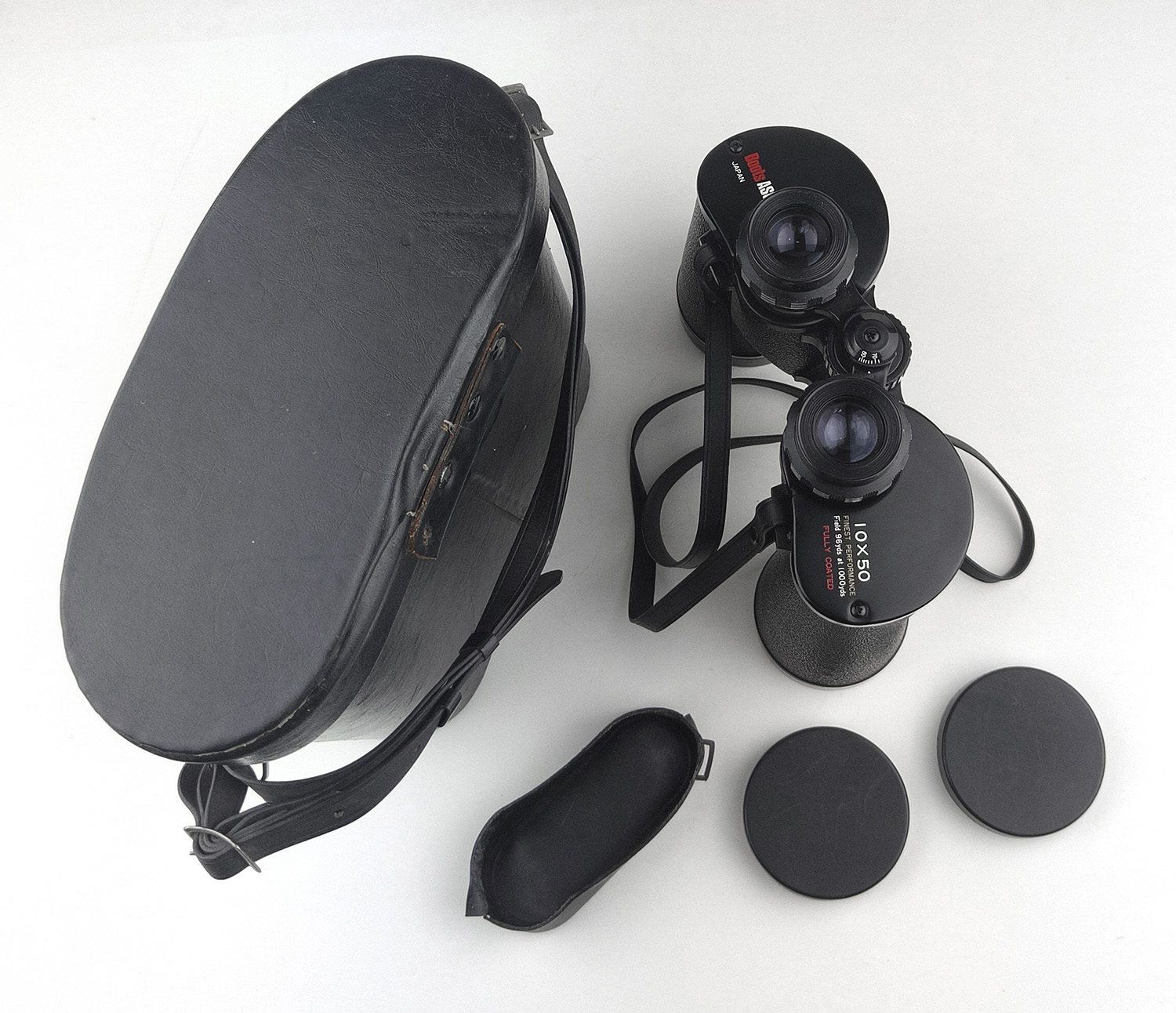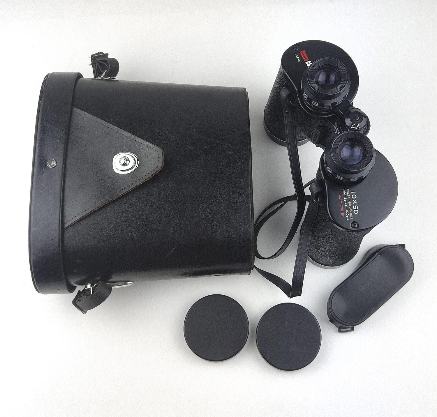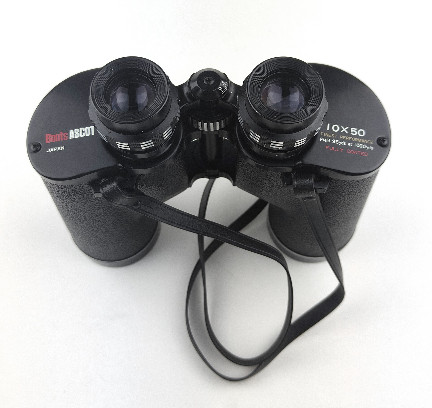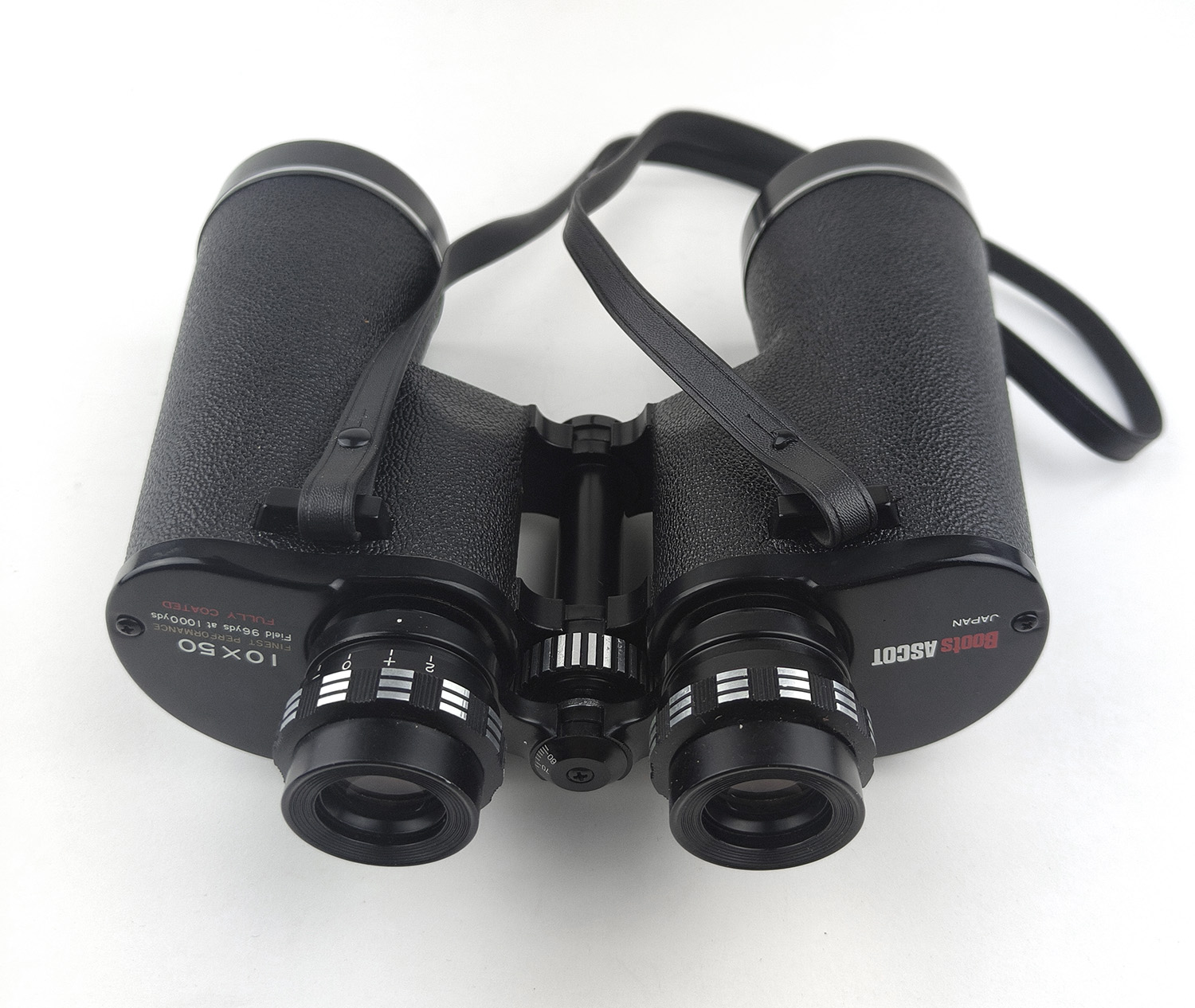 This is a pair of Boots Ascot 10×50 Fully Coated Binoculars. The binoculars have 10x magnification and 50mm objective lens diameter, with fully coated optics and wide field of view. Image focus is achieved by using the centre focus wheel and balanced at the right eyepiece. The binoculars have wide 96 yds/1000 yds field of view. Good working condition.