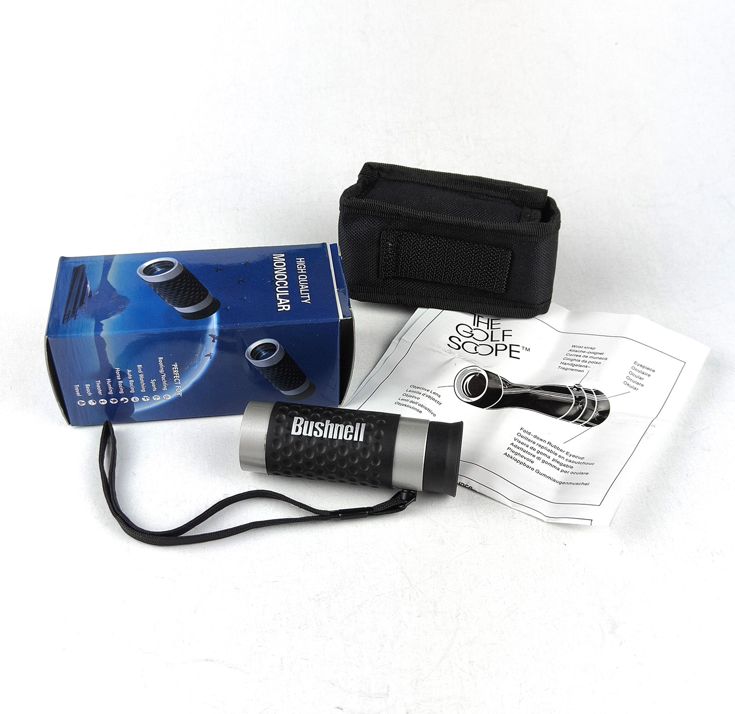 Package includes: golf scope with attached hand strap, soft belt pouch with belt loop, lens cleaning cloth, user manual and colour print box.