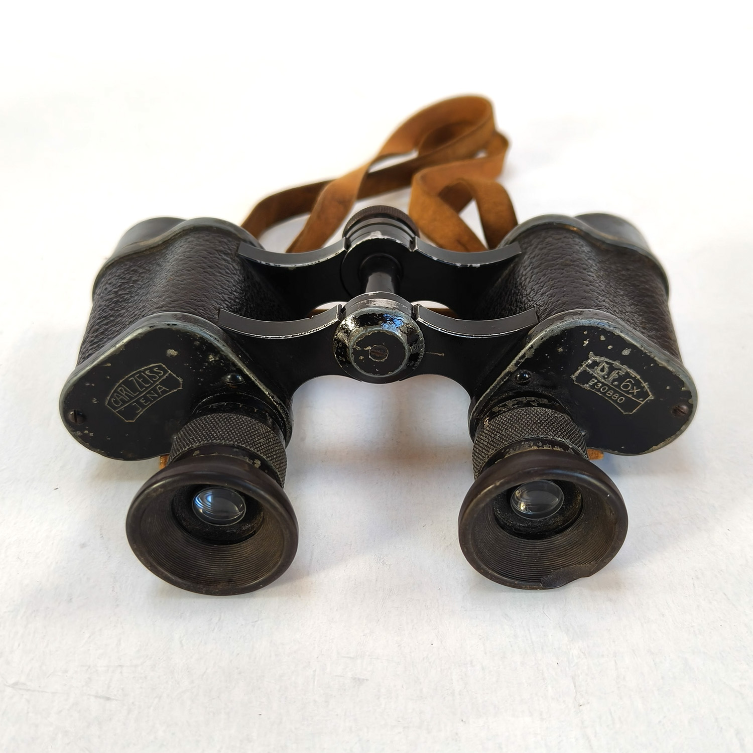 A classic and highly collectible pair of Carl Zeiss Jena DF 6x binoculars, representing the renowned German optical engineering that made Zeiss a global benchmark. These binoculars feature traditional Porro-prism construction with individual eyepiece focusing, solid metal housings and period black enamel finish.