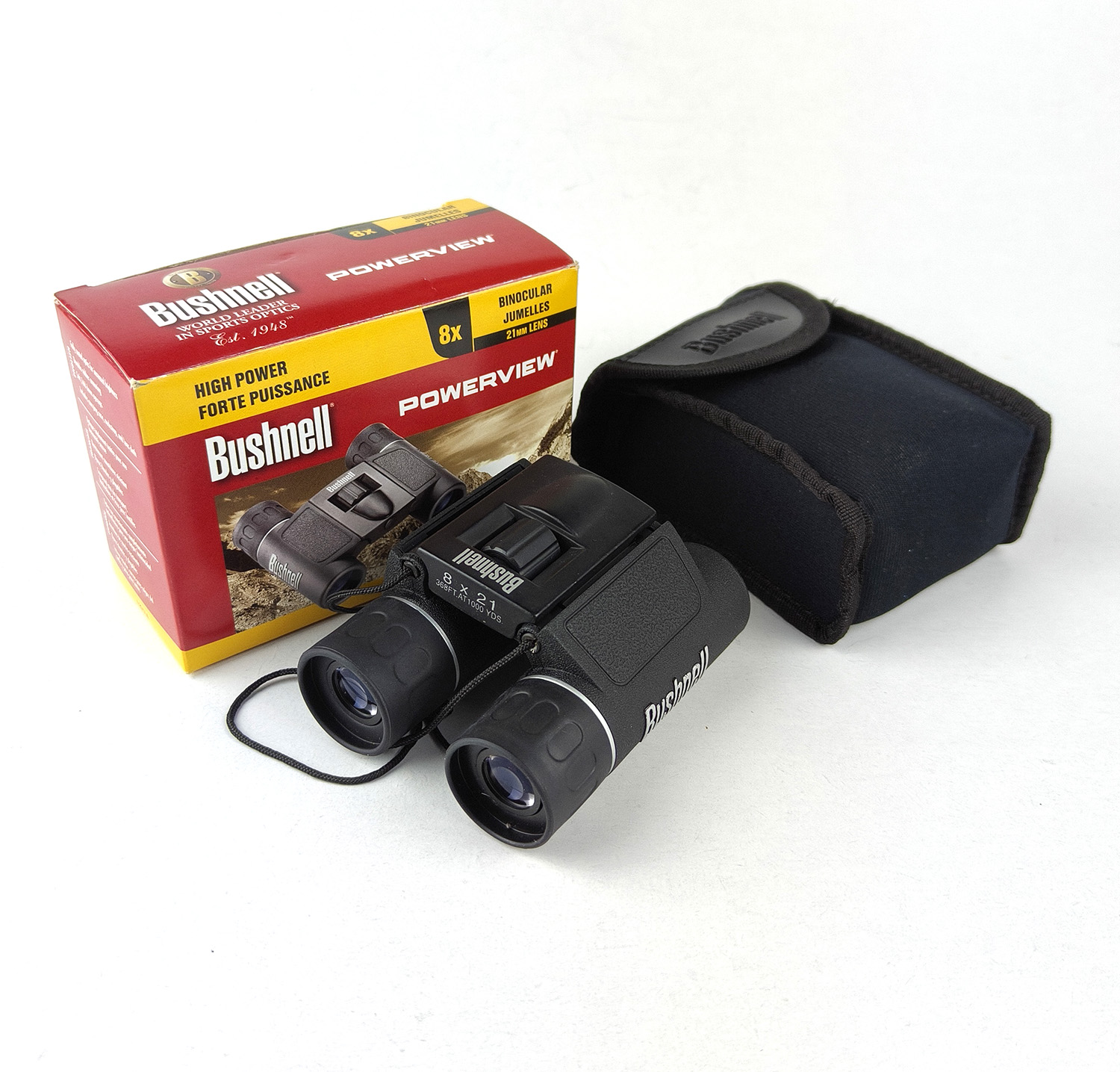 Package includes: Bushnell 8×21 binoculars with neck strap, nylon belt pouch, lens cleaning cloth and user manual. All packed in a colour print gift box.