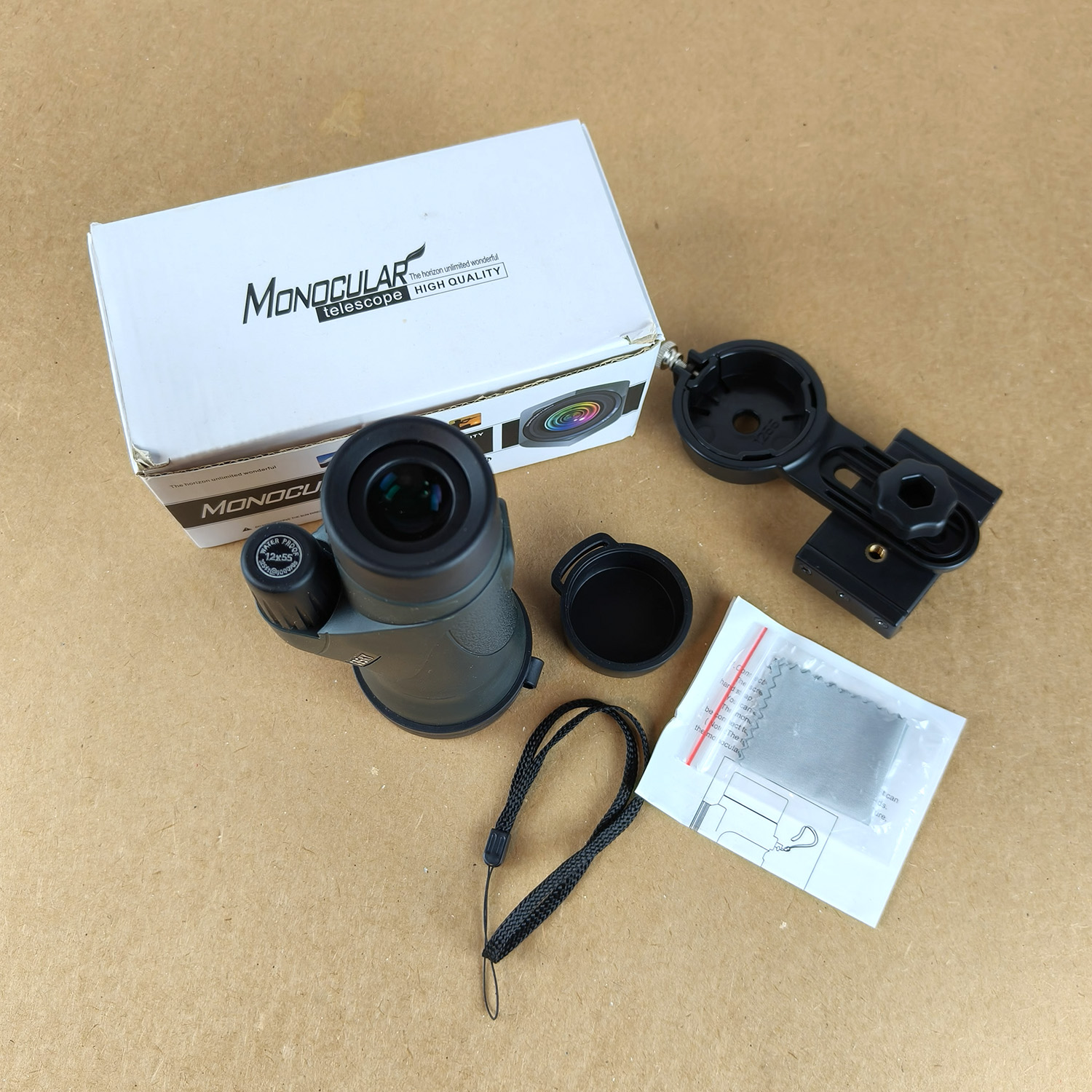 - Included: Gosky 12×55 monocular, smartphone adapter, built-in tripod mounting bracket, lens caps, wrist strap, lens cleaning cloth, original box.
