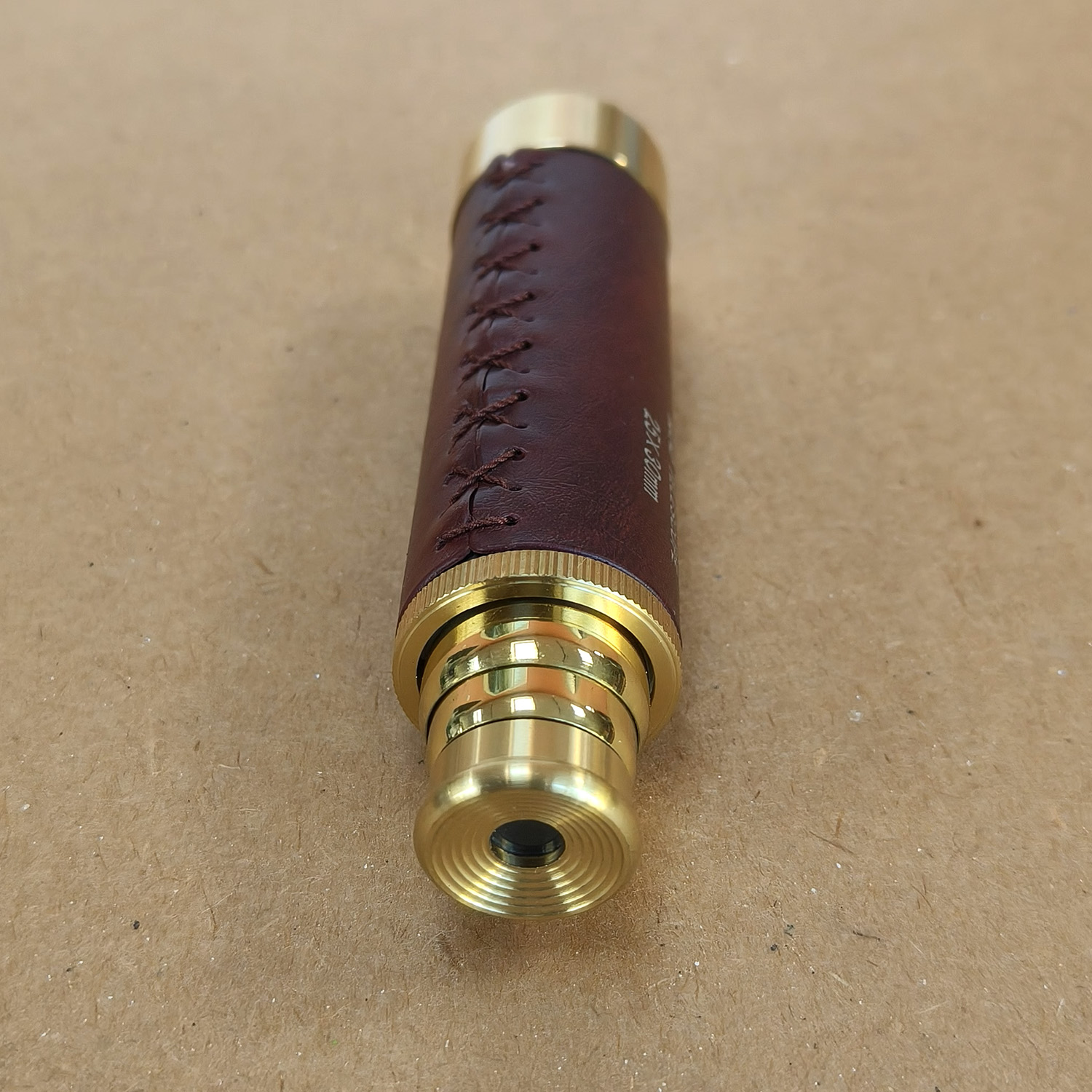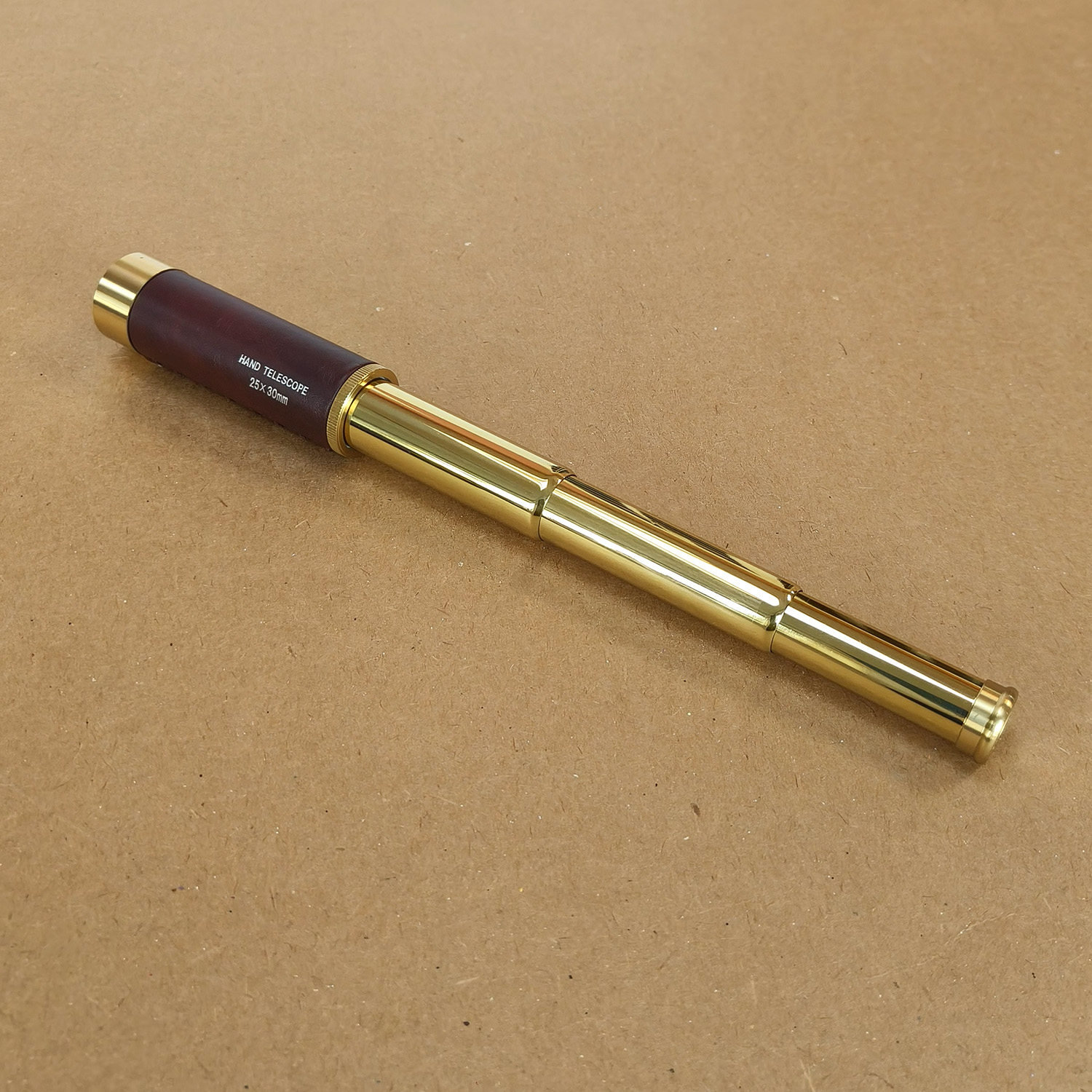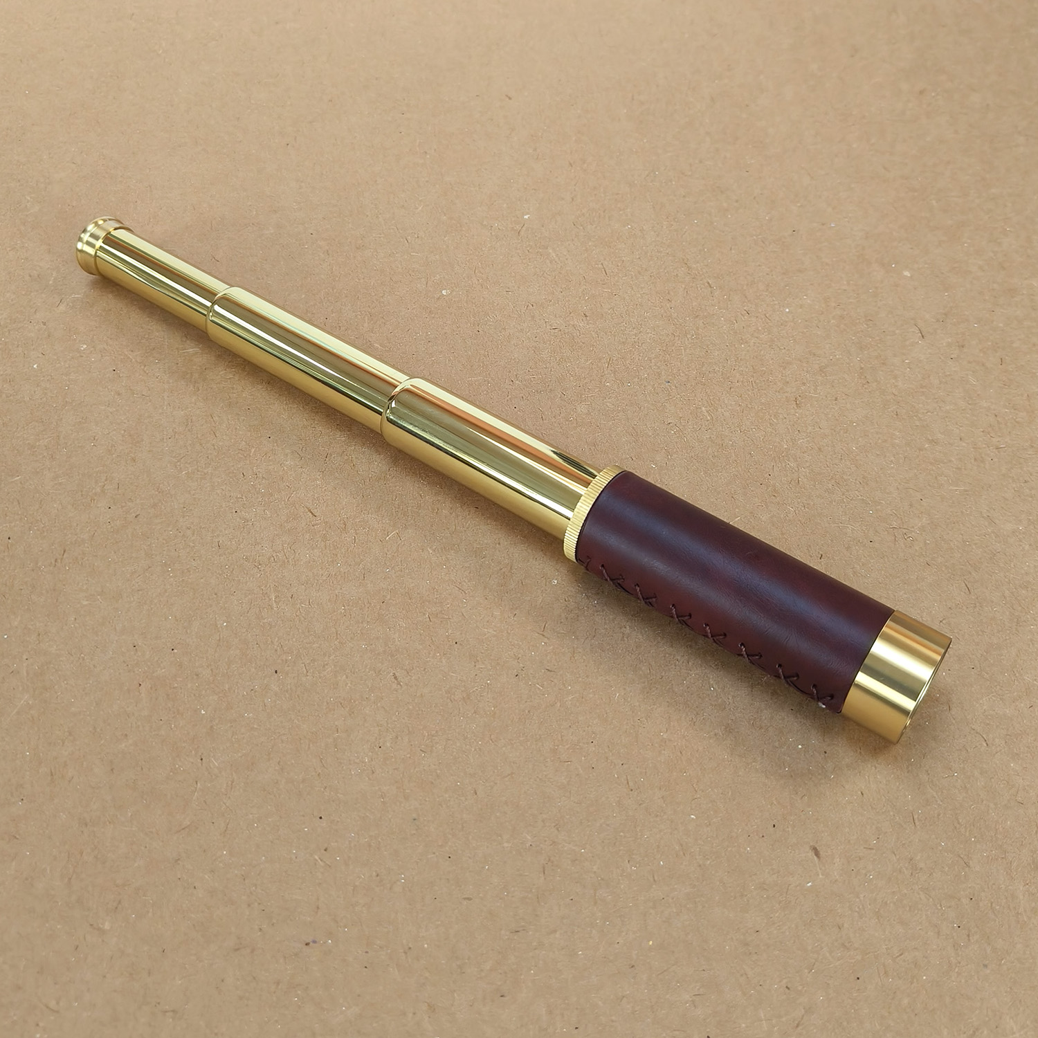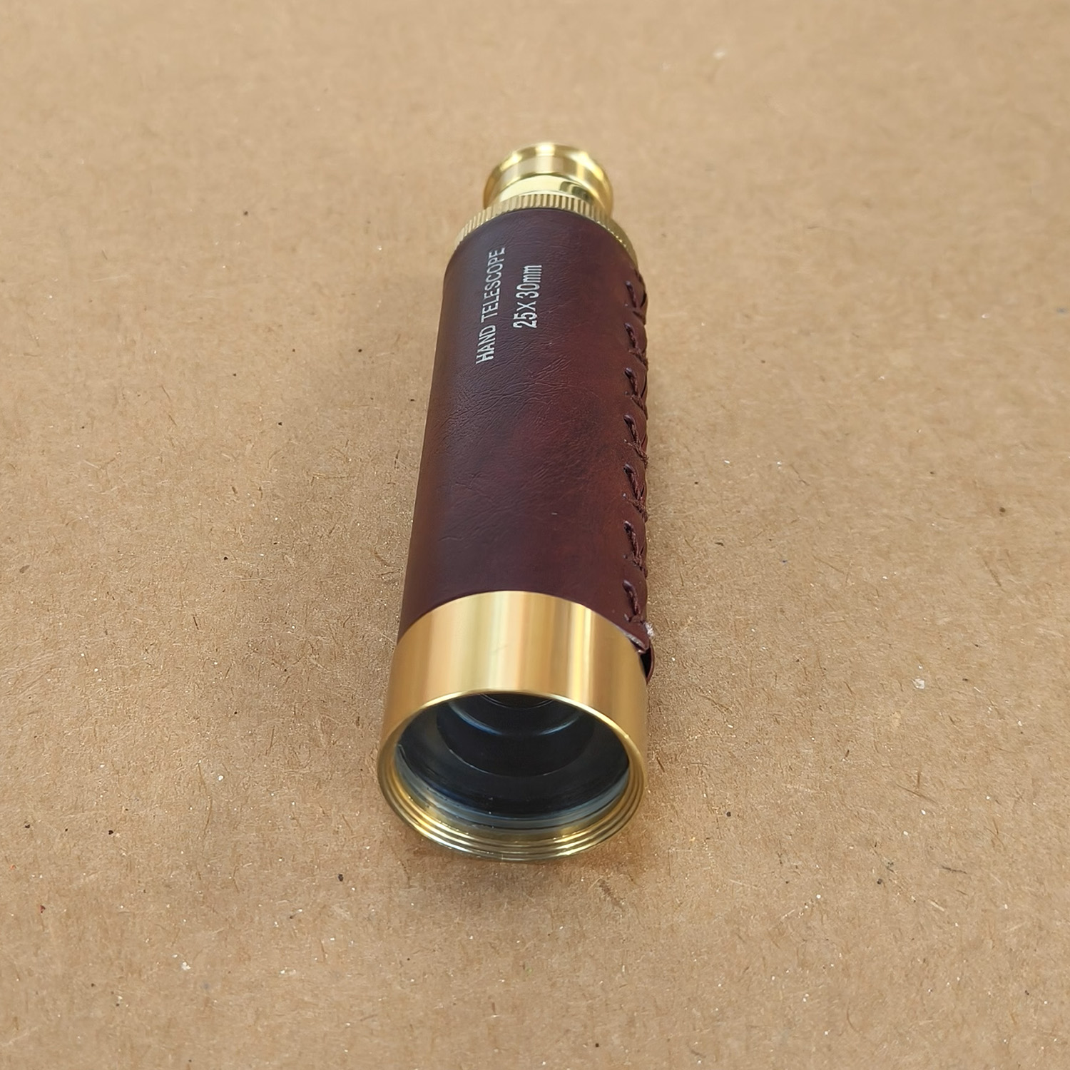 This is a stylish vintage-style 25x30mm brass Hand Telescope / spyglass with a stitched brown leather wrap. It features a classic 3-draw extendable design, smooth focusing, and clear optics—perfect for display, collecting, hiking, birdwatching, boating, or gifting.