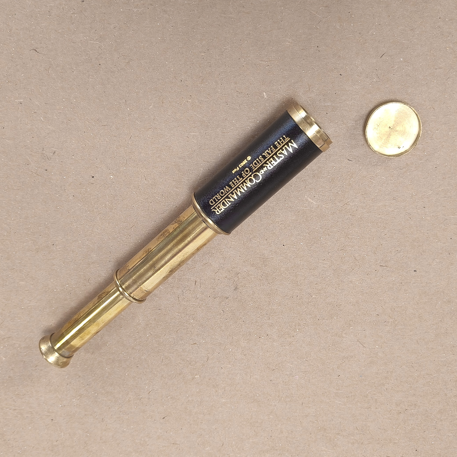 This is a brass draw telescope / spyglass produced as official film merchandise for Master and Commander: The Far Side of the World (© 2003 Fox), clearly marked on the leather-covered barrel.