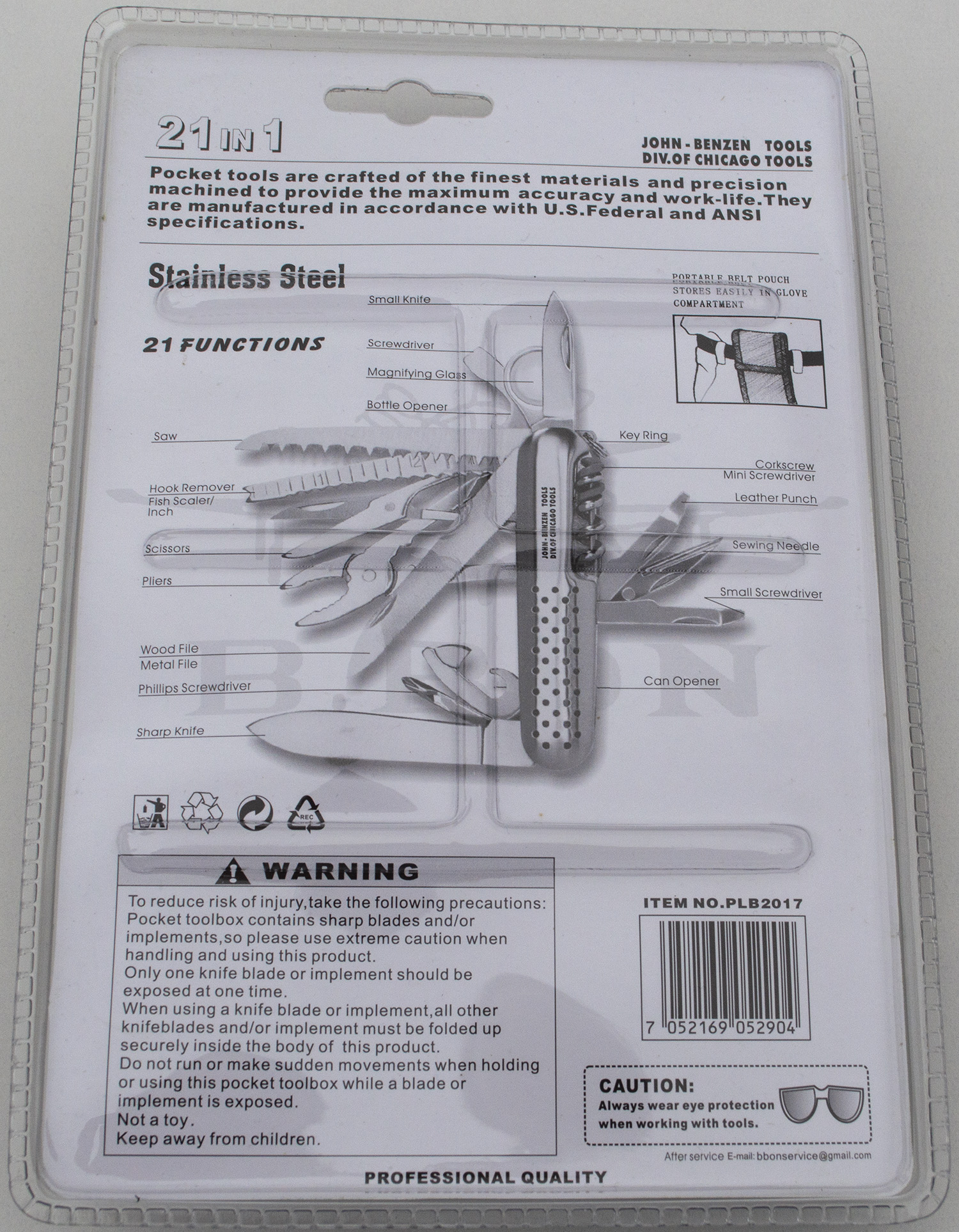 This is a “21 functions in 1” stainless steel multi-purpose tool/pocket knife set. It is made for convenient use in many situations especially in outdoor activities. The tools are crafted of the finest materials and precision machined to provide the maximum accuracy and work-life. They are manufactured in accordance with U.S. Federal and ANSI specifications.