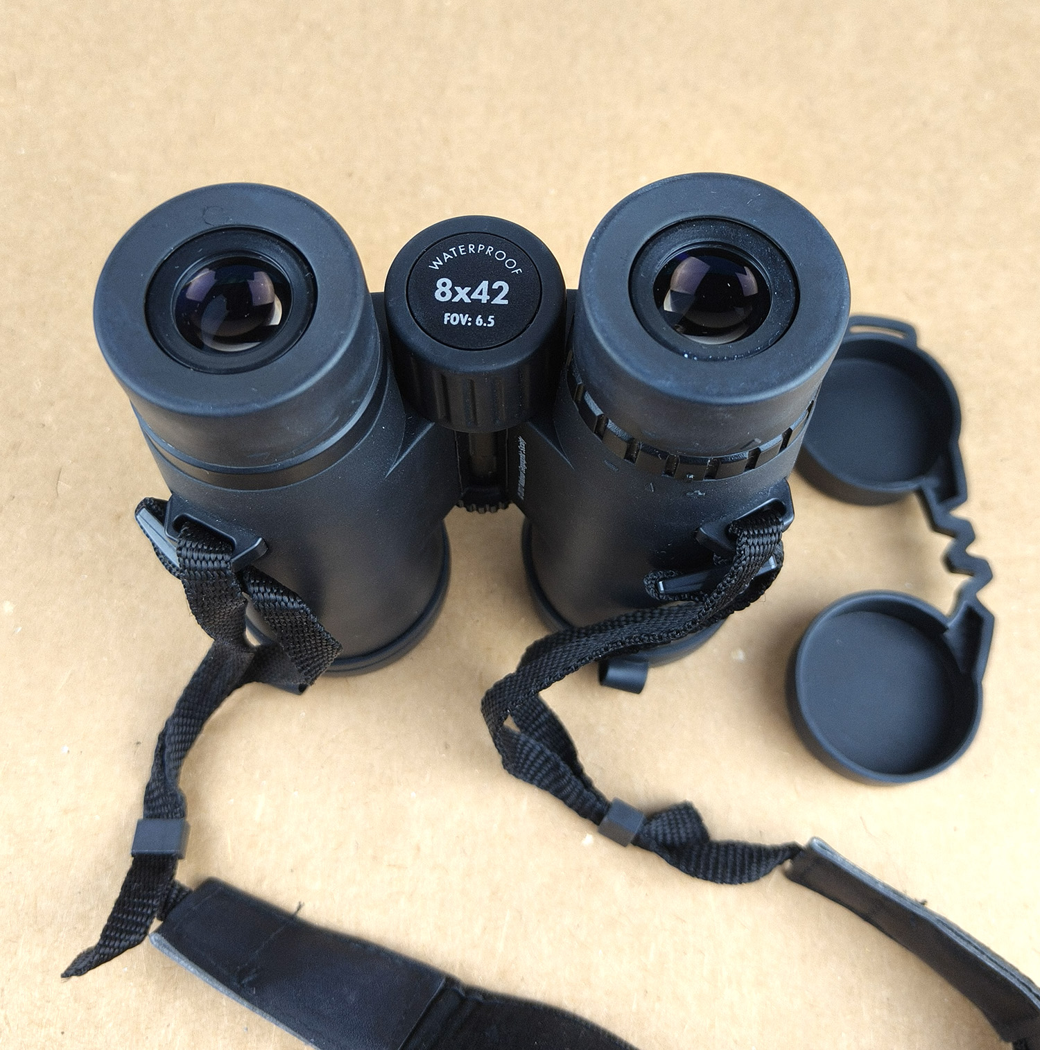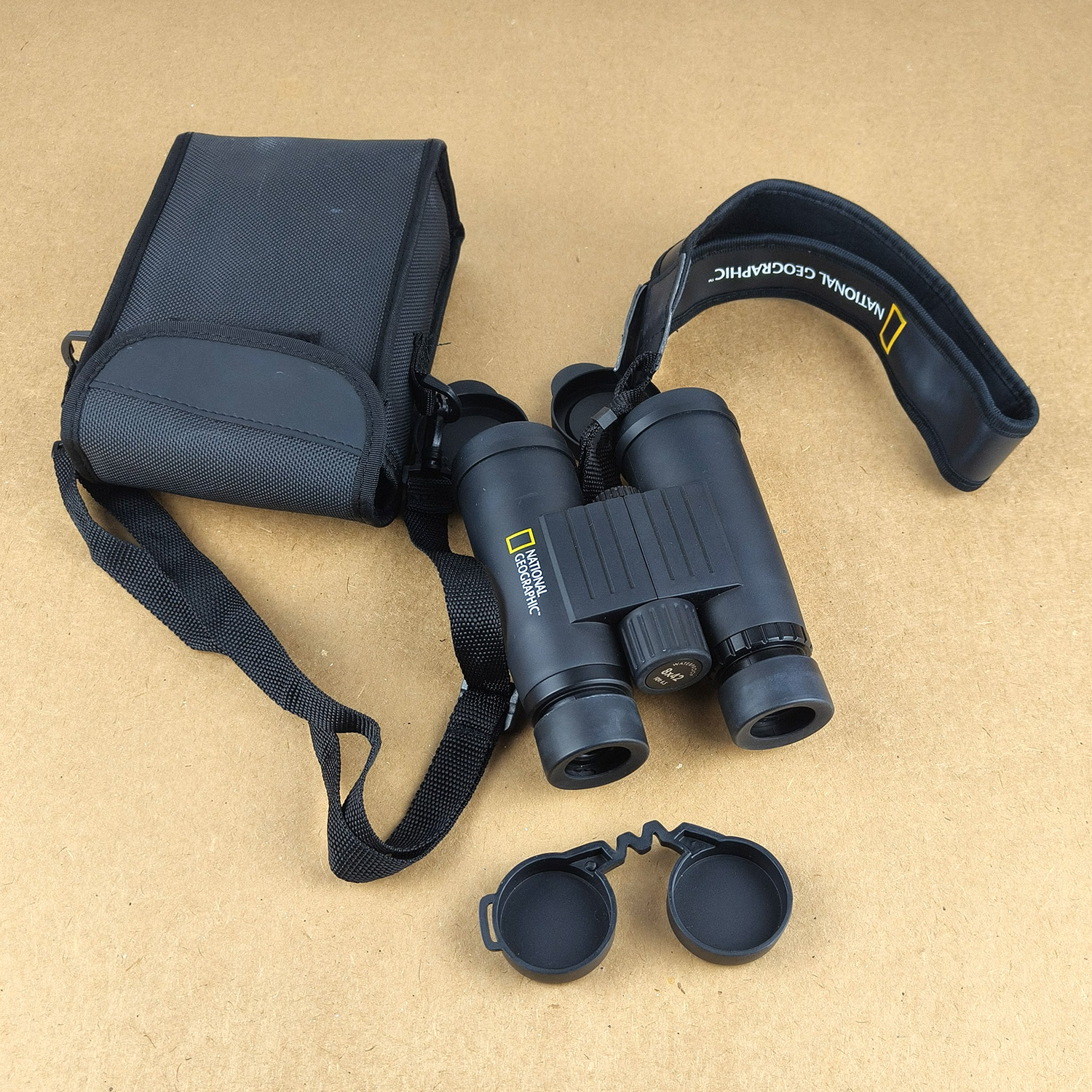 Package includes: 8×42 binoculars with shoulder strap, a nylon carry case with shoulder strap, lens caps for objectives and eyepieces.