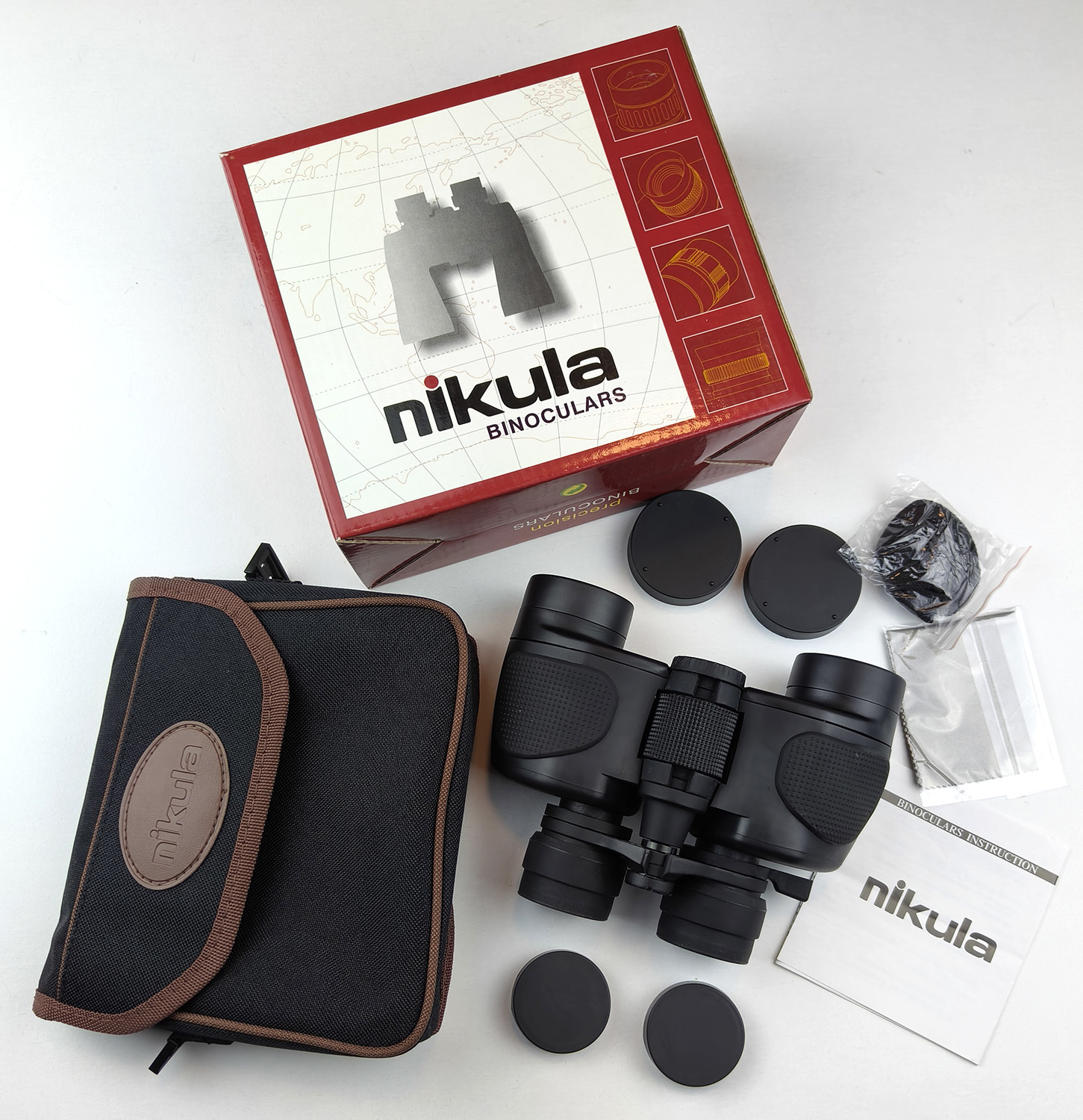 Package includes: the nikula 7-15×35 zoom binoculars, nylon carry case, lens caps, binocular neck strap, lens cleaning cloth and user manual. All packed in a colour print gift box.