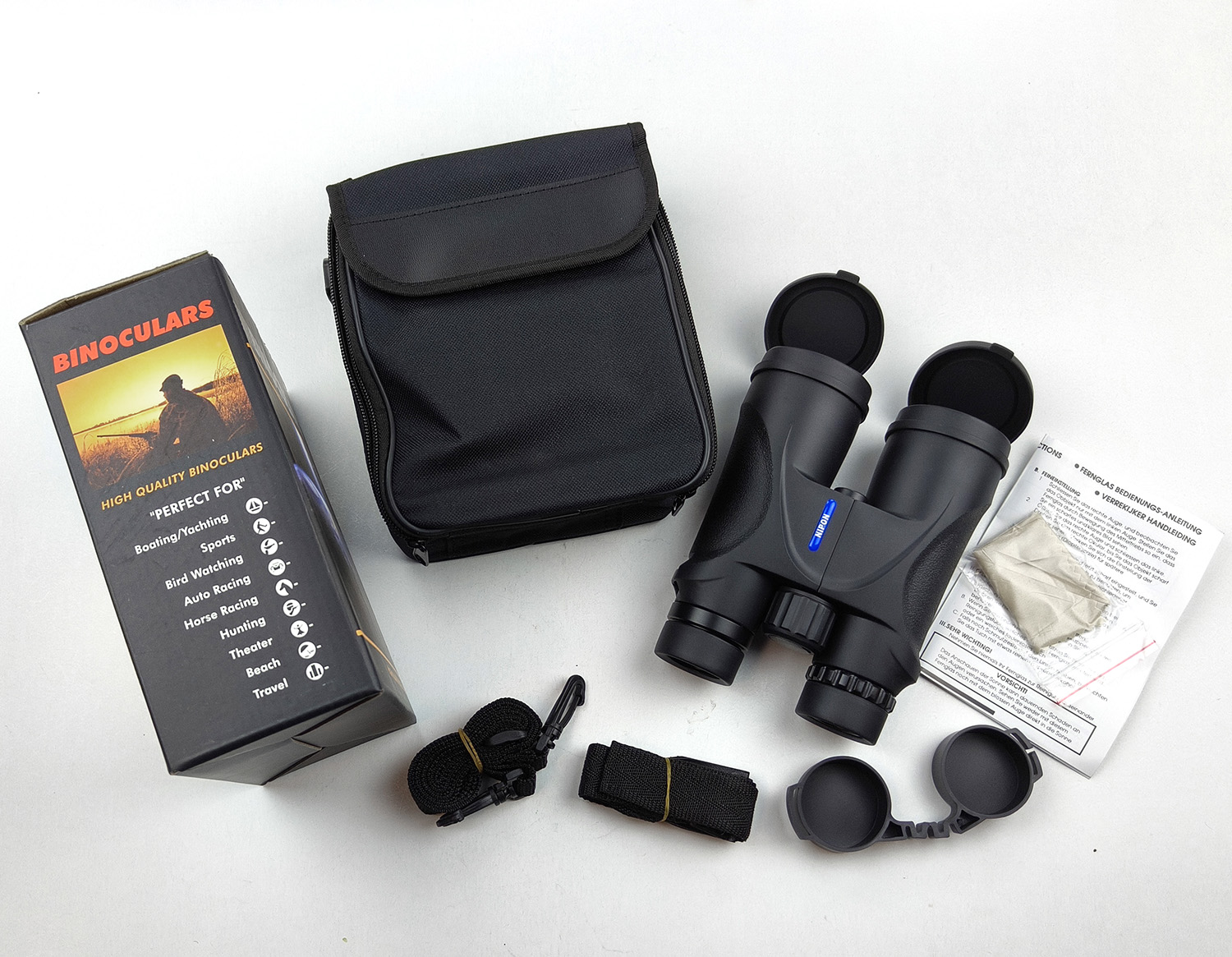 Package includes: NIPON 12×50 binoculars, nylon carry case with shoulder strap, lens caps, neck strap, user manual and lens cleaning cloth. All packed in a colour print gift box.