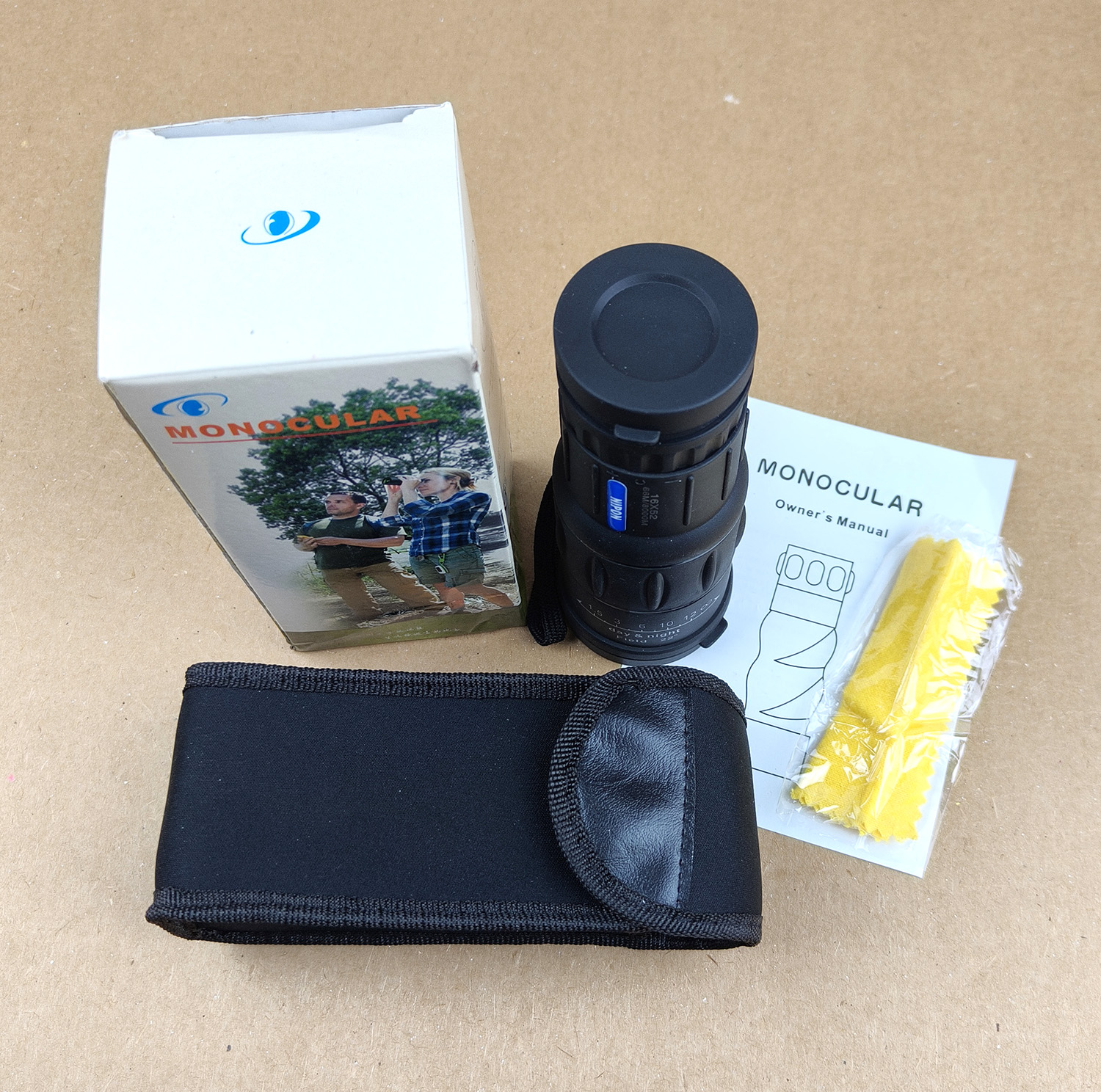 Package includes: monocular with attached hand strap and lens caps, soft belt pouch with belt loop, lens cleaning cloth, user manual and colour print box.