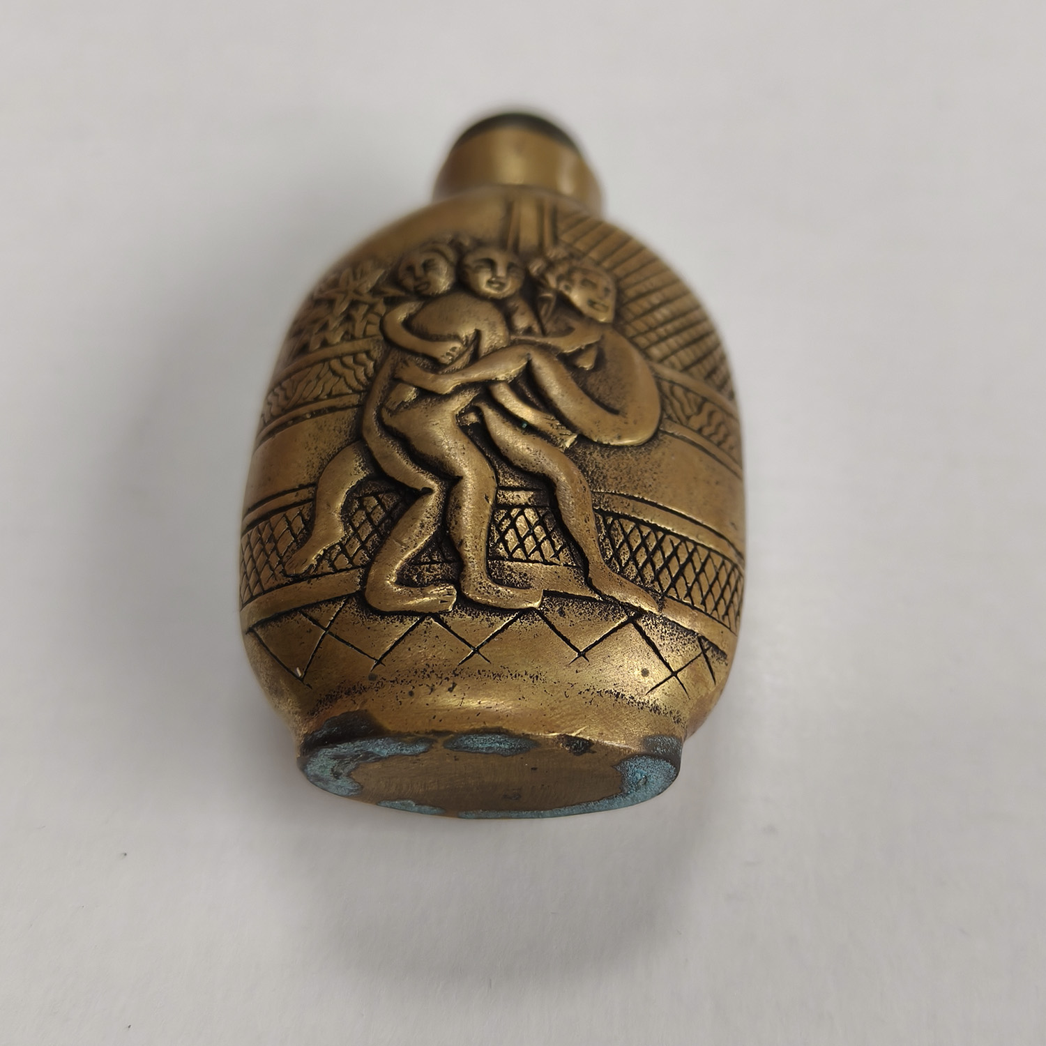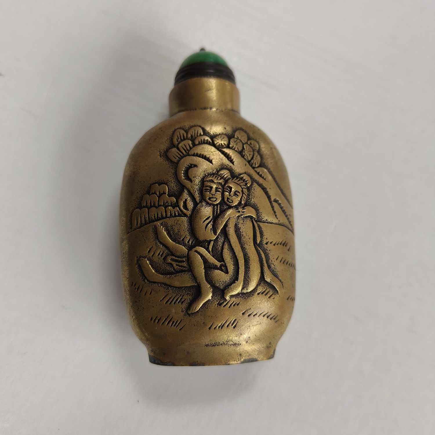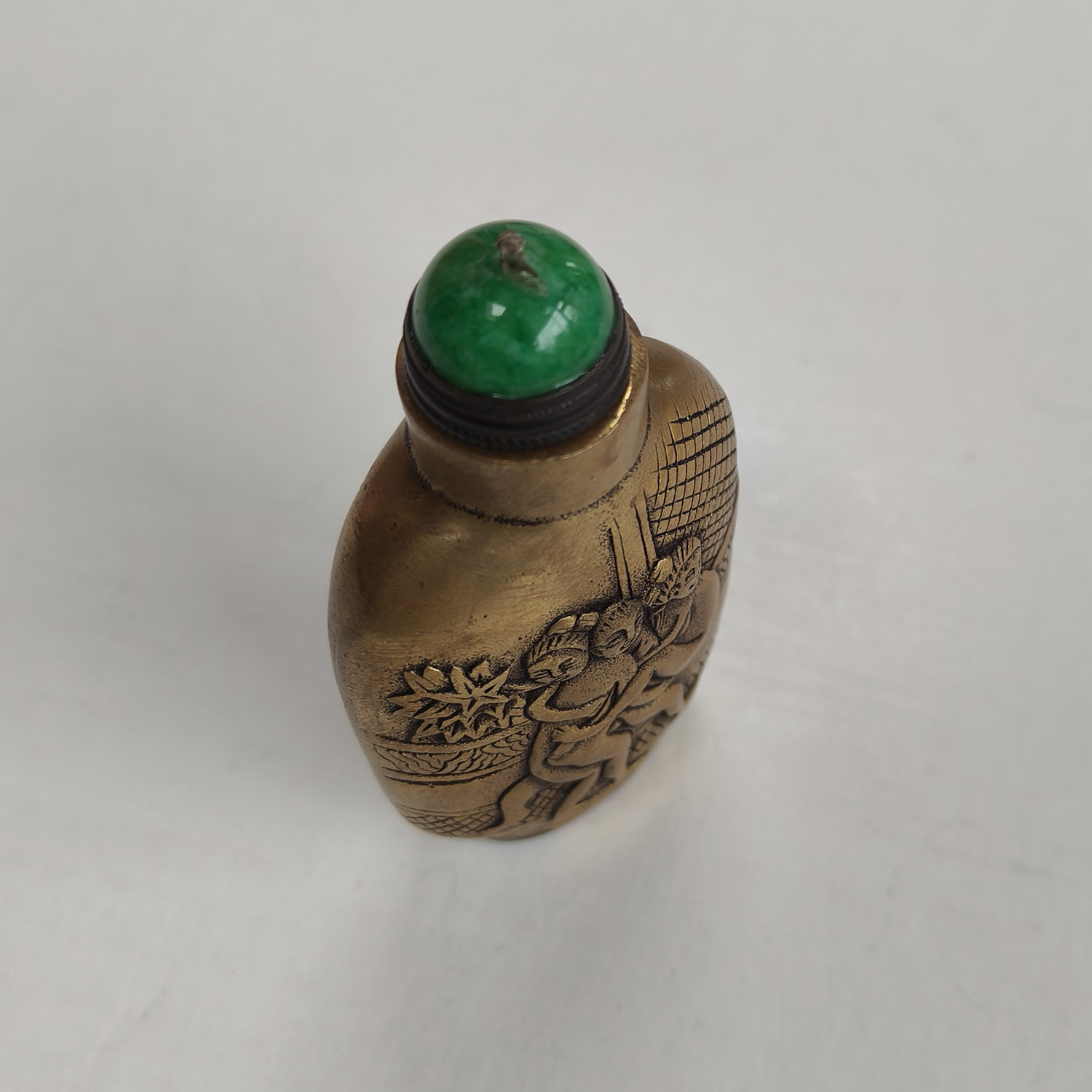 This is a vintage brass snuff bottle with a green stone lid and carved figures and patterns on both sides.