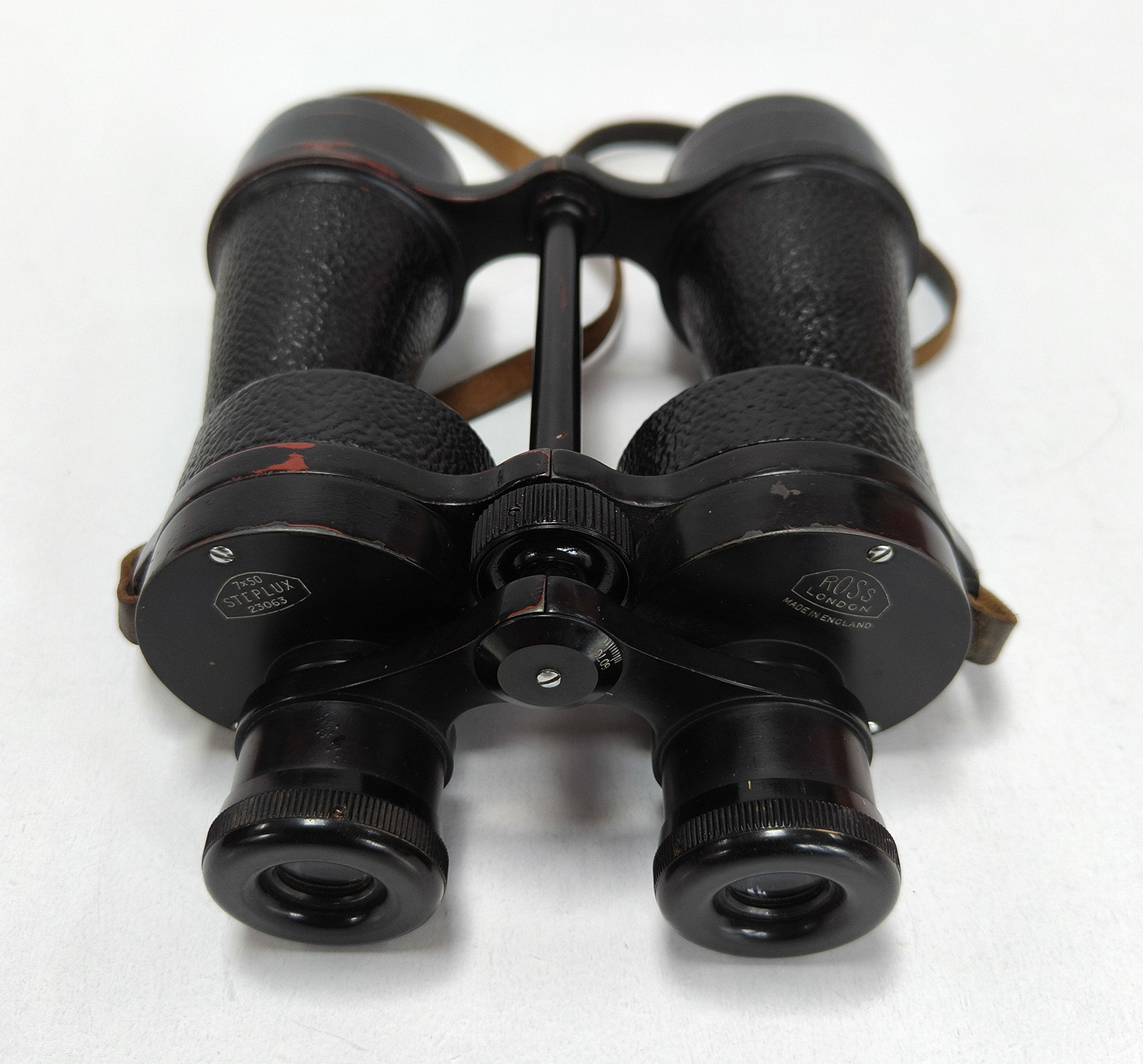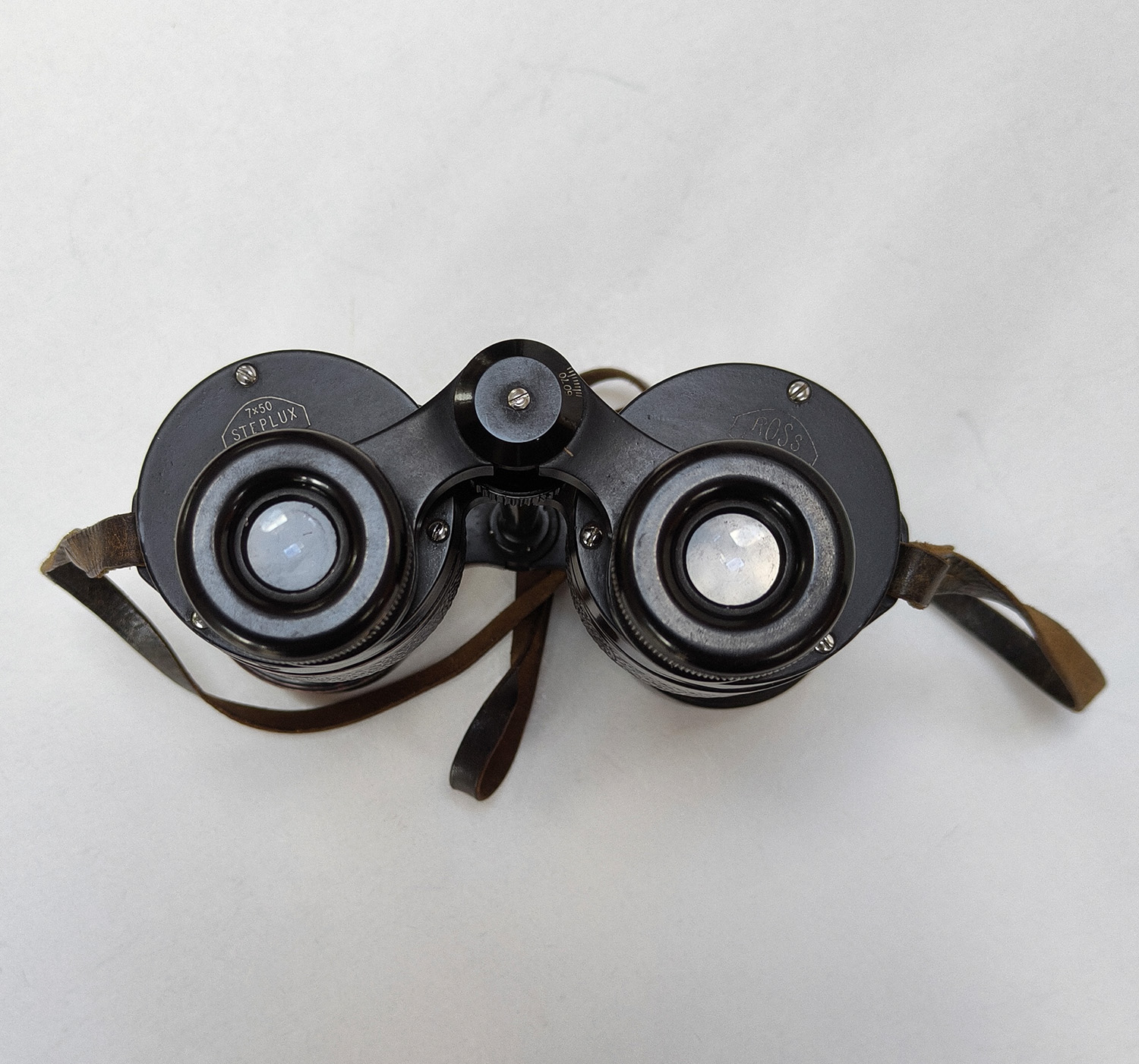 This is a pair of vintage British Ross London 7×50 Steplux binoculars with 7x magnification and 50mm objective lens. These binoculars are in good working order.