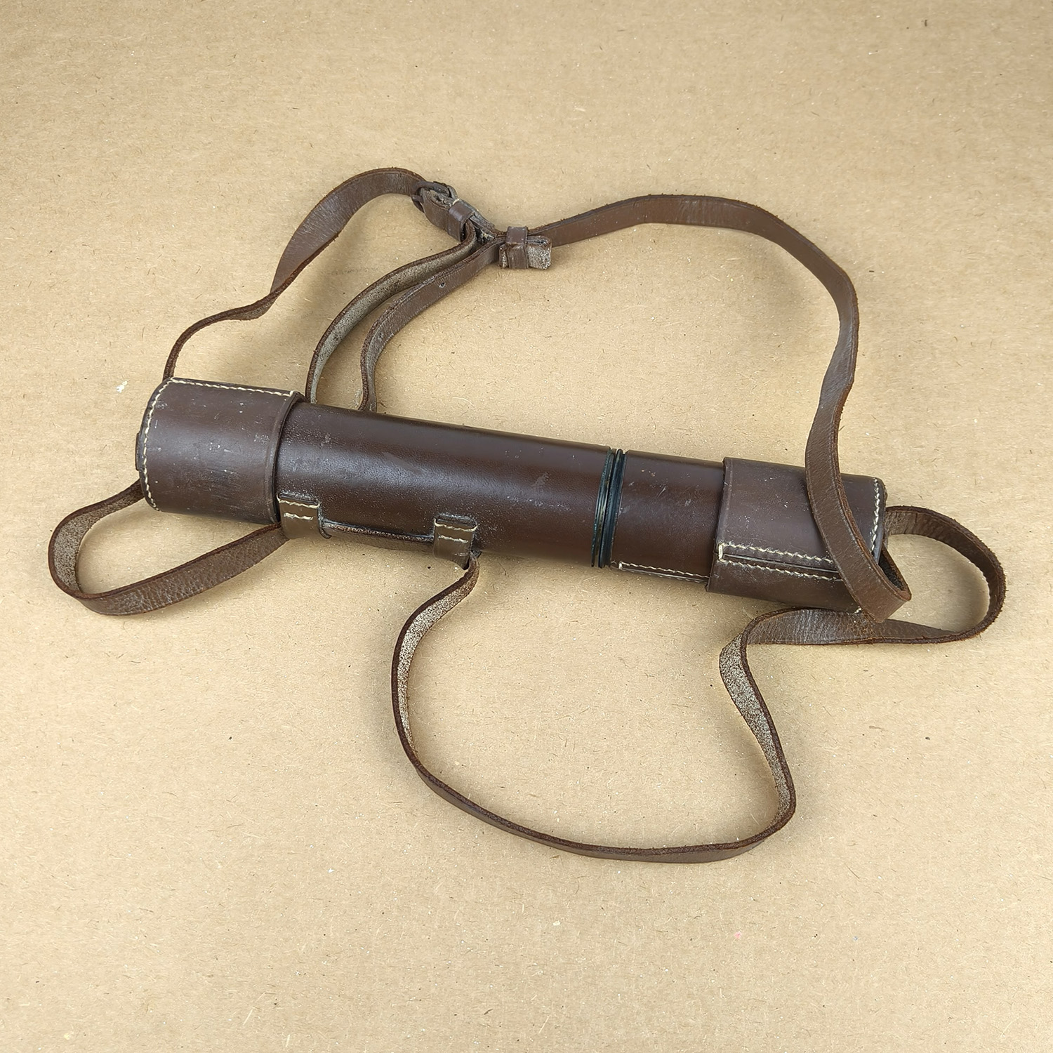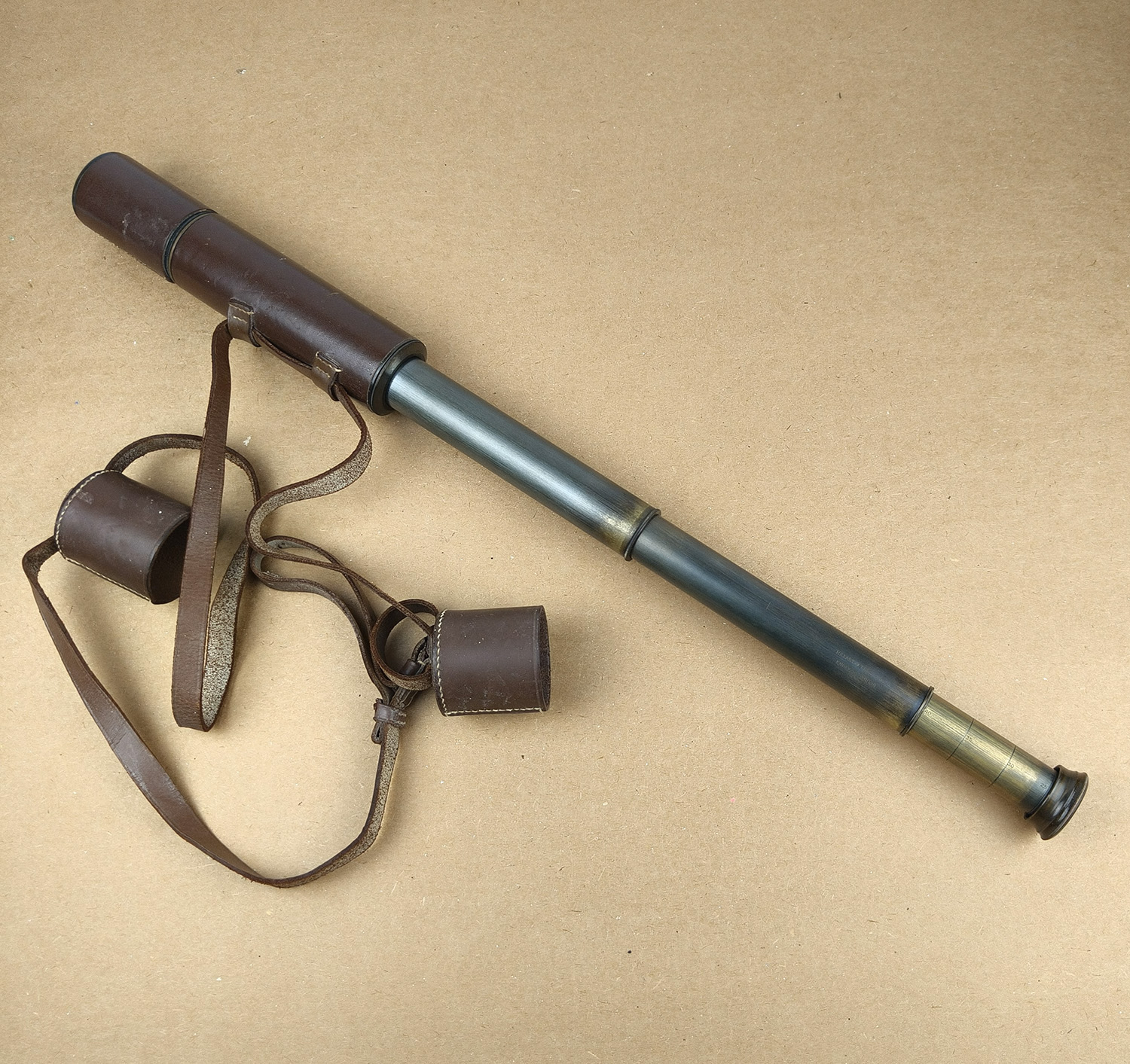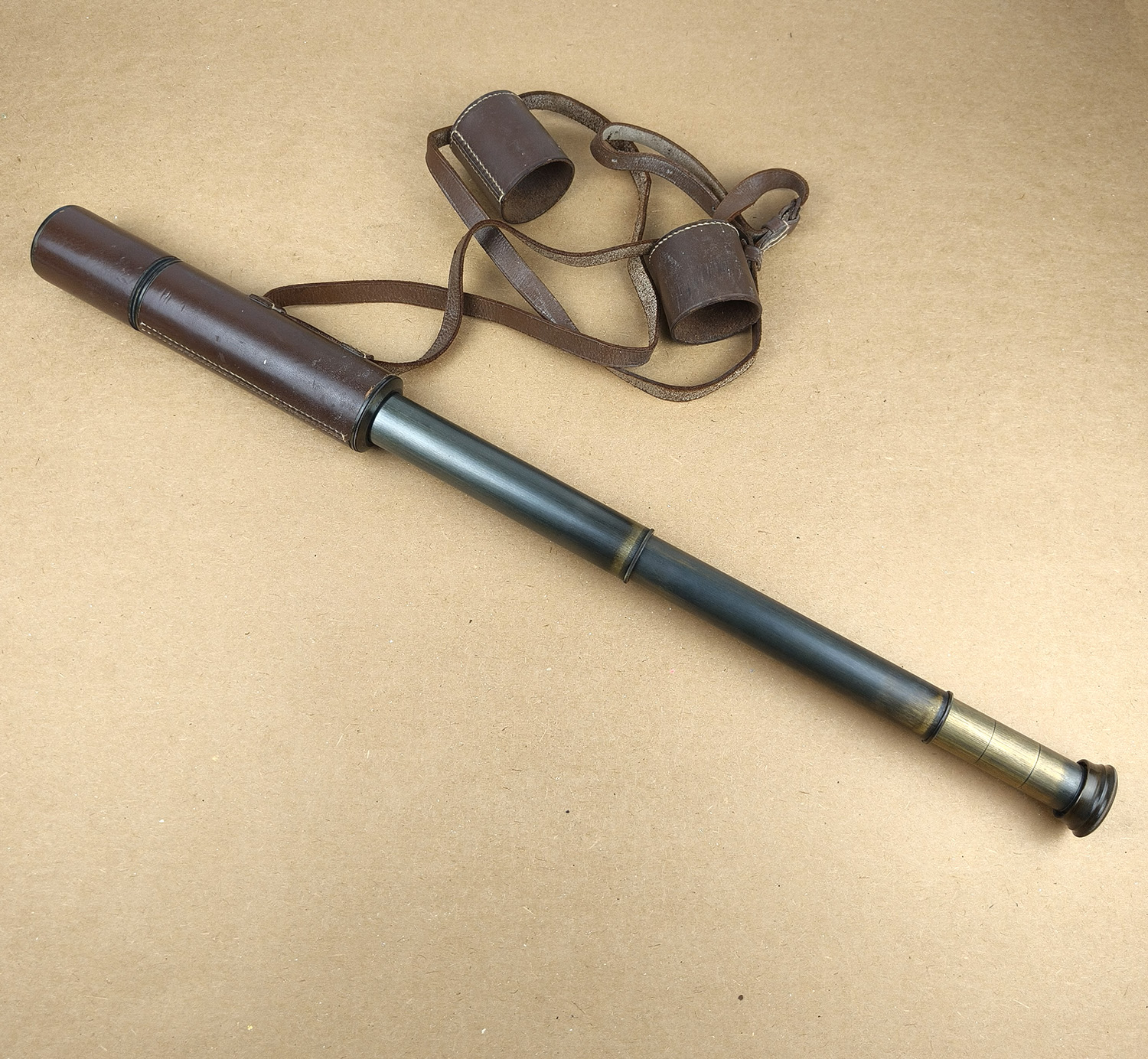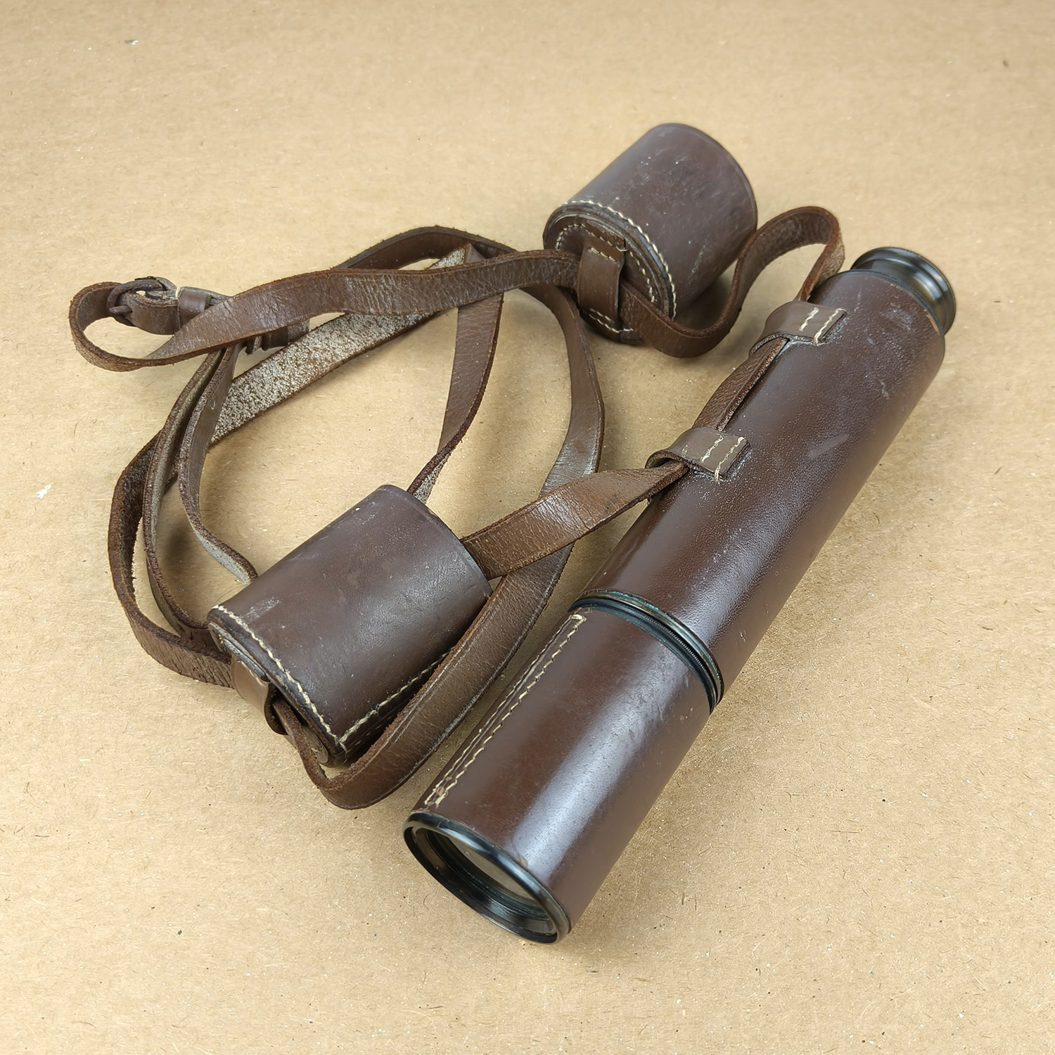 Brass draw tubes intact with attractive aged patina. All sections extend and retract smoothly. Leather body covering and original leather case and shoulder strap are in good vintage condition. General cosmetic wear consistent with age, no damage or dents to tubes.