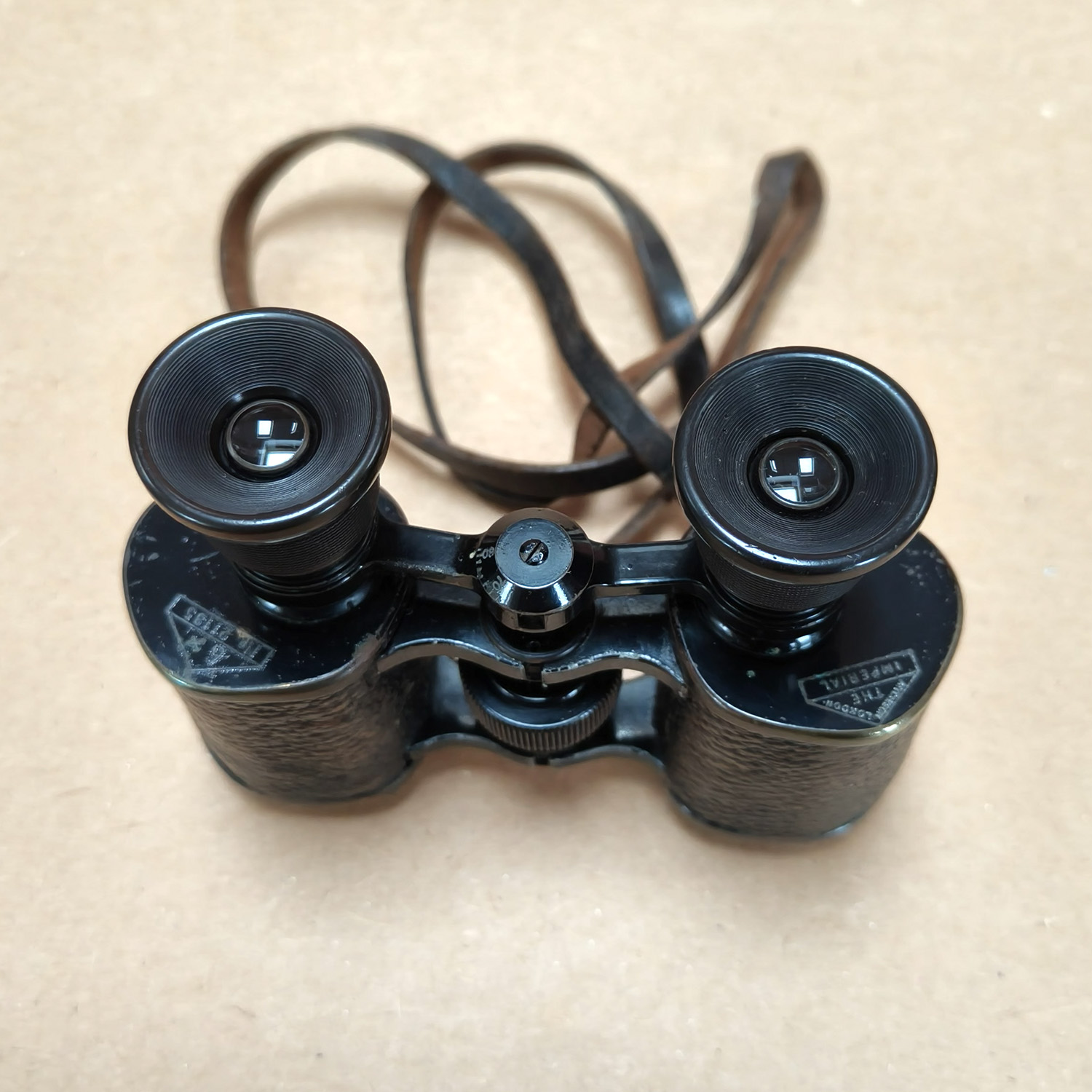 Classic British-made binoculars from Aitchison London, “The Imperial” 6x model. Textured black body with clear glass optics and smooth focus. Comes with original red velvet-lined leather case and strap. Lovely vintage condition with some wear and patina. Great for collectors of antique optics or early 20th-century instruments.