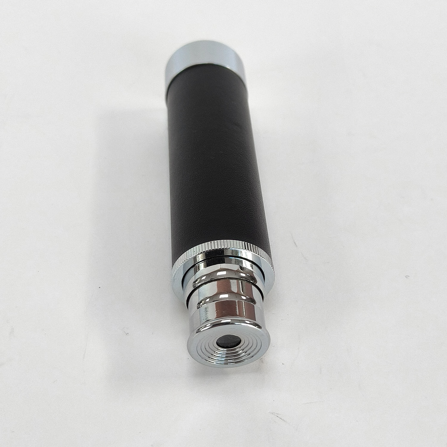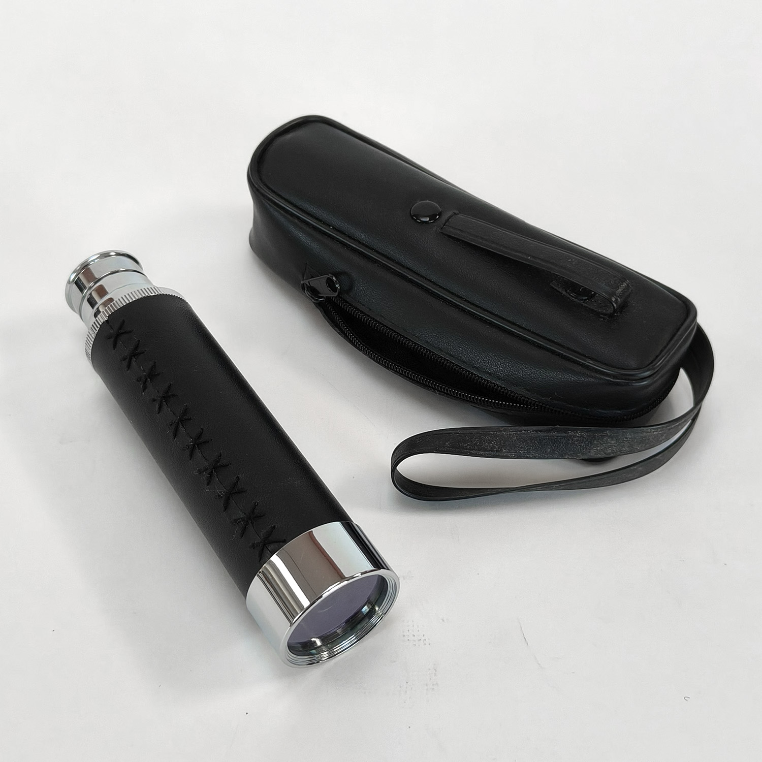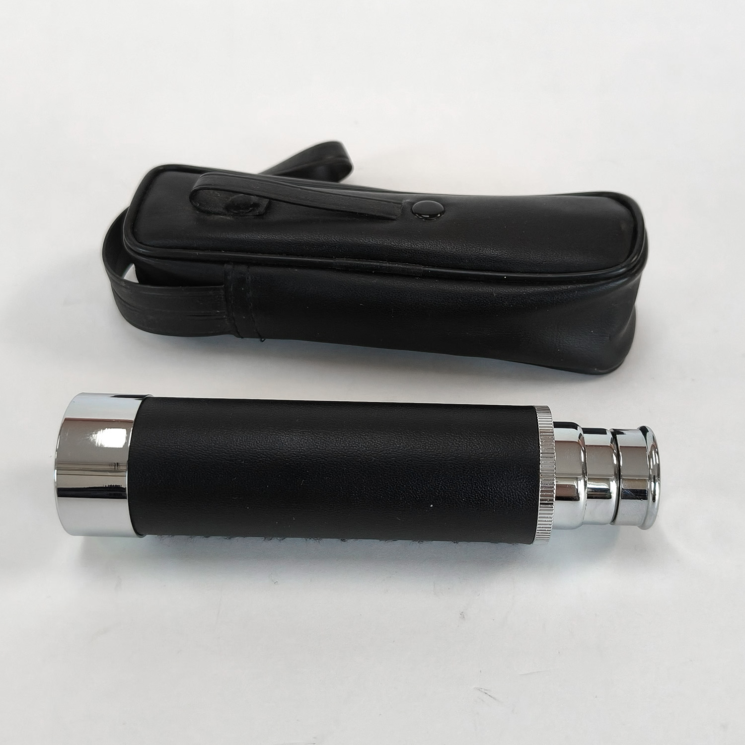 This listing is for a vintage chrome extendable 3-draw pocket telescope, complete with its original black carry case. This compact spyglass features a leather-style grip, three pull-out chrome sections, and a threaded objective end. It is lightweight, easy to carry, and ideal for quick viewing or as a decorative collector’s piece.