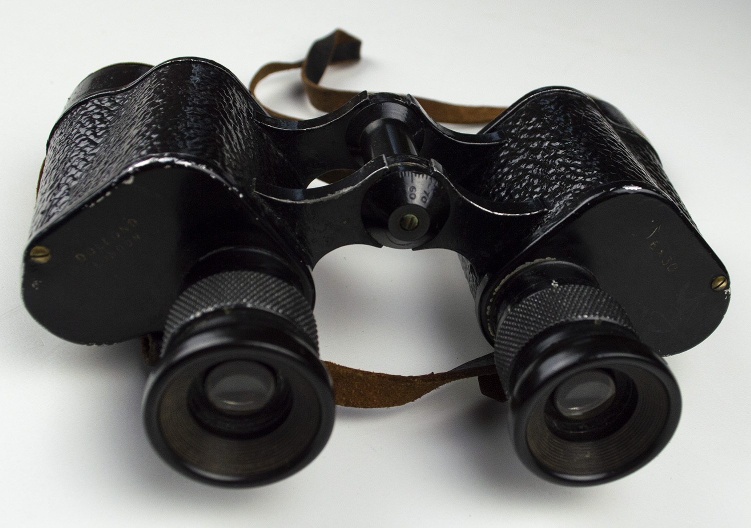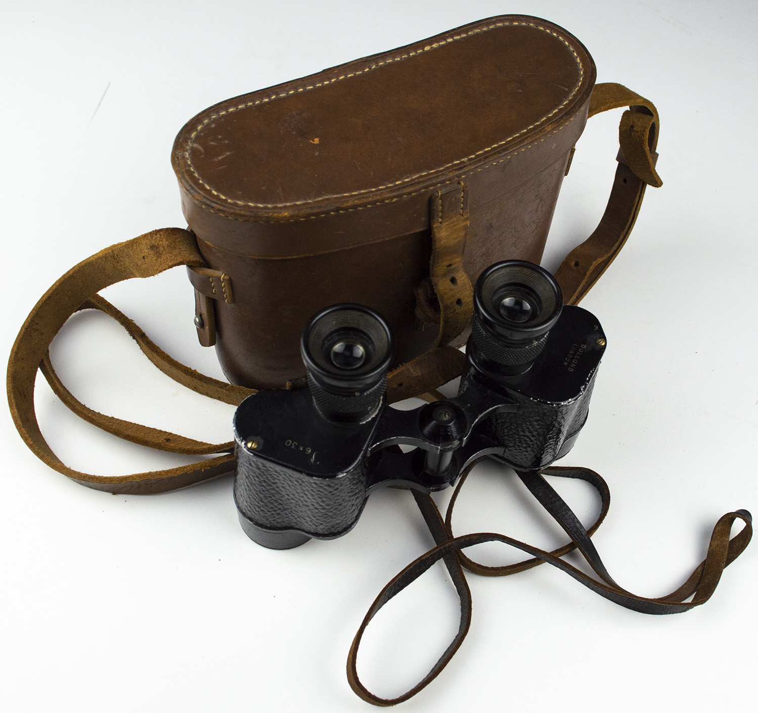 A pair of vintage British Dollond London 6×30 military binoculars in original leather case.