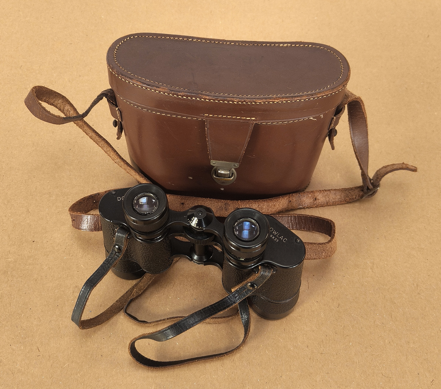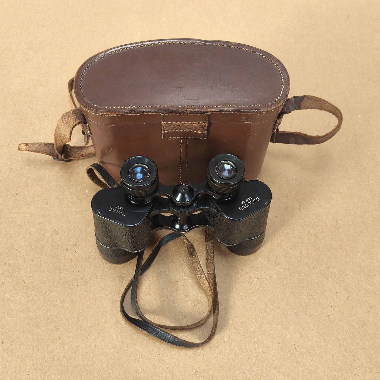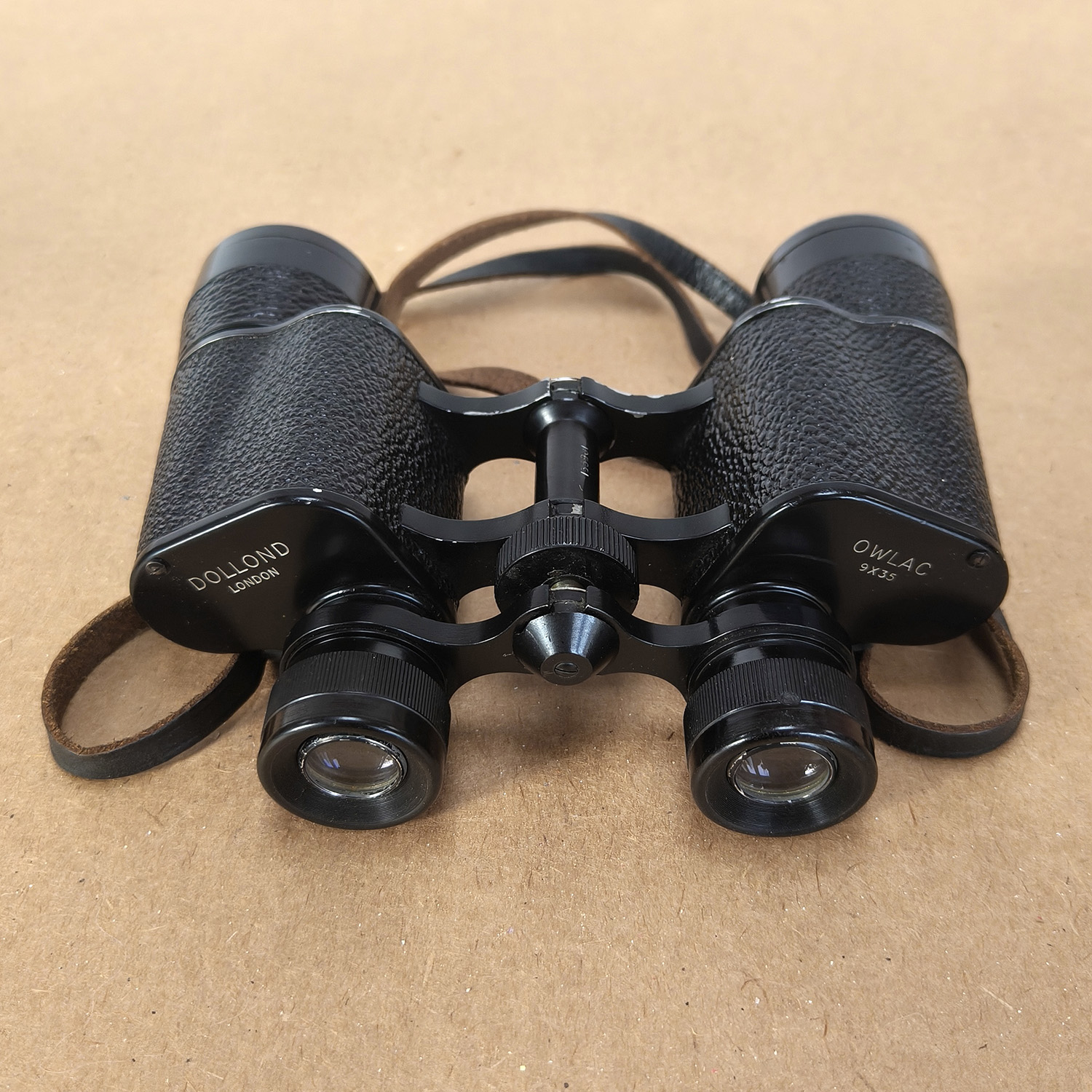 Beautiful pair of vintage Dollond London OWLAC 9×35 binoculars — a fine example of classic British optical craftsmanship from the mid-20th century. These binoculars feature a traditional leatherette finish, precision focusing, and come complete with their original leather carry case lined in red velvet.