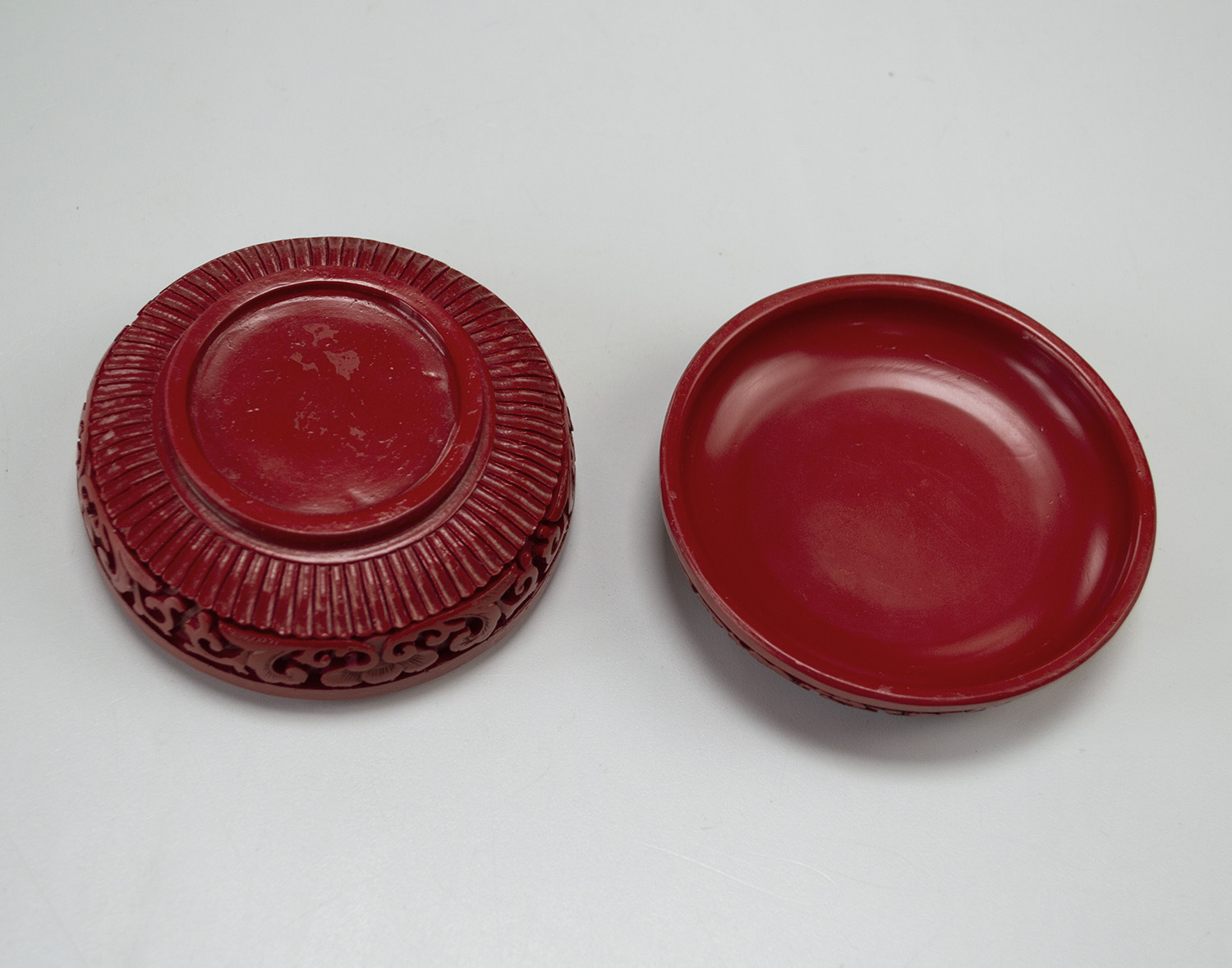 This a vintage hand carved cinnabar lacquer circular box, with detailed carvings to show mountains, trees and small boats sailing on water waves. Very good condition for its age.