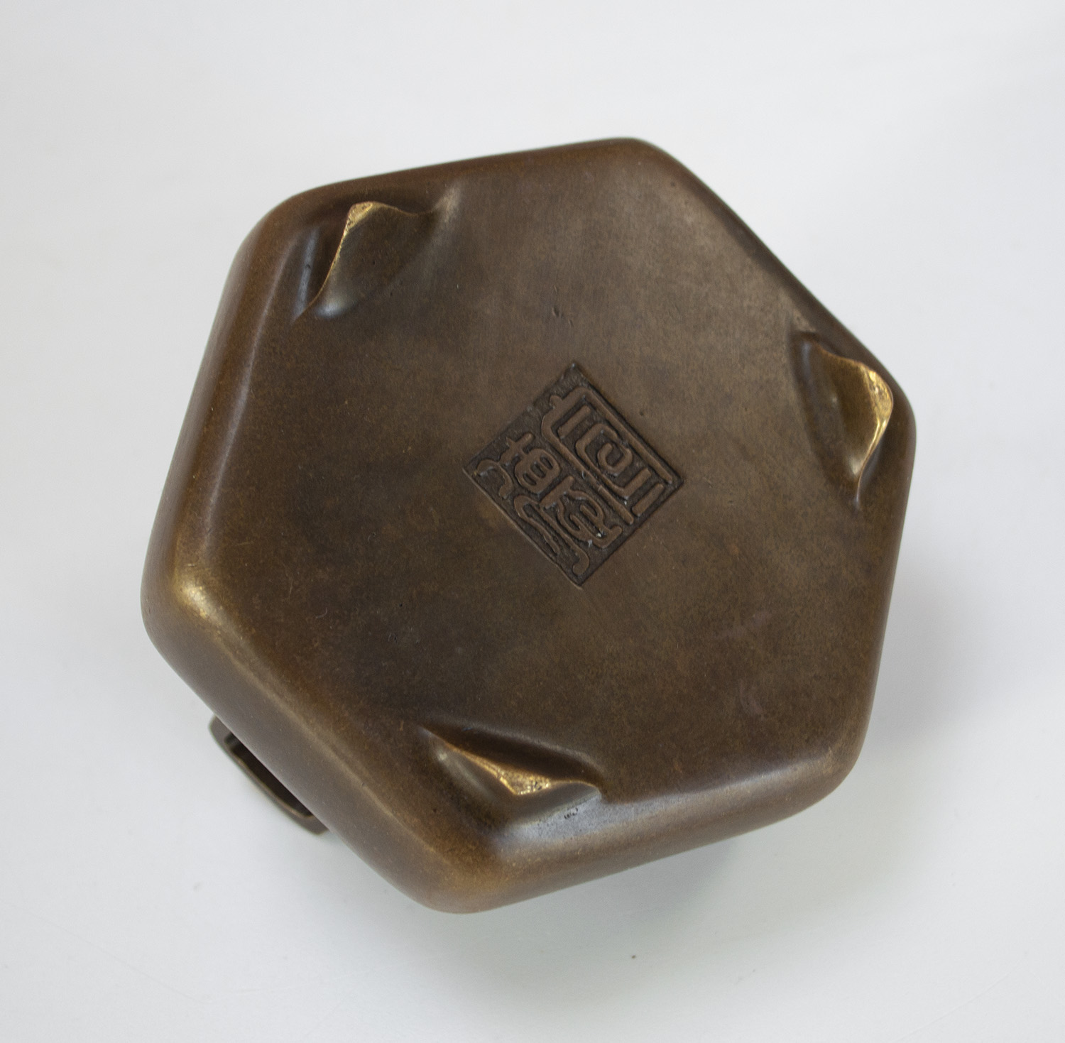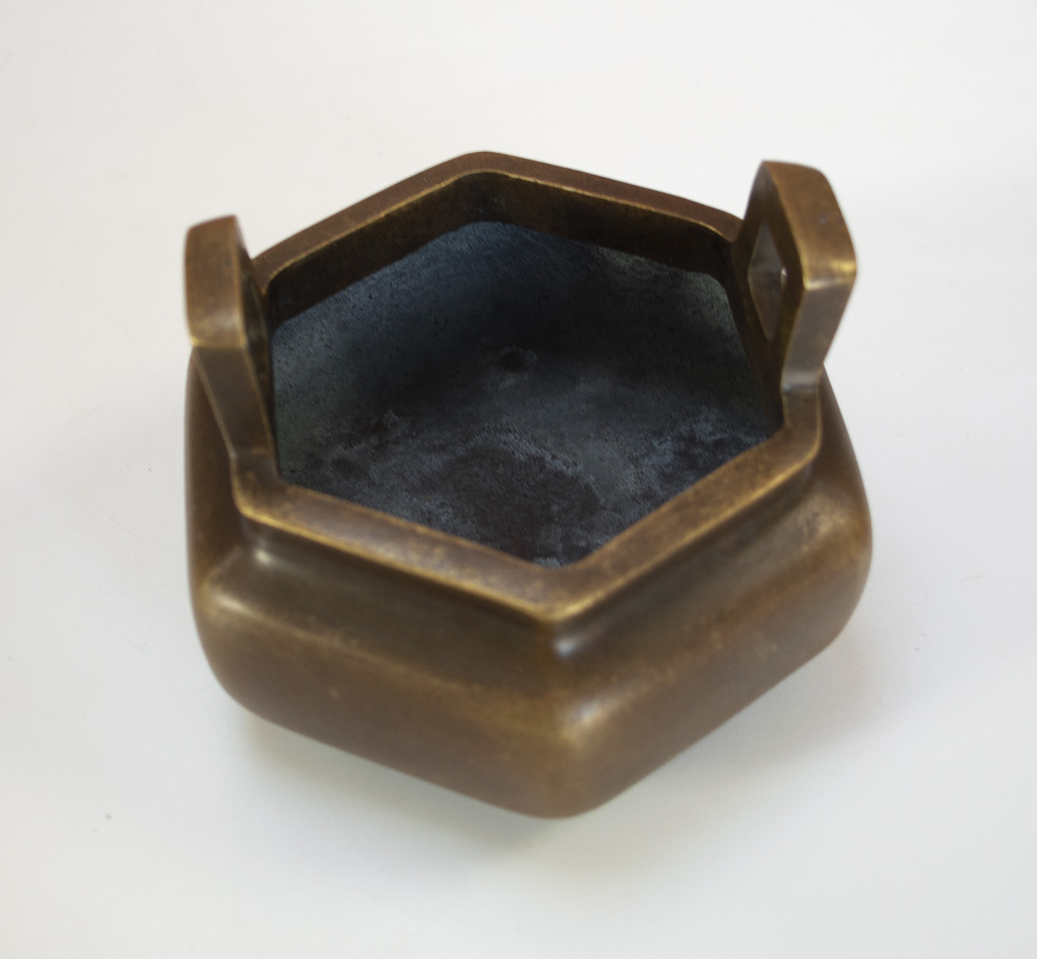 This an antique hexagonal red copper incense burner / censer with two handle / ears and three feet. Very good condition for its age.