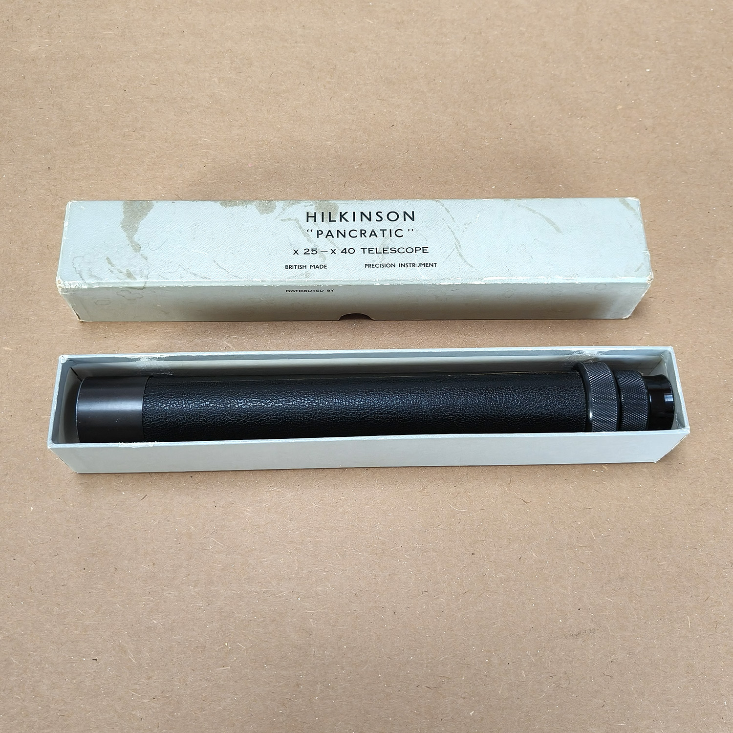 A high-quality vintage British telescope, marked “Hilkinson Pancratic x25–x40”, complete with its original presentation box. This is a genuine period optical instrument, not a modern reproduction.