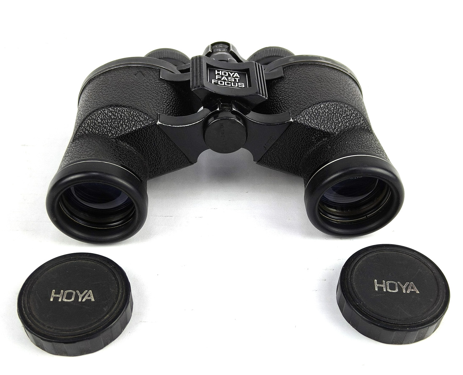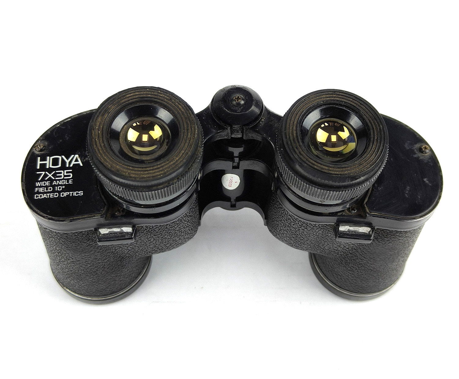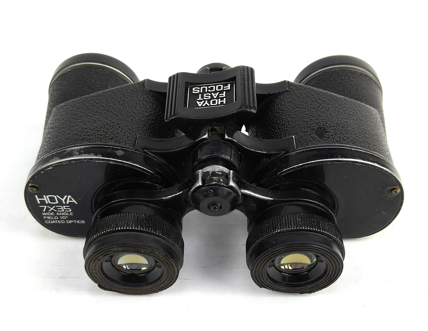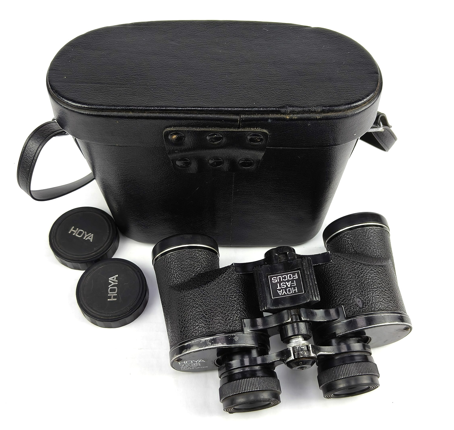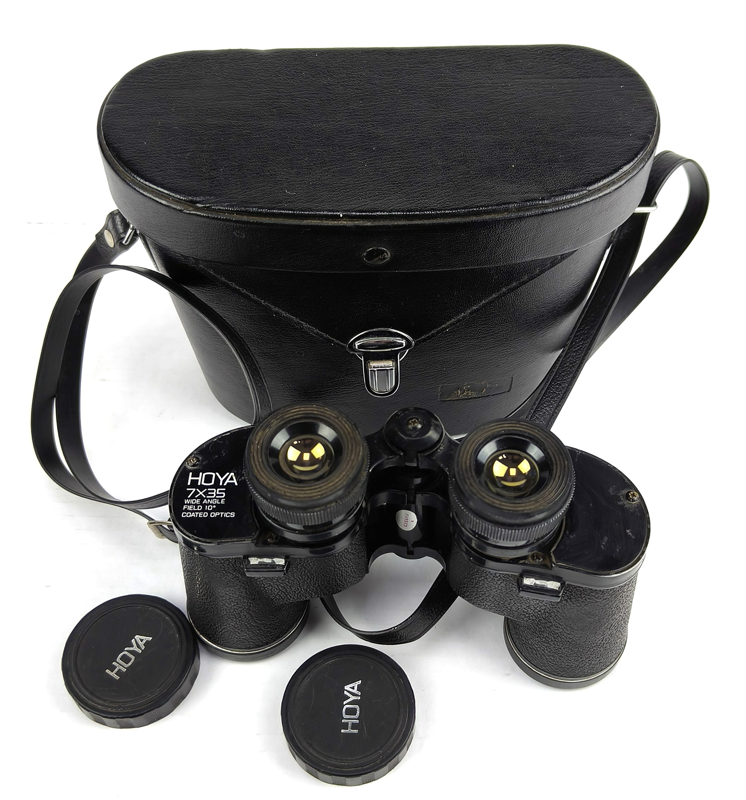 This is a classic pair of vintage HOYA 7×35 wide-angle binoculars, made in Japan, complete with original leather carry case and HOYA lens caps.