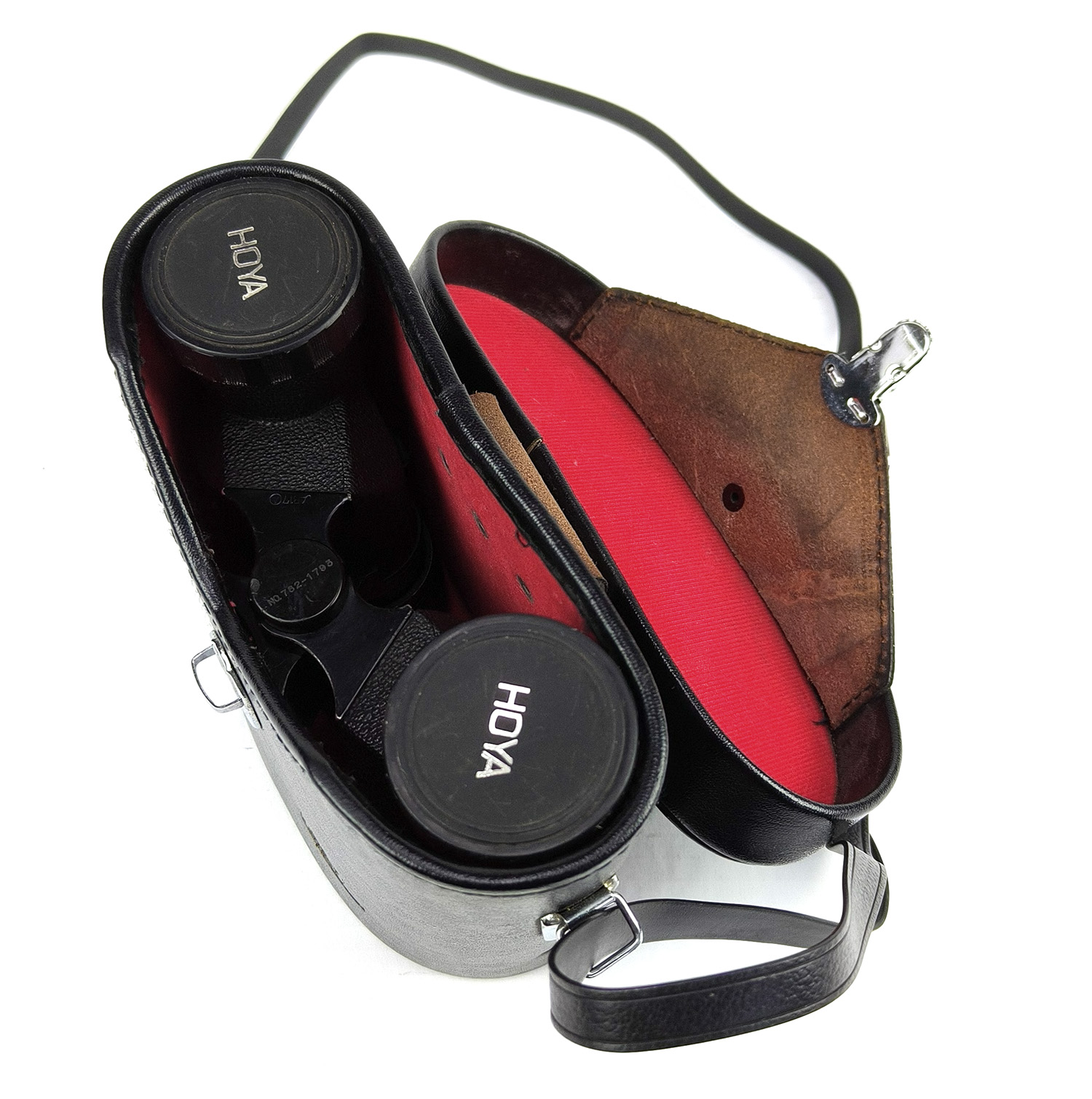 • Includes: Original hard leather case with red lining and shoulder strap, HOYA-branded objective lens caps