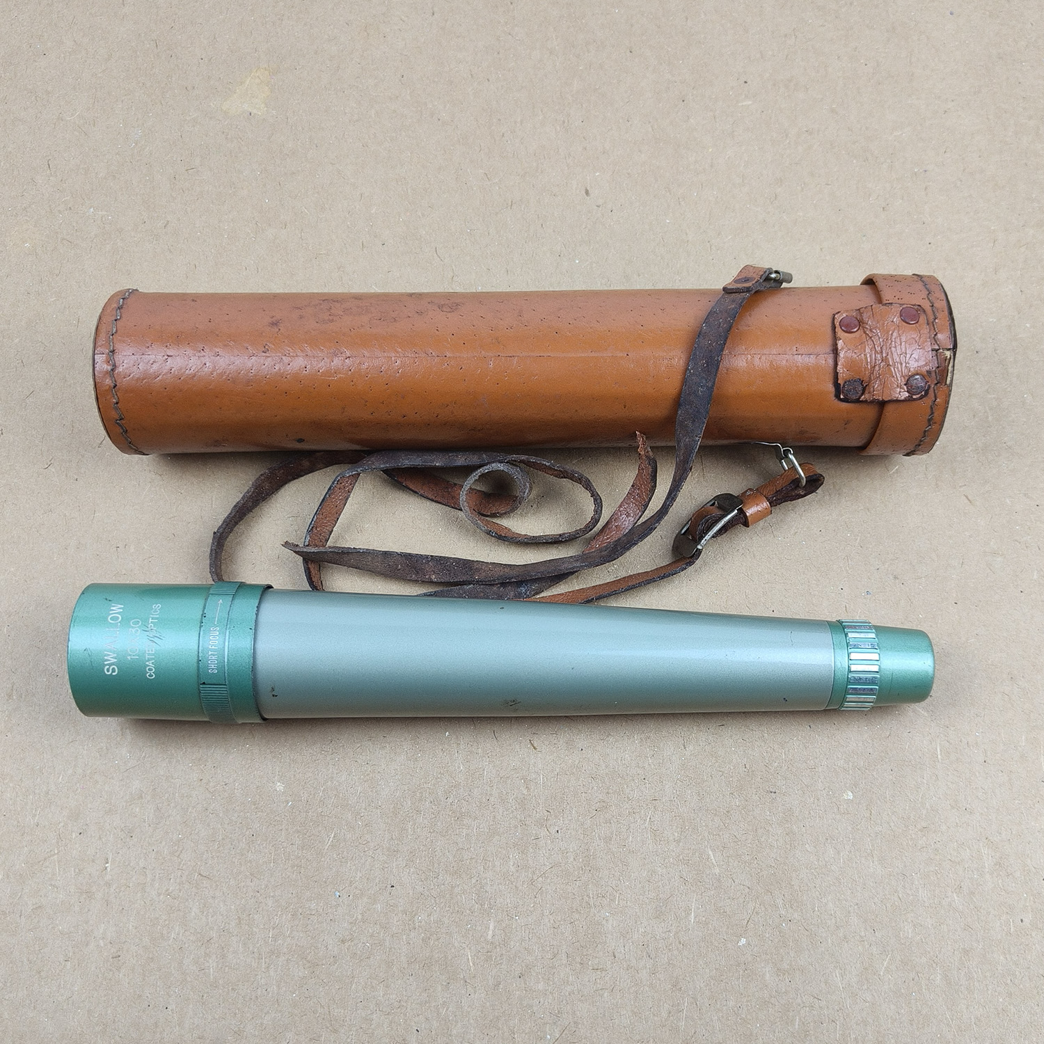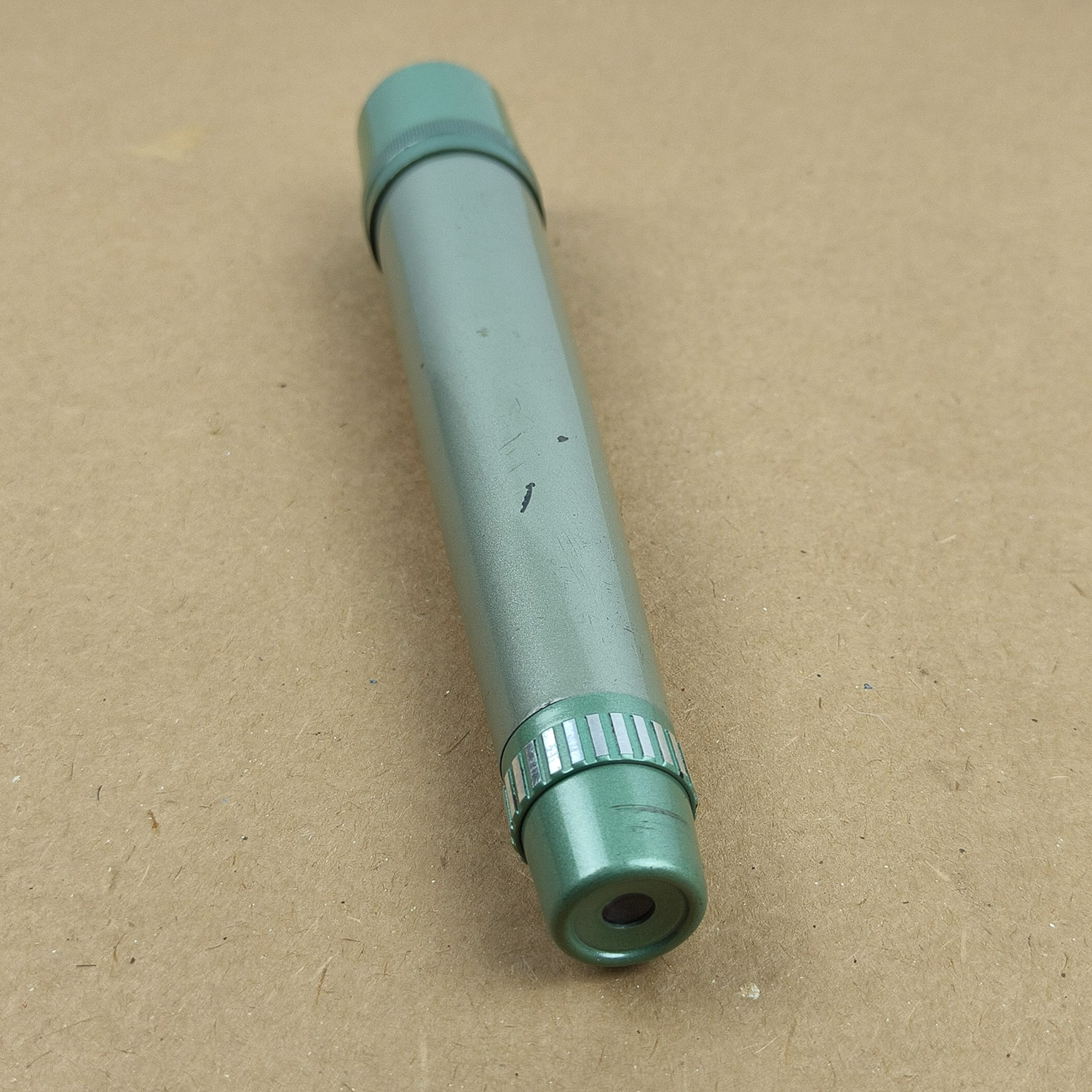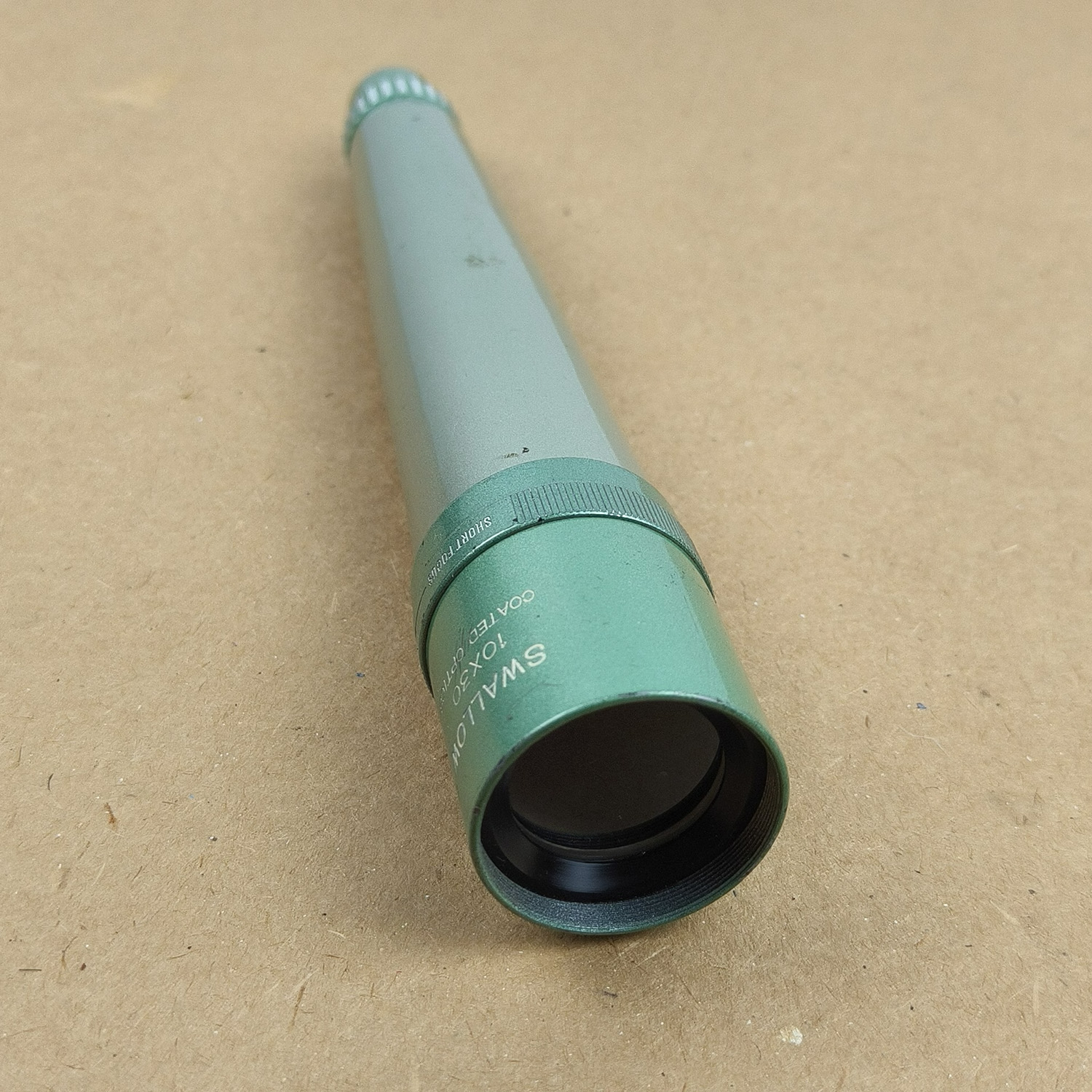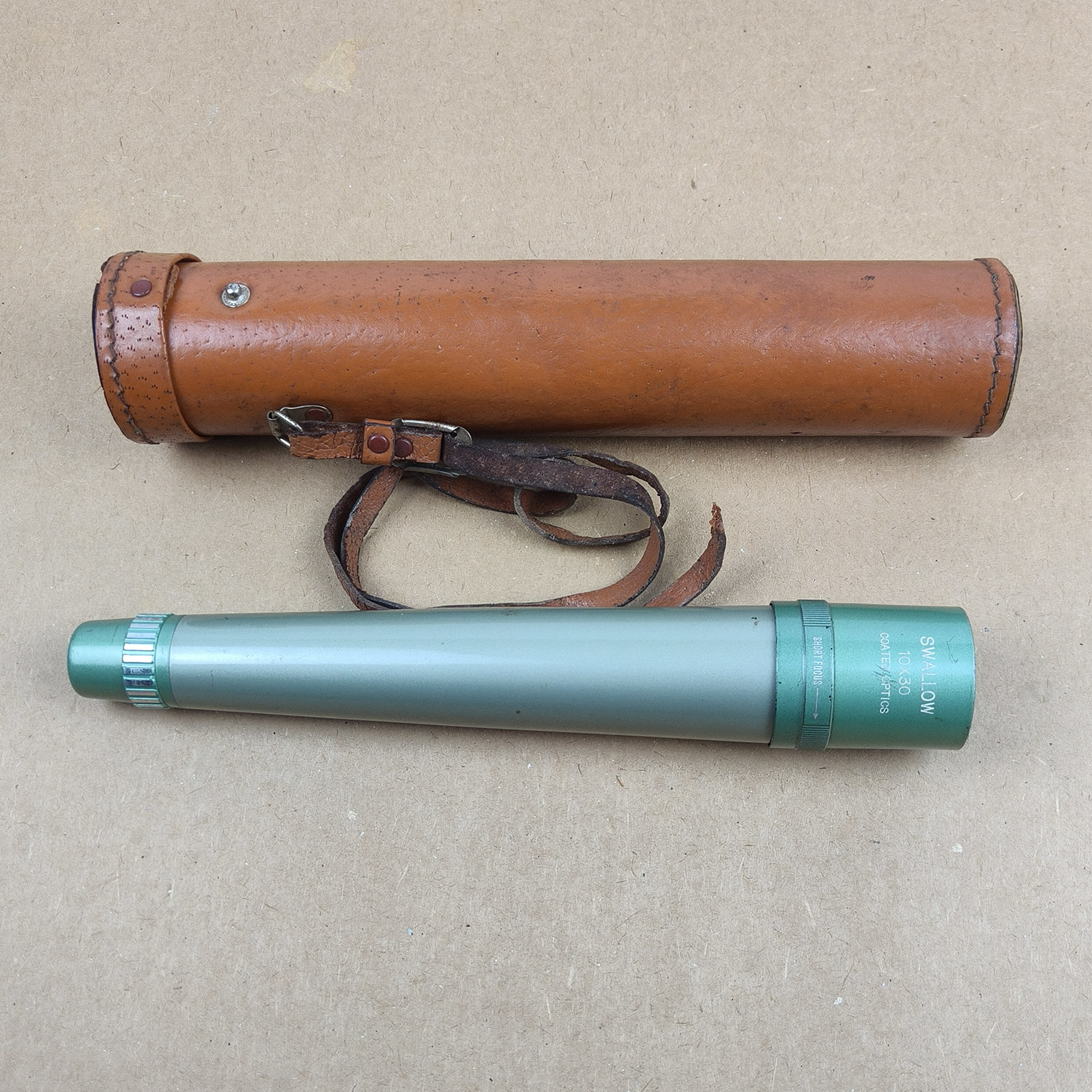 For sale is a vintage Swallow 10×30 monocular, finished in an attractive green enamel body and marked “Coated Optics”. This is a well-made Japanese monocular, compact and solid, with a smooth focusing mechanism and bright image for its size.