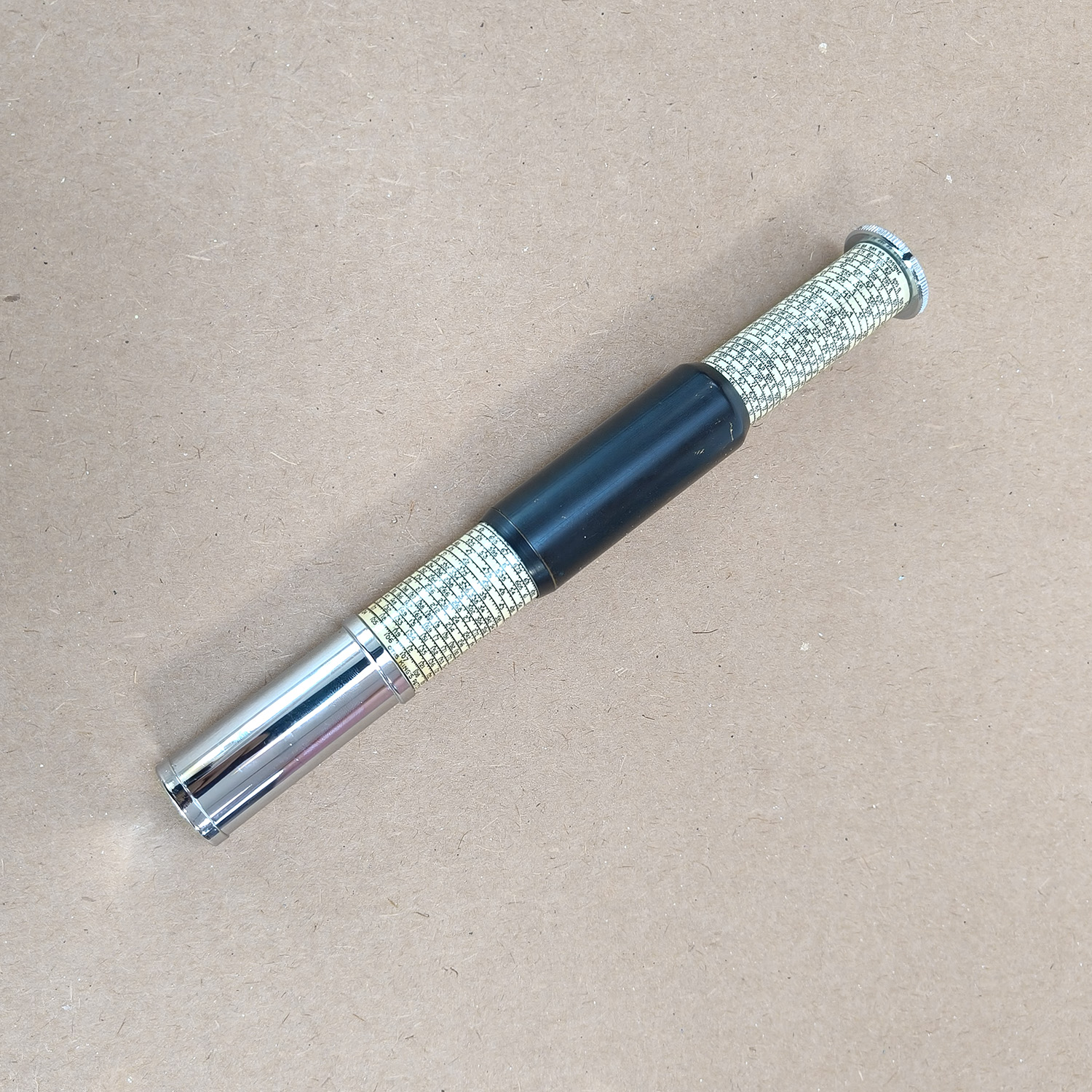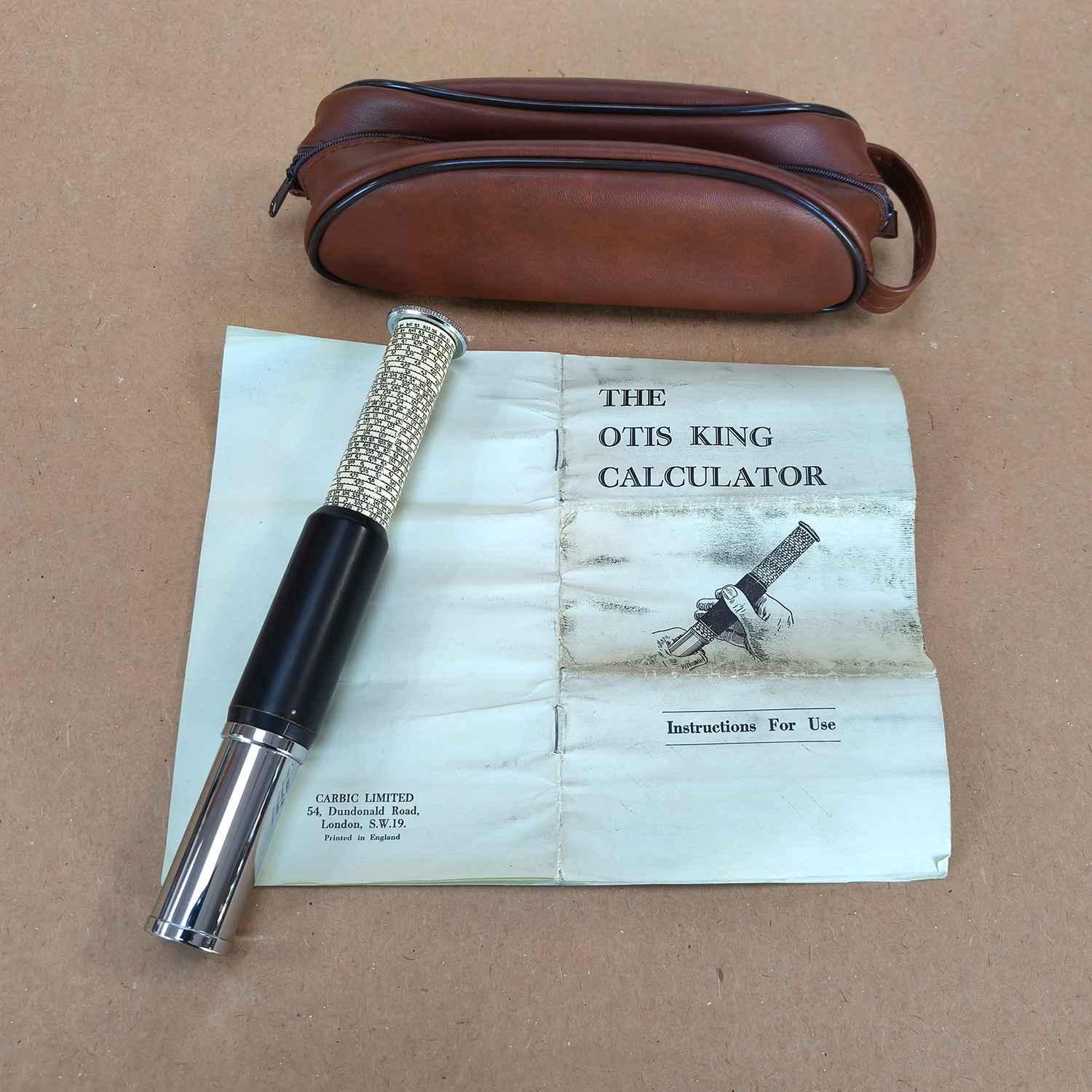 For sale is a Vintage Otis King’s Patent Pocket Calculator, Model L, complete with its instruction leaflet. Made in England by Carbic Limited, this is a classic cylindrical slide rule, widely used from the 1920s–1960s by engineers, navigators, surveyors, and scientists for performing rapid mathematical calculations long before electronic calculators existed.