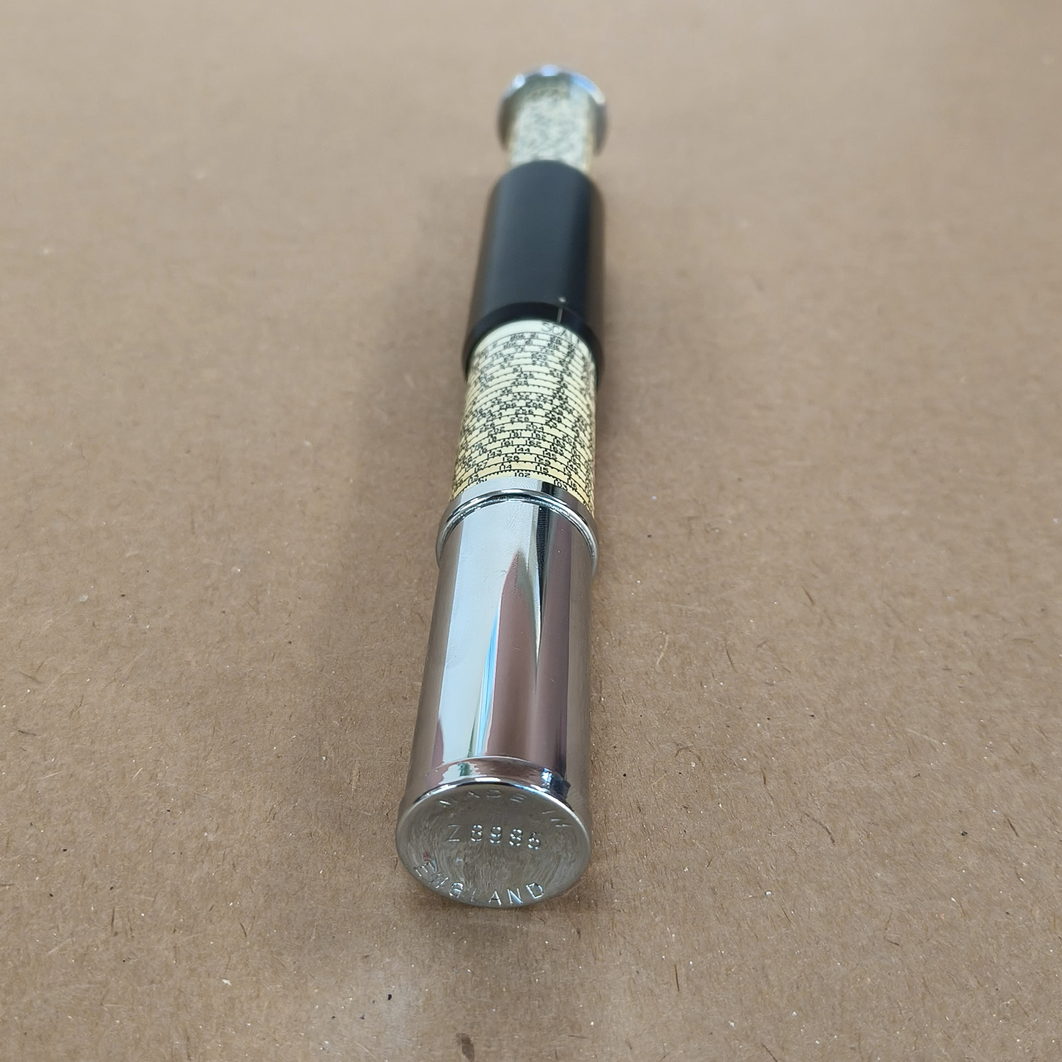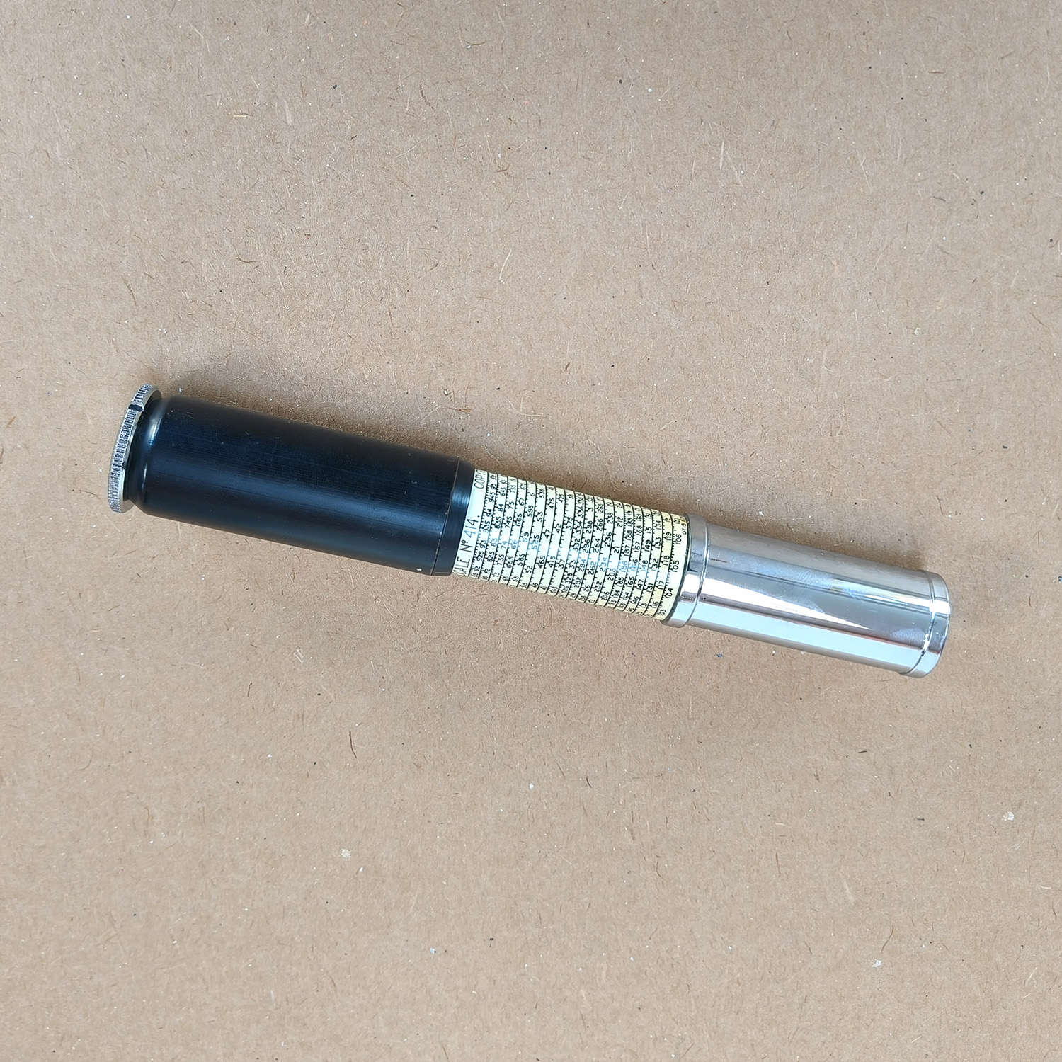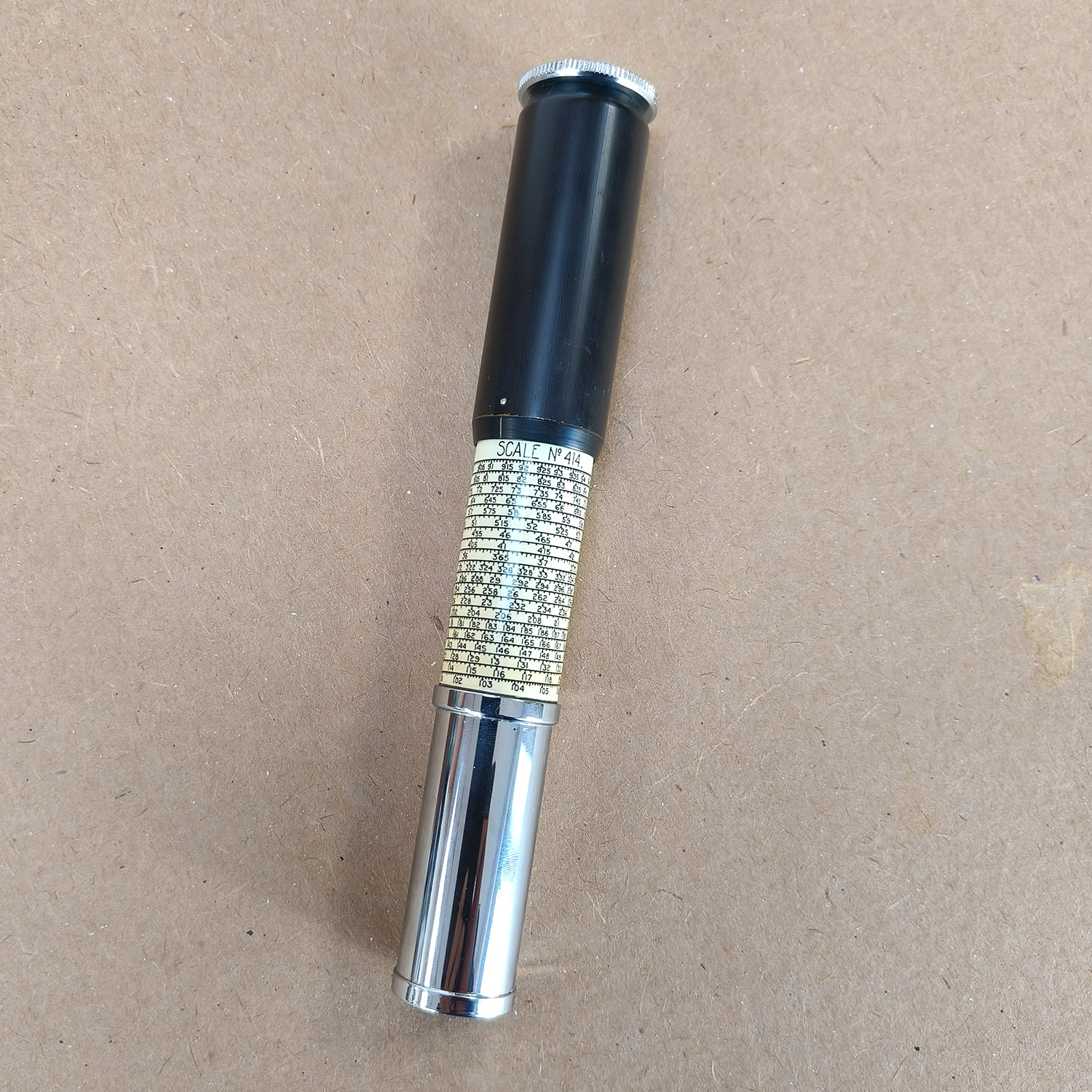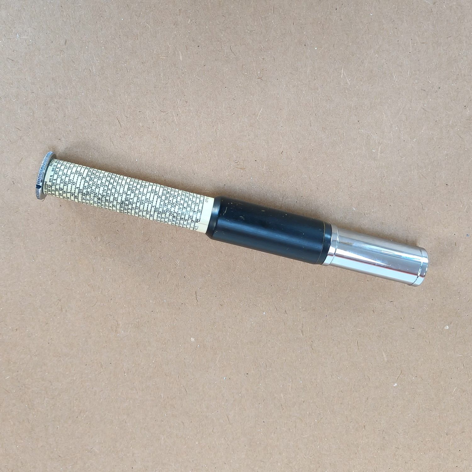 - Material: Chrome-plated metal with printed logarithmic scales