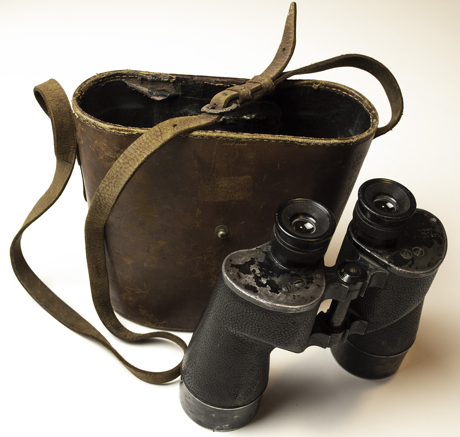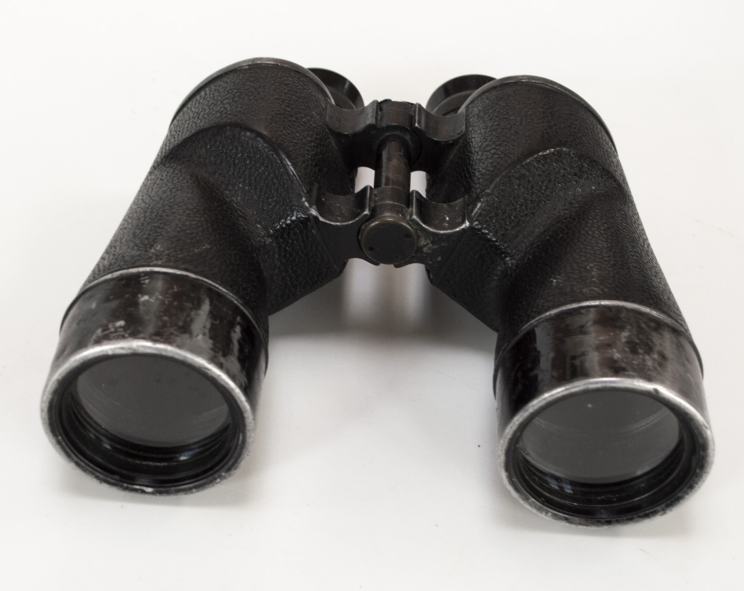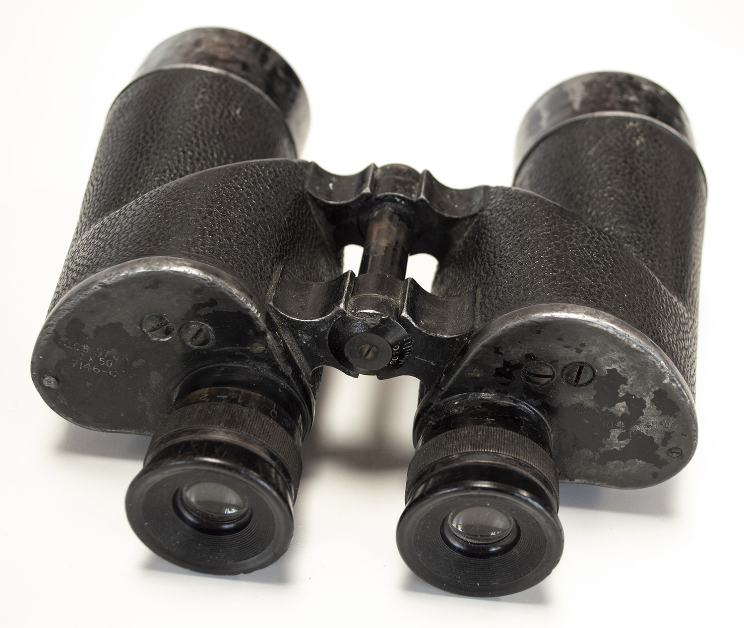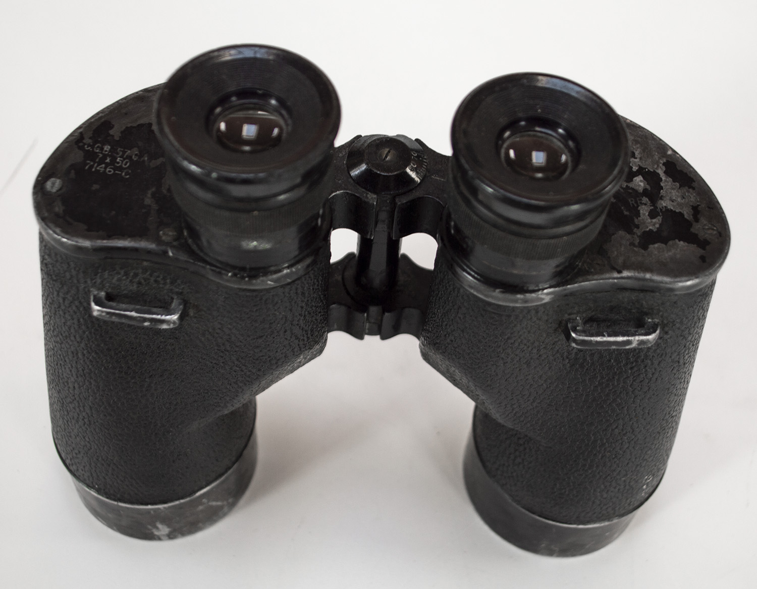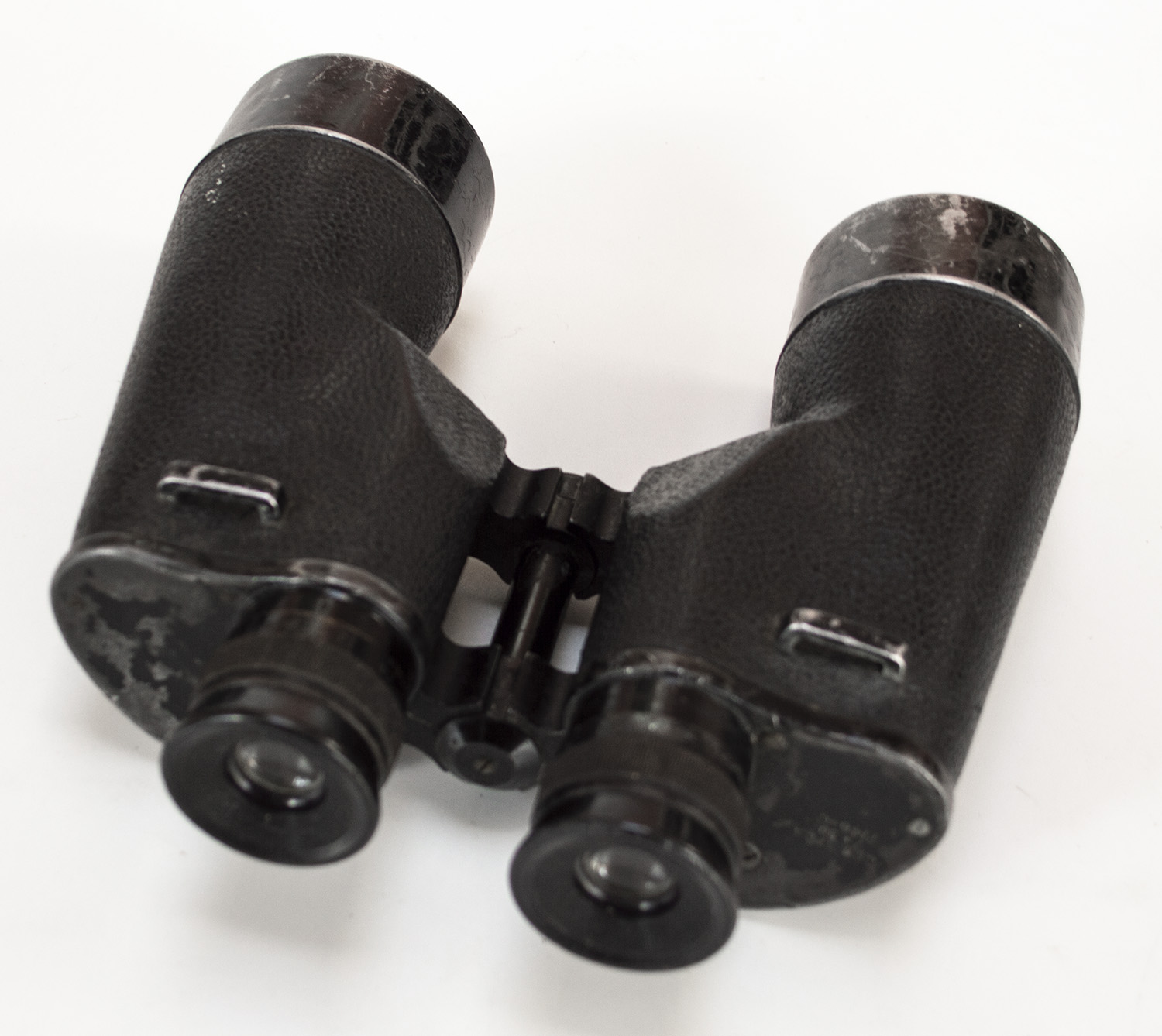 A good pair of vintage WWII Canadian 1944 dated REL 7×50 military binoculars with leather case (the case cover is missing). The binoculars are in overall good working condition.