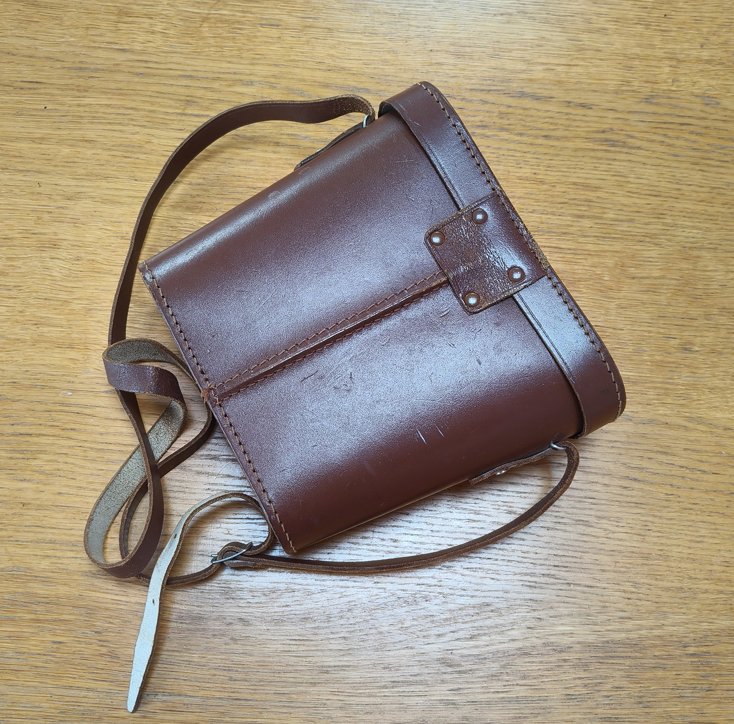 • Leather strap attached; case stitching and clasp are secure.