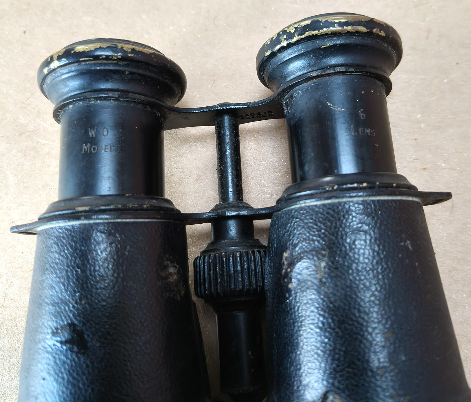 A pair of vintage W.O Model binoculars (6x magnification), made in France. These classic binoculars feature a traditional black leatherette body and metal construction, with a charming aged patina that reflects their many decades of history.