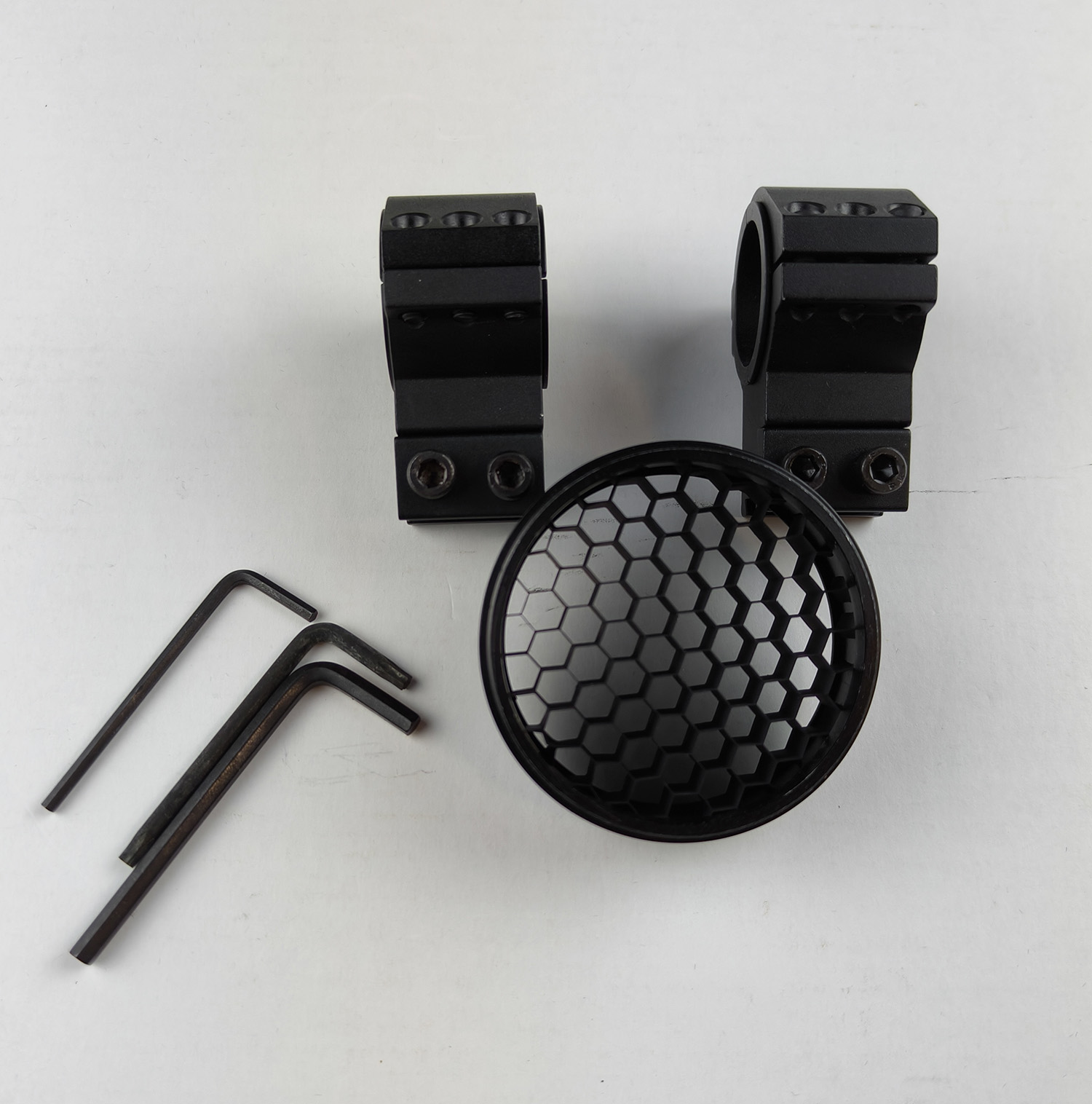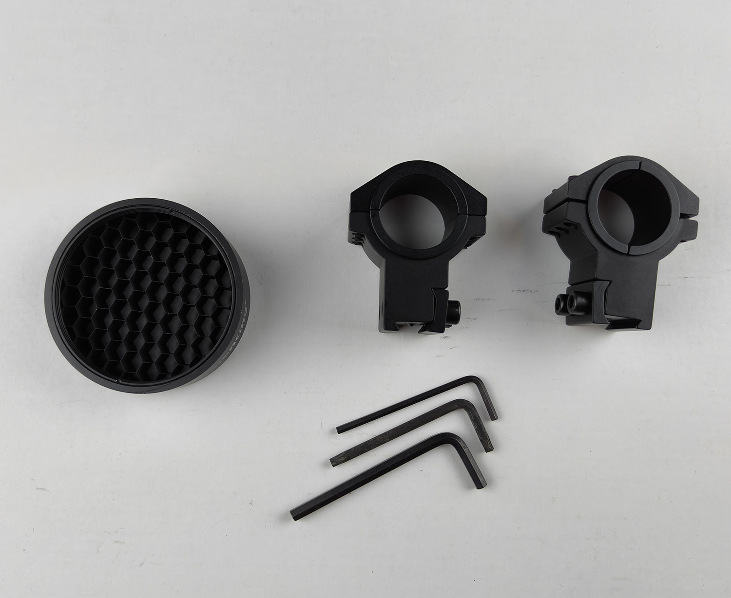 Package includes: the rifle scope with lens caps, a pair of rifle scope mounts, honeycomb sunshade, lens cleaning cloth, user manual. All packaged in original colour print box.