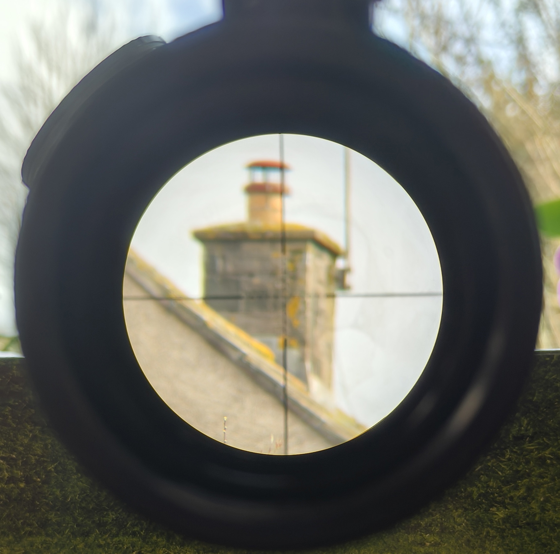 Note: For this particular scope, there appears to be some stain on the Reticle film, but this is more noticeable when you look into the scope rather than a distant target. It becomes less noticeable while looking at a distant target which is well focused, and it does not seem to affect the target aiming (as shown in the last two pictures). Nevertheless, for this reason and for shop clearance, this scope is offered for sale with less than half of its market price.