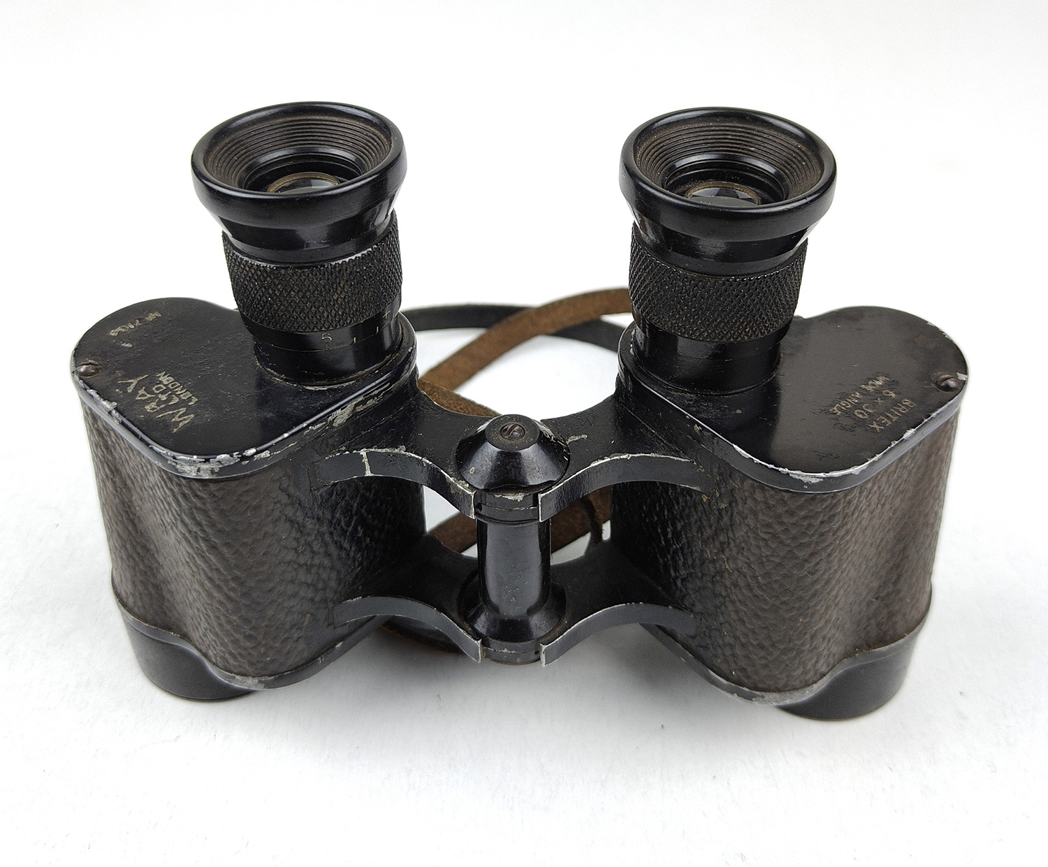 A pair of rare vintage British Wray London Britex 6×30 military binoculars in original leather case. Serial number: 7104